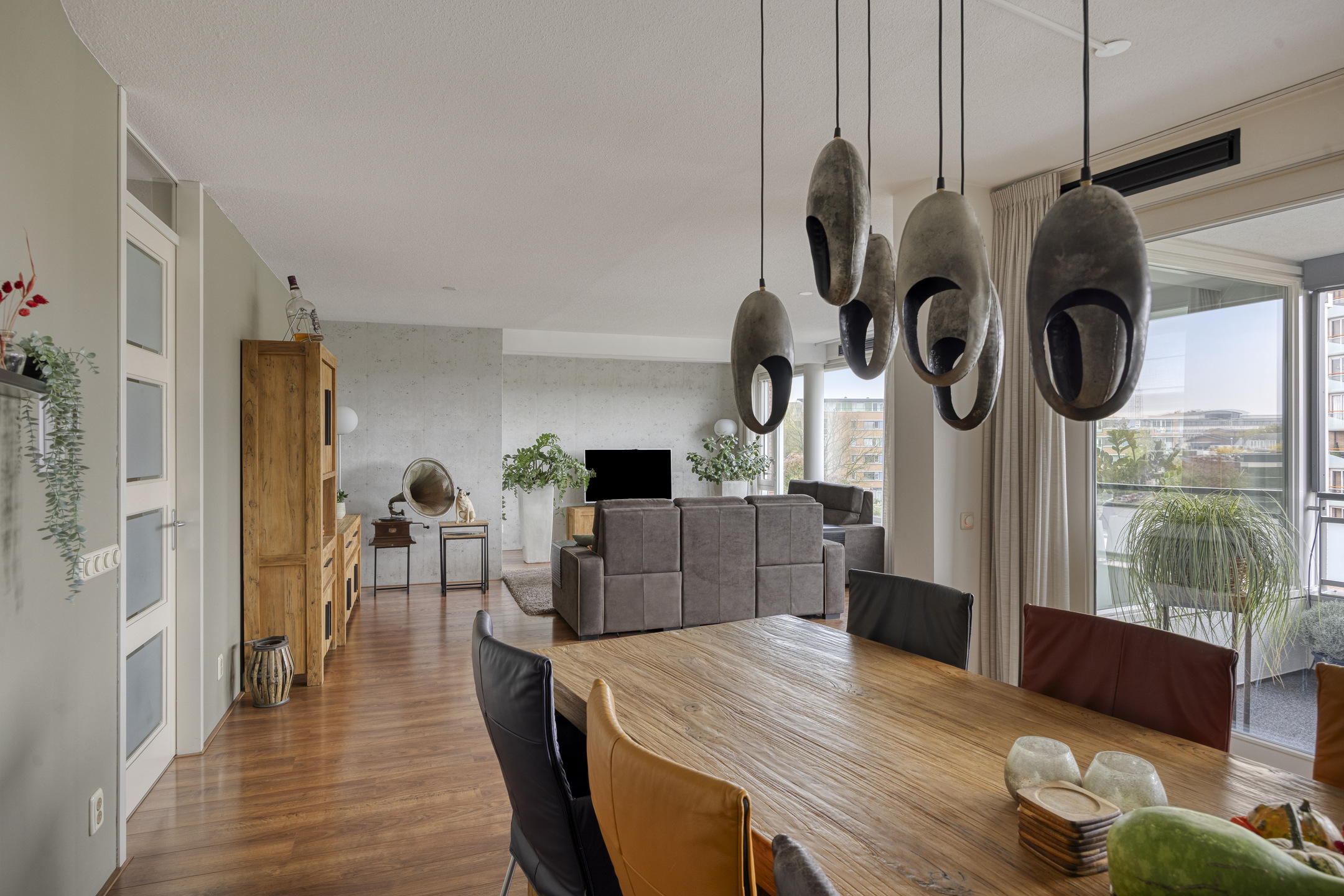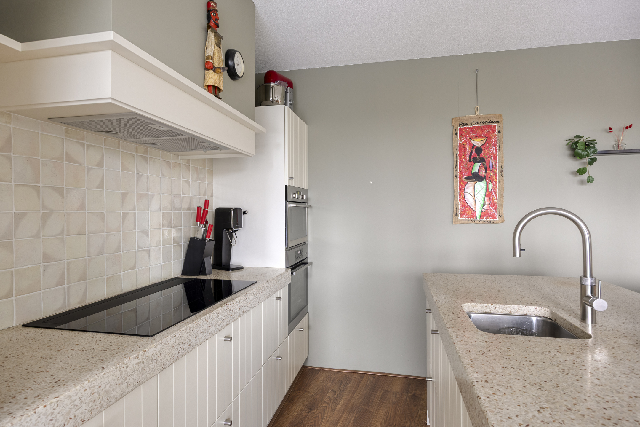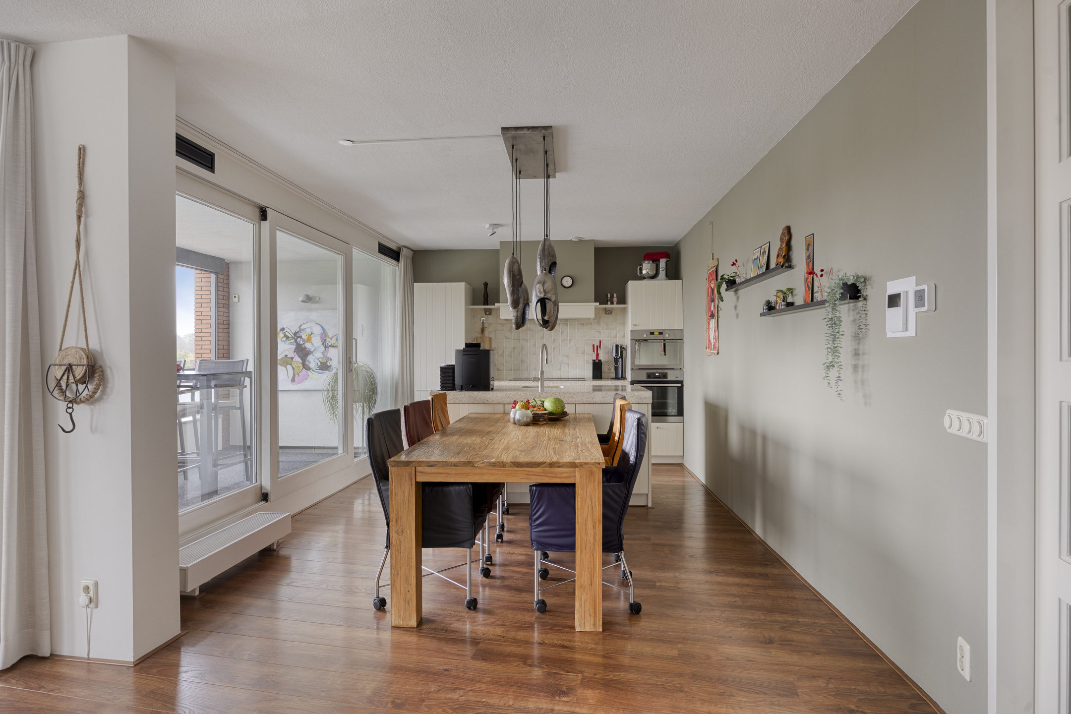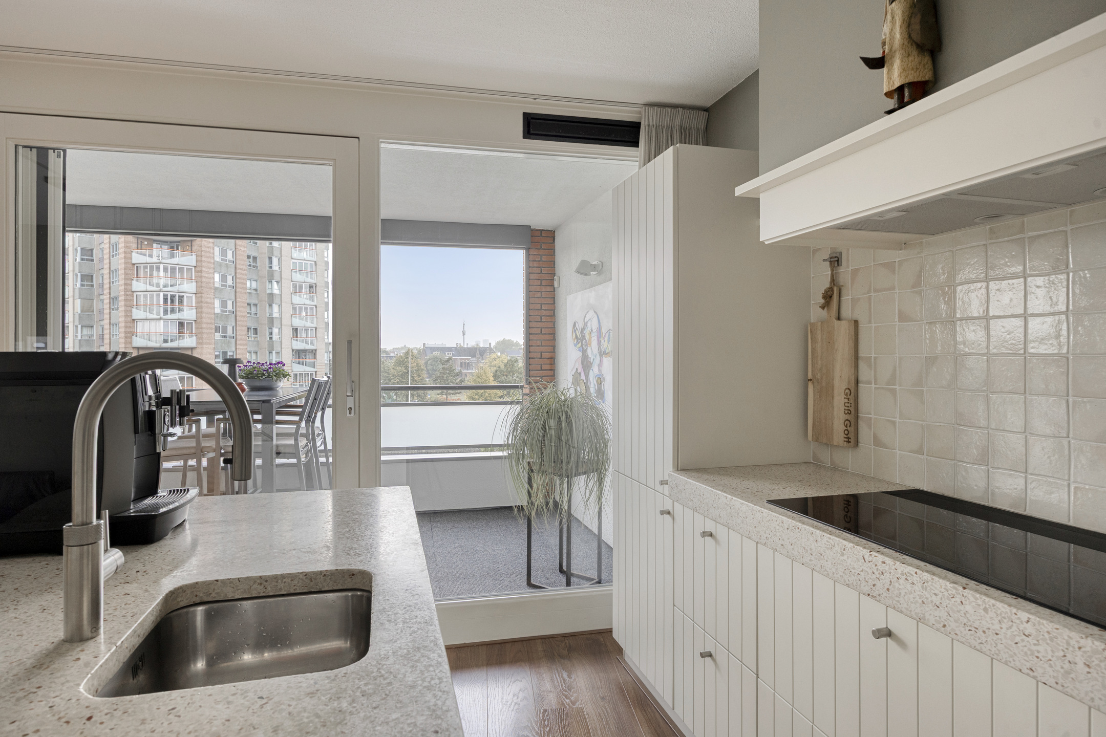 De royale woonkamer met erker heeft veel lichtinval en een schitterend uitzicht over het centrum van Apeldoorn en het Apeldoorns kanaal. Open keuken met eiland welke is voorzien van inbouw vaatwasser (2024), quooker, kookplaat inclusief downdraft afzuiging (2025) en een koel-/vriescombinatie (2025). Schuifpui naar ruim en zonnig inpandig balkon gelegen op het ZuidWesten met fraai uitzicht.