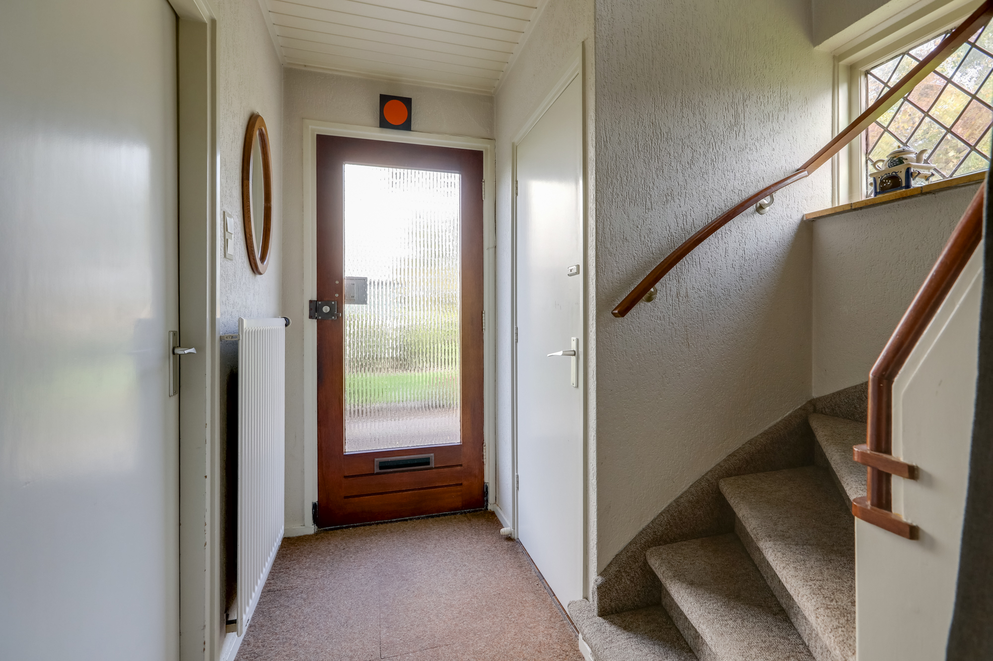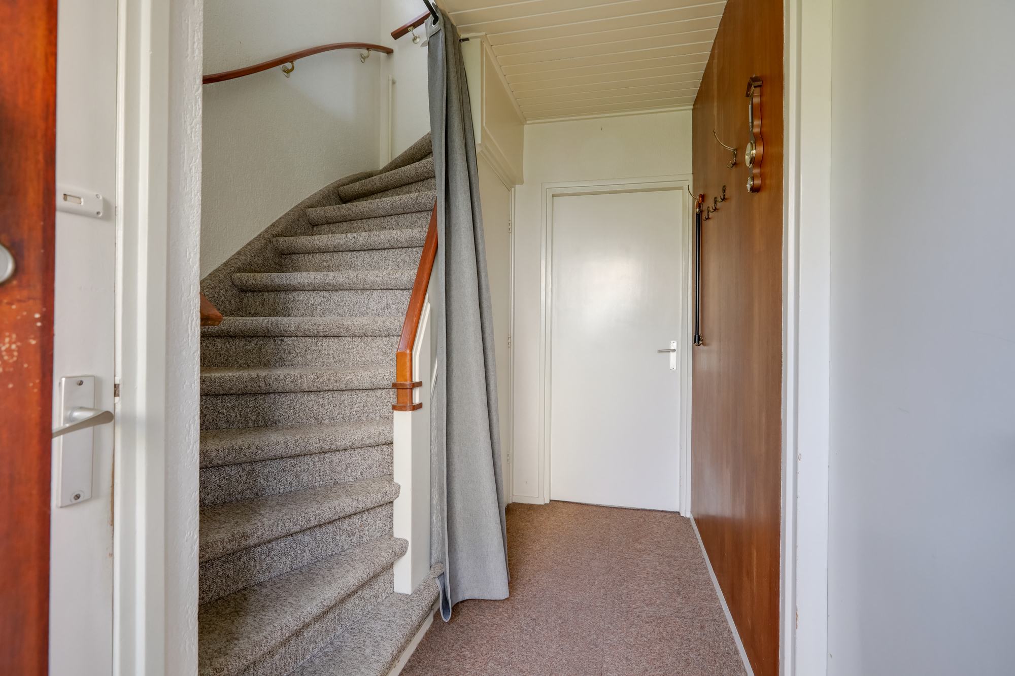 Je komt binnen via de entree met hal, waar zich de meterkast met automateninstallatie en 3 fasen, toilet met fontein en de toegang tot de kelder bevinden.