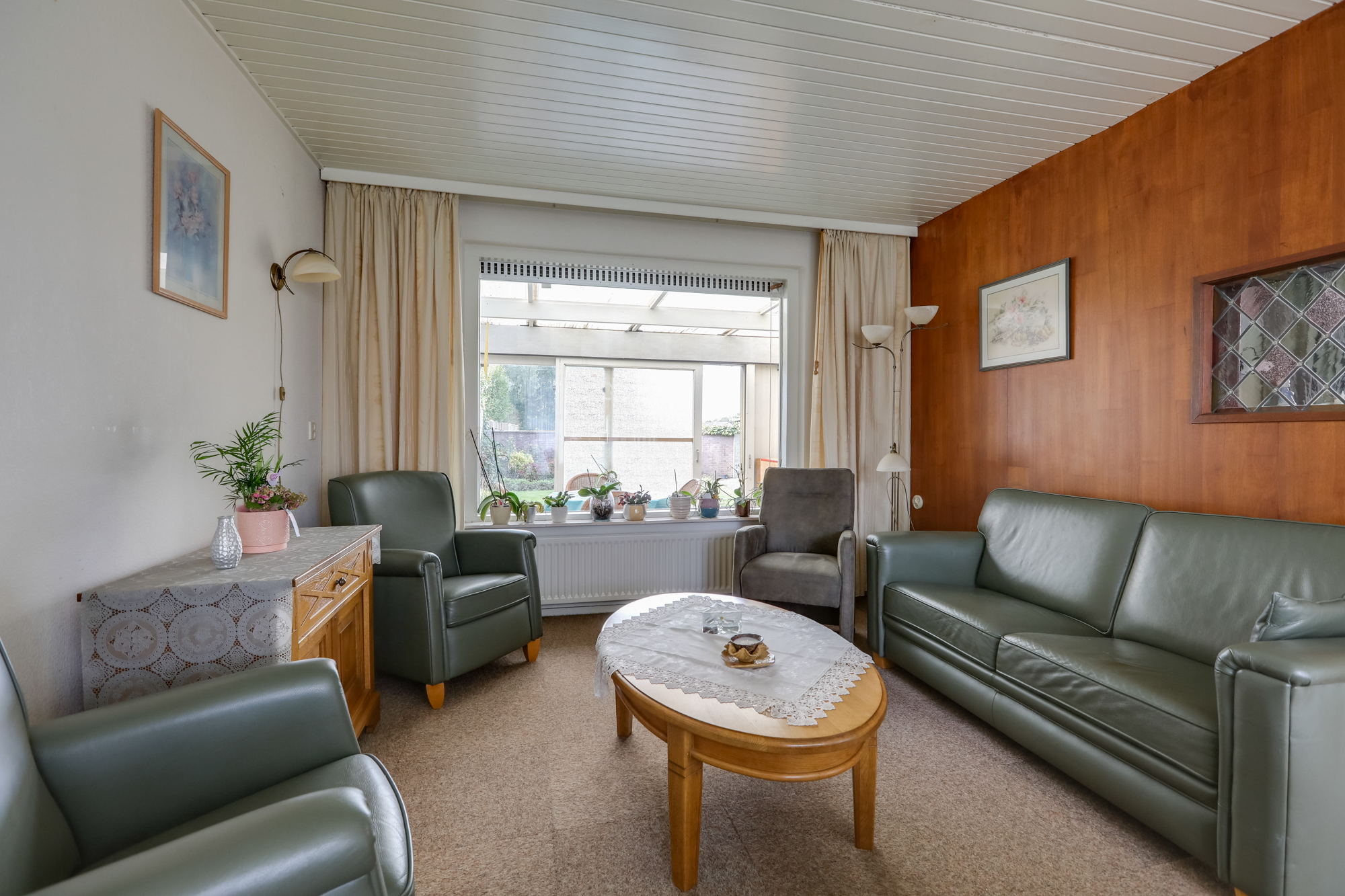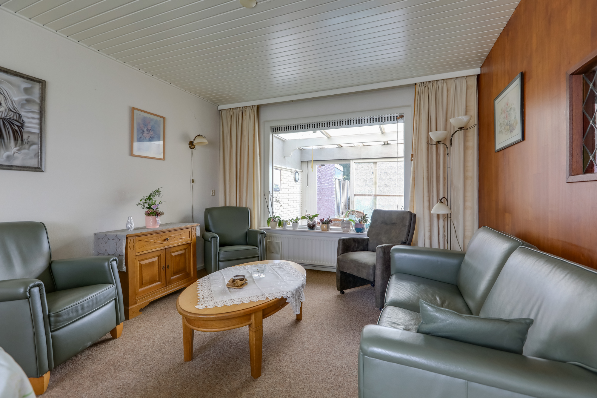 De lichte woonkamer biedt mogelijkheden voor uitbreiding door de reeds aanwezige serre. De nu nog dichte leef-keuken biedt ruimte voor een eettafel, de aanwezige keukenopstelling met koelkast, magnetron en inductiekookplaat is eenvoudig te noemen.