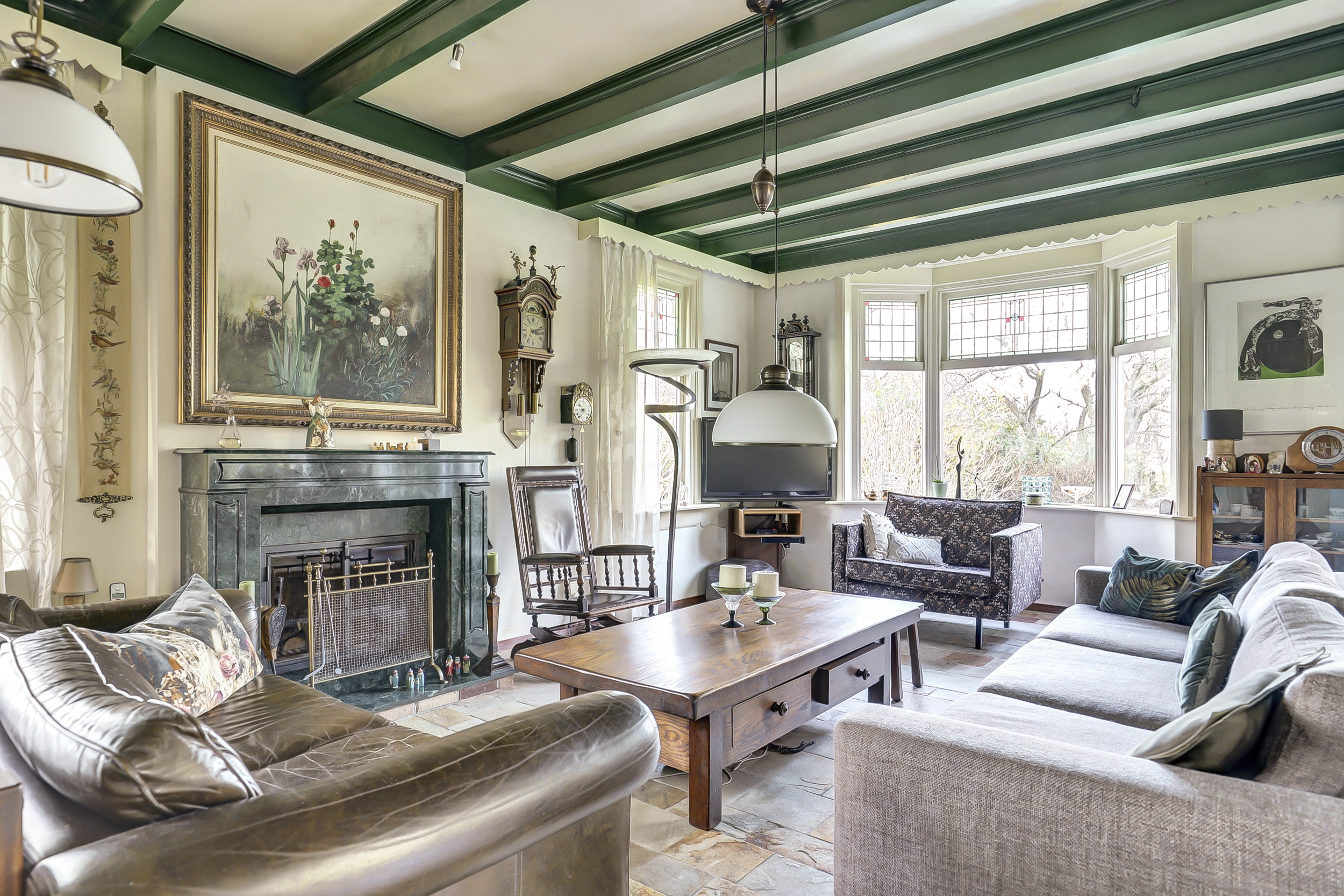 – Grote woonkamer met open haard en veel lichtinval