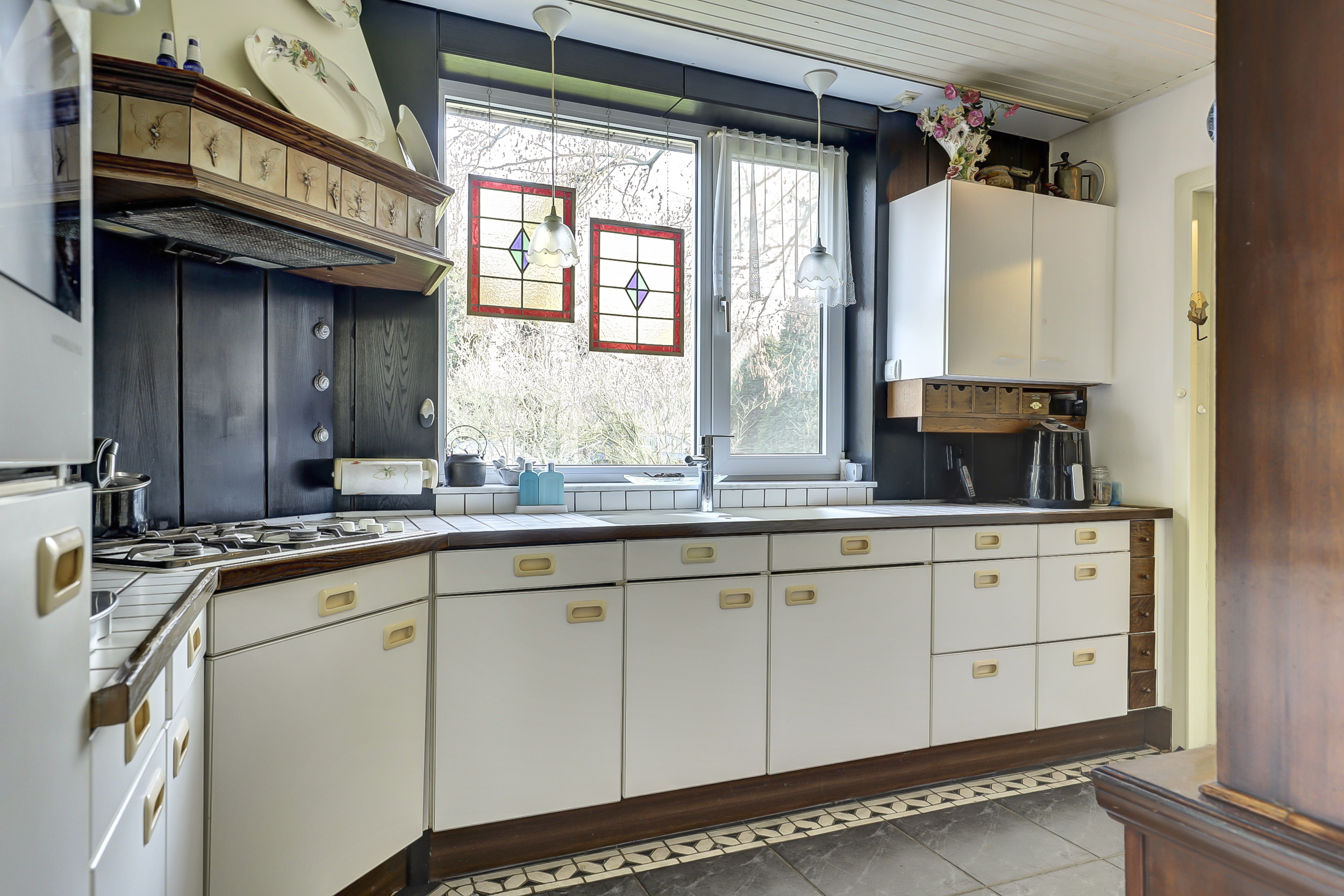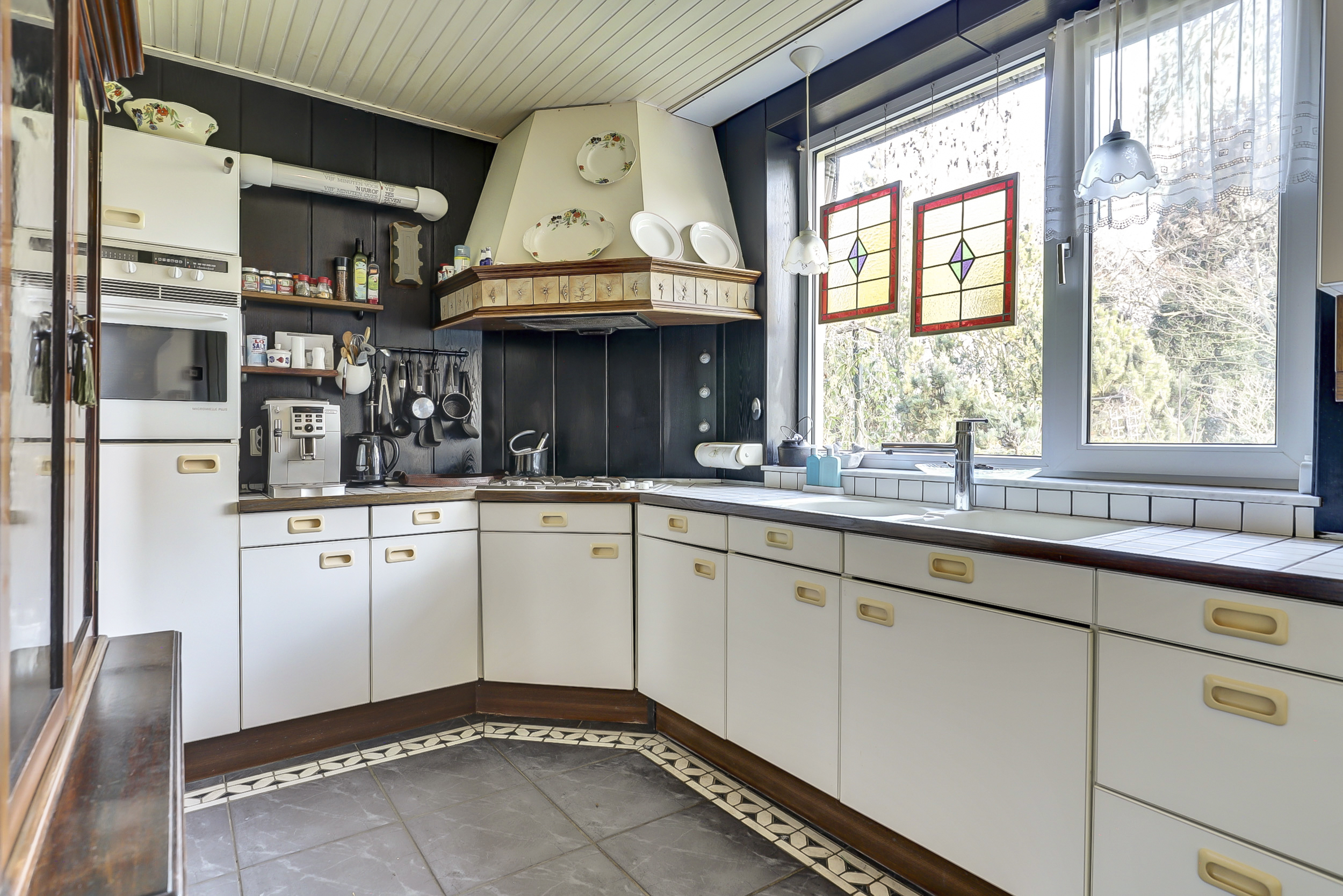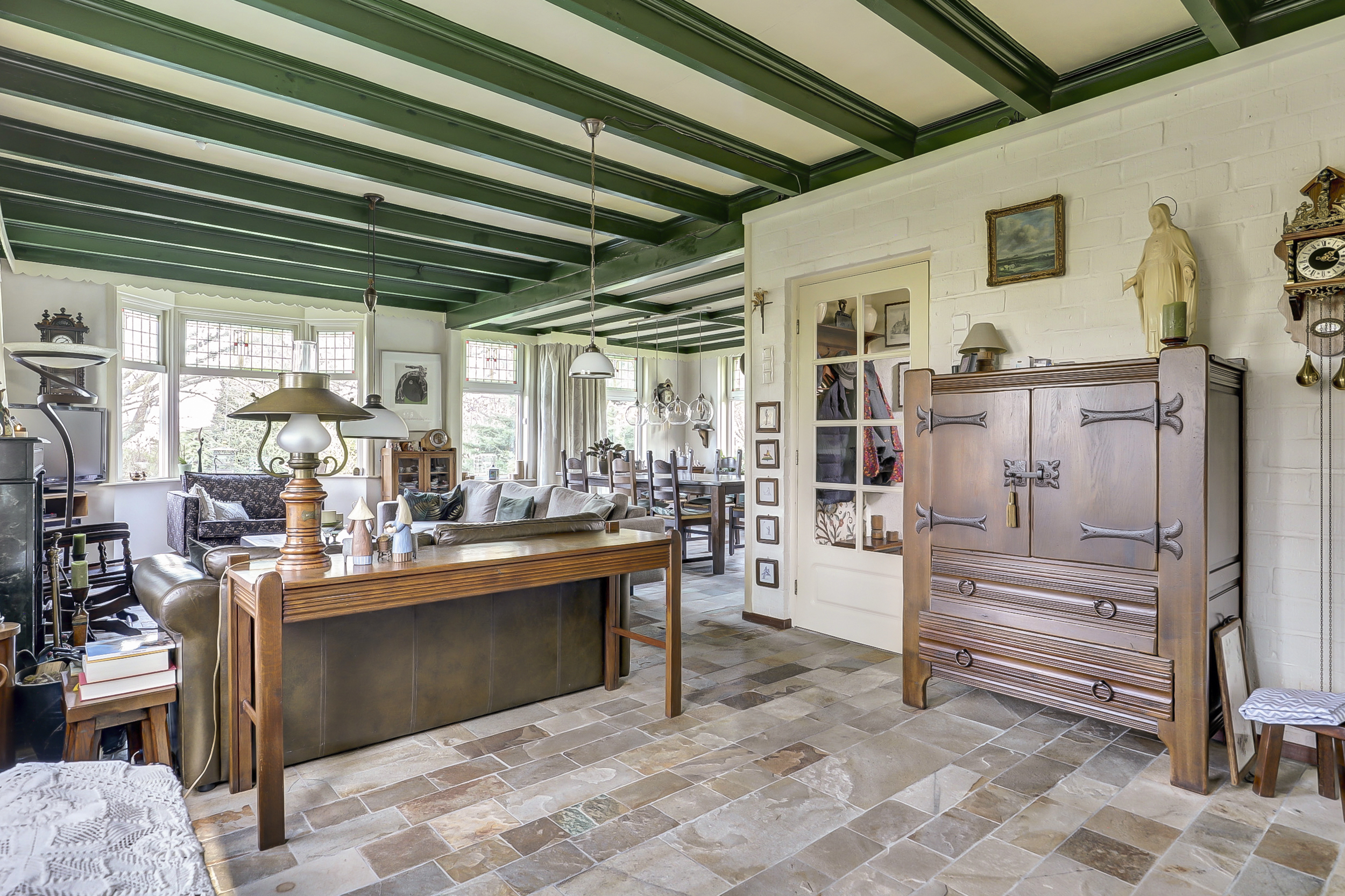 Via een tussenhal met trapopgang bereikt u de woonkamer van bijna 50 m². Deze is opvallend licht dankzij ramen aan drie zijden en heeft een natuurstenen vloer met vloerverwarming, een open haard met natuurstenen schouw en een karakteristiek balkenplafond. De glas-in-lood ramen versterken de uitstraling van de woning en zijn allen in dubbelglas uitgevoerd. Bovendien is een deel van de kozijnen in kunststof uitgevoerd en daarmee onderhoudsvrij.