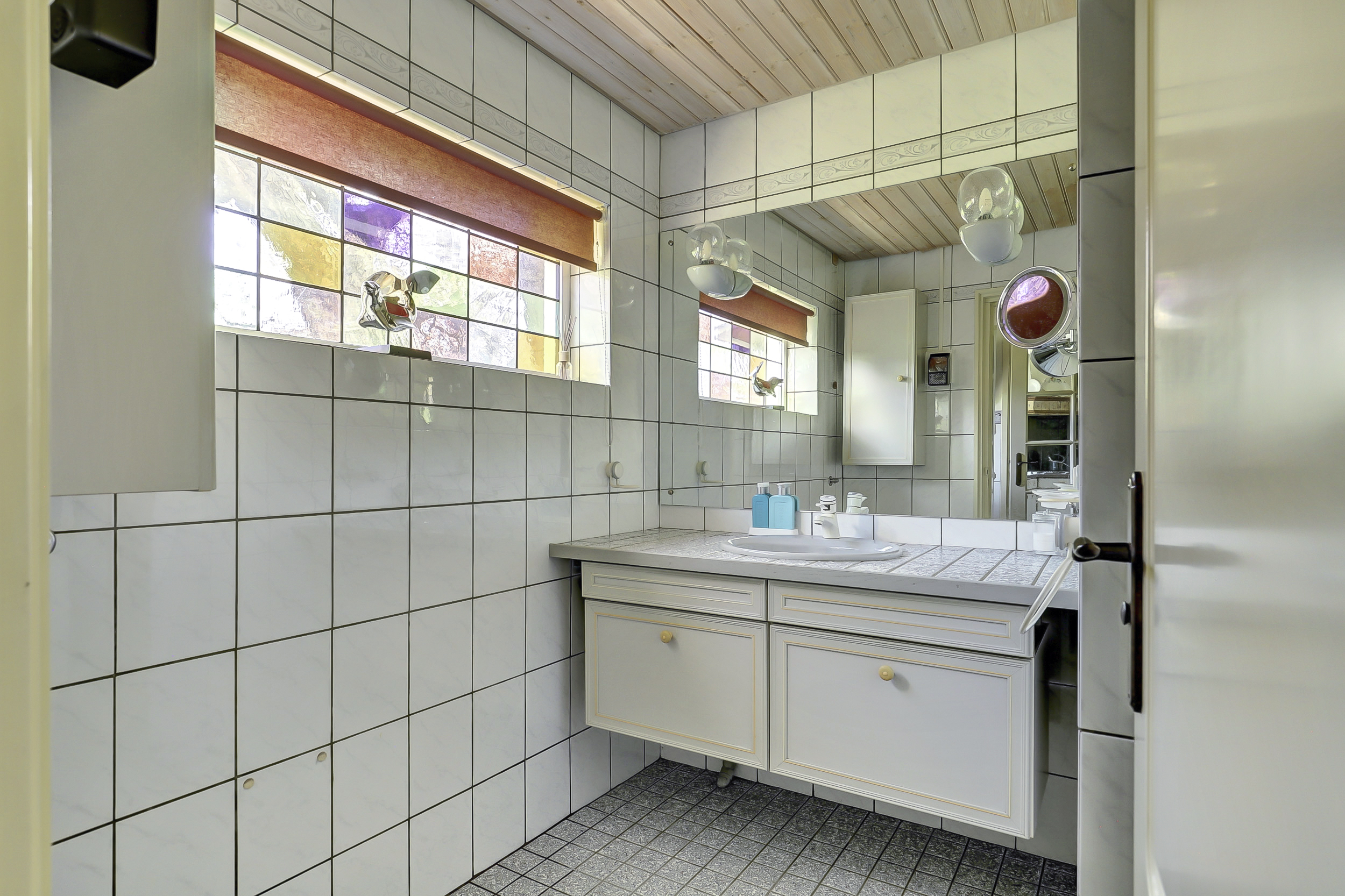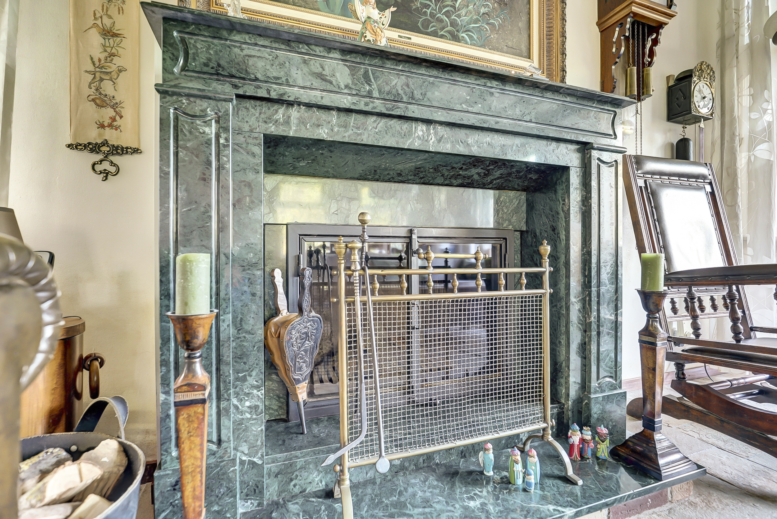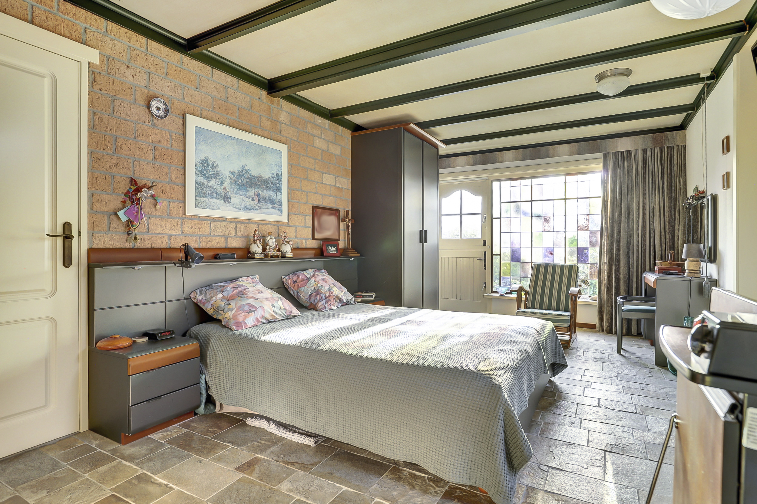 Via een tussenhal met trapopgang bereikt u de woonkamer van bijna 50 m². Deze is opvallend licht dankzij ramen aan drie zijden en heeft een natuurstenen vloer met vloerverwarming, een open haard met natuurstenen schouw en een karakteristiek balkenplafond. De glas-in-lood ramen versterken de uitstraling van de woning en zijn allen in dubbelglas uitgevoerd. Bovendien is een deel van de kozijnen in kunststof uitgevoerd en daarmee onderhoudsvrij.