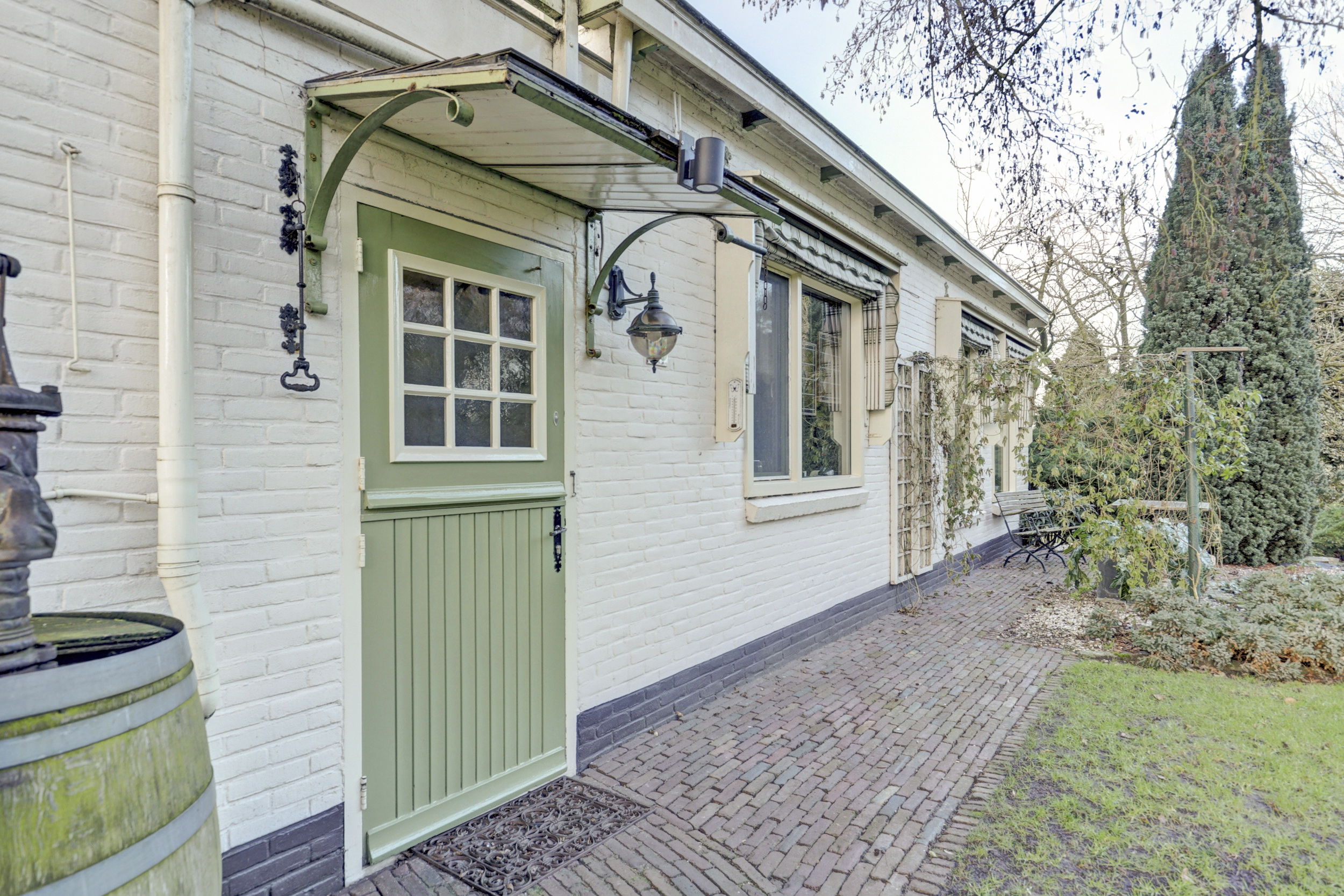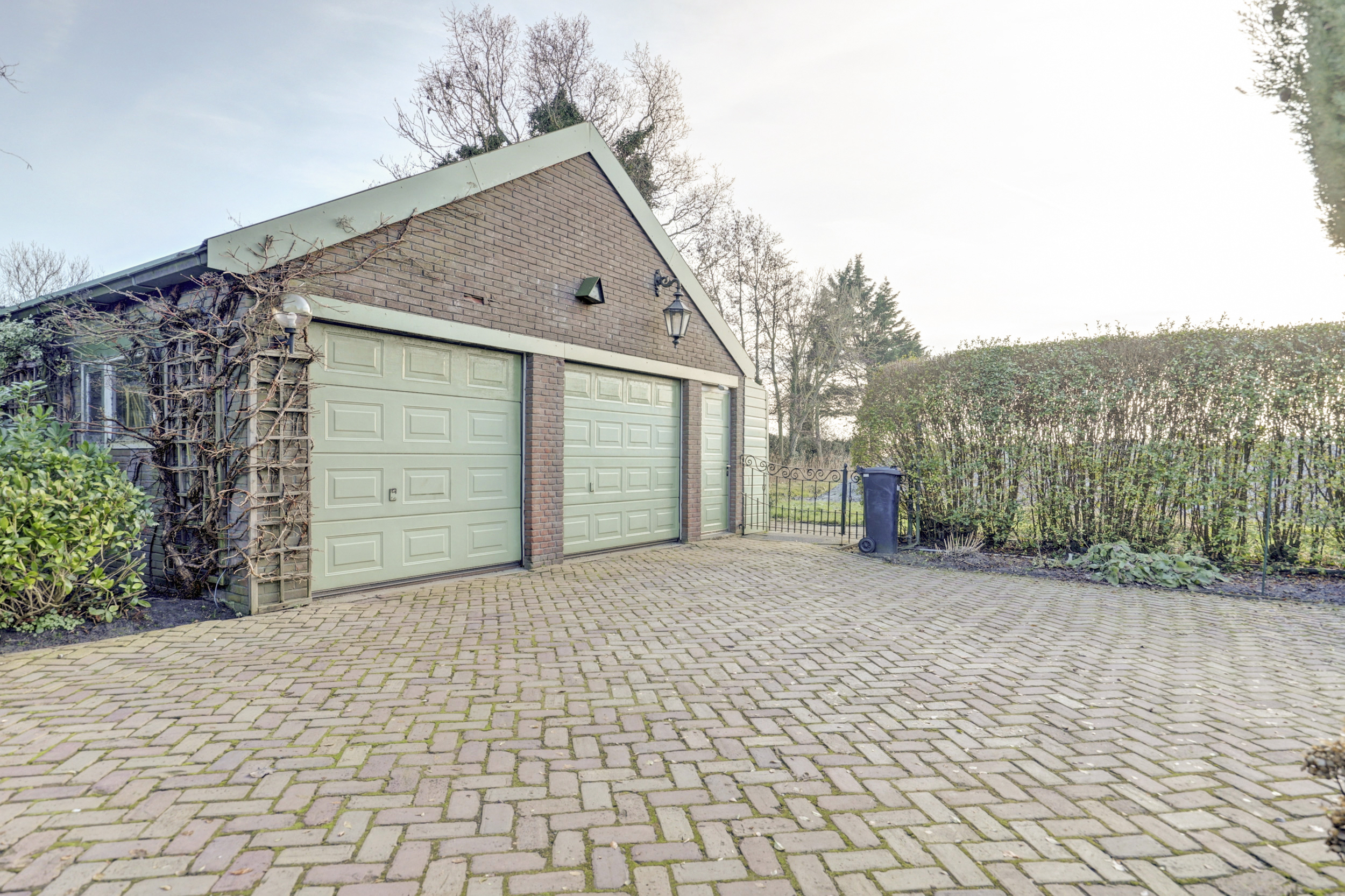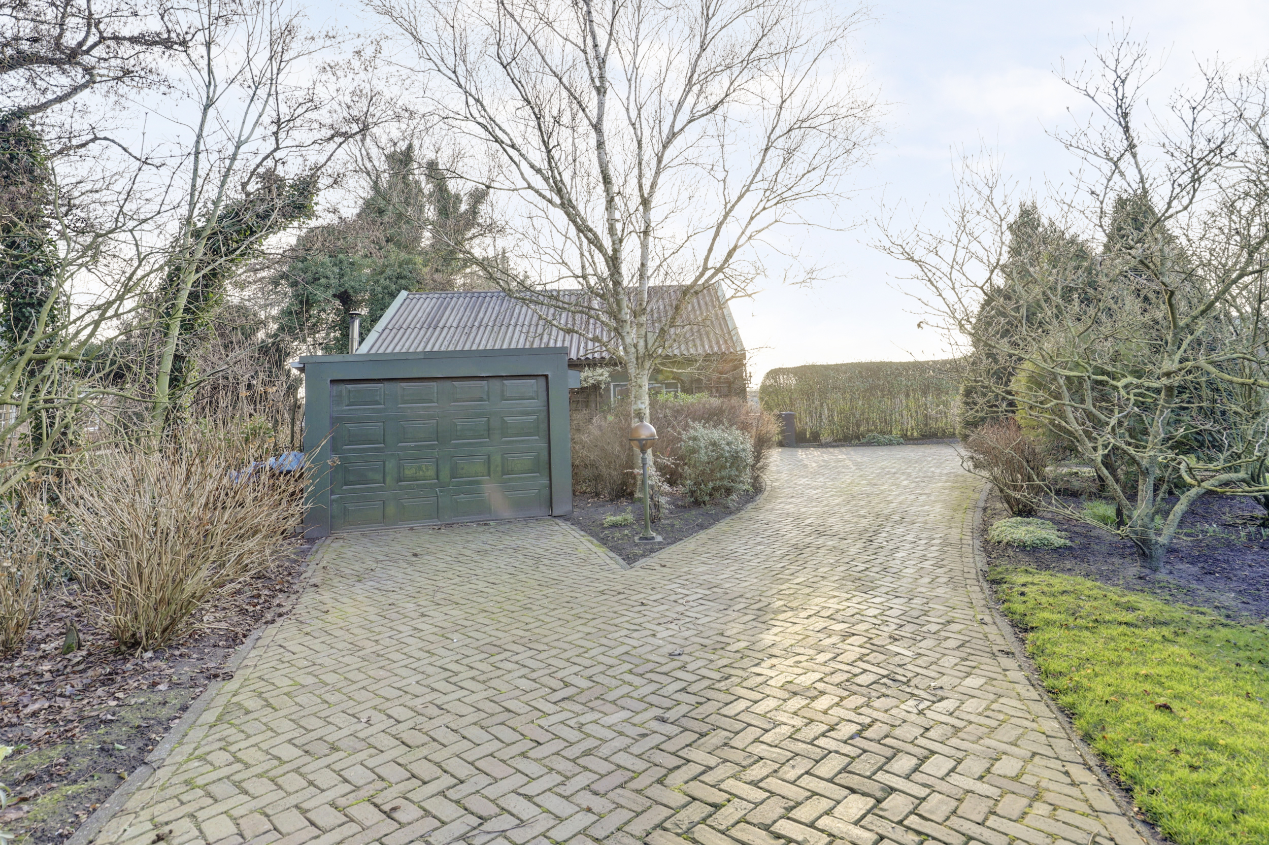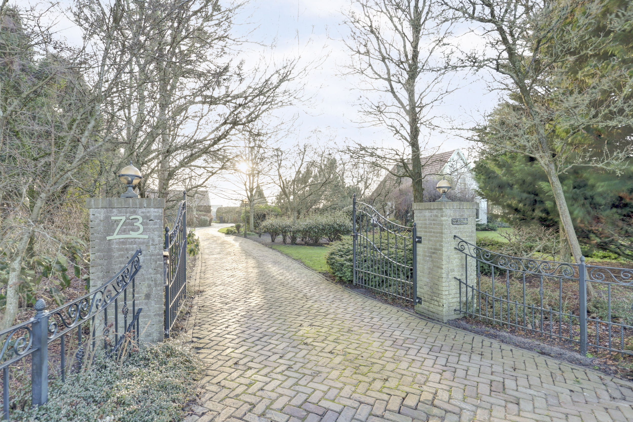 Een lange, keurig bestraatte oprit met statige poort leidt naar de woning en de achtergelegen garage. Via de zijentree betreedt u de woning.