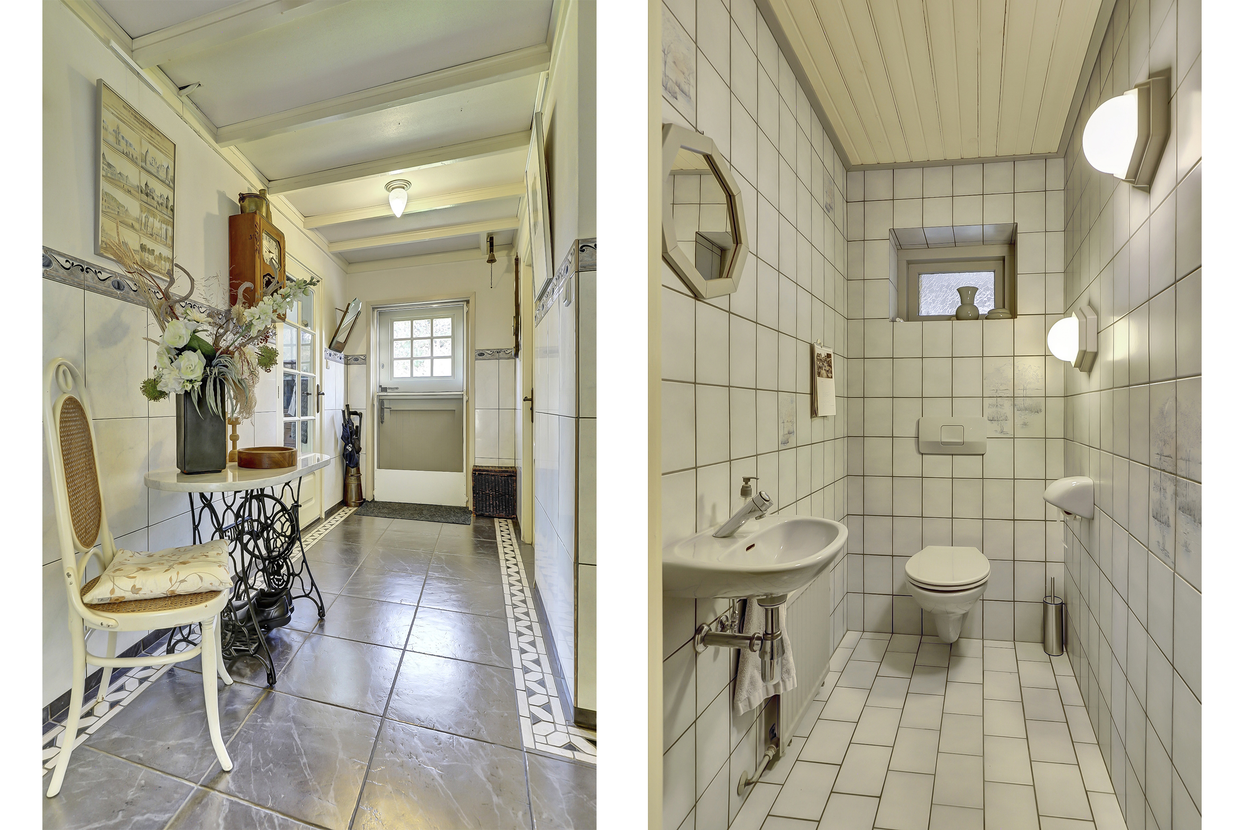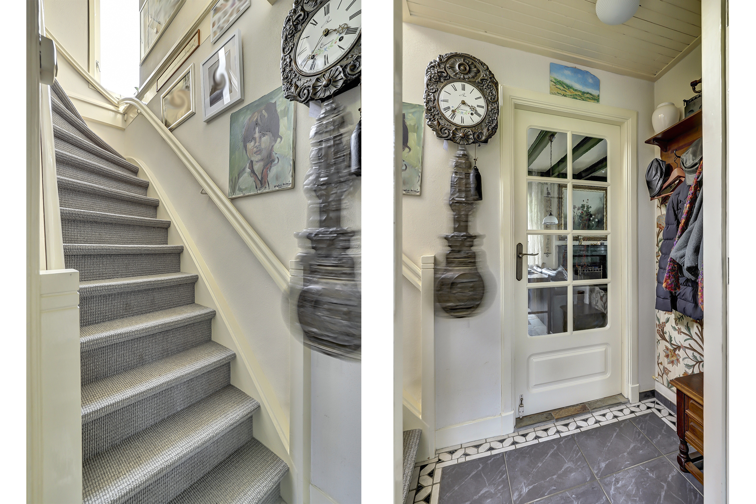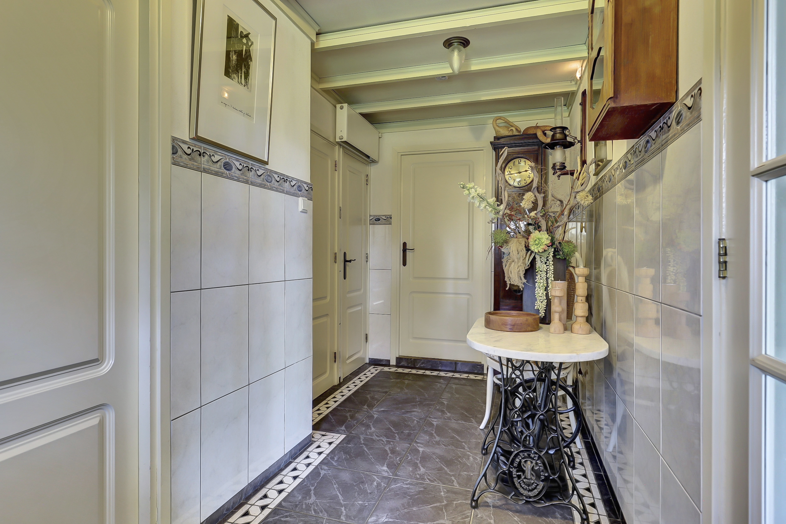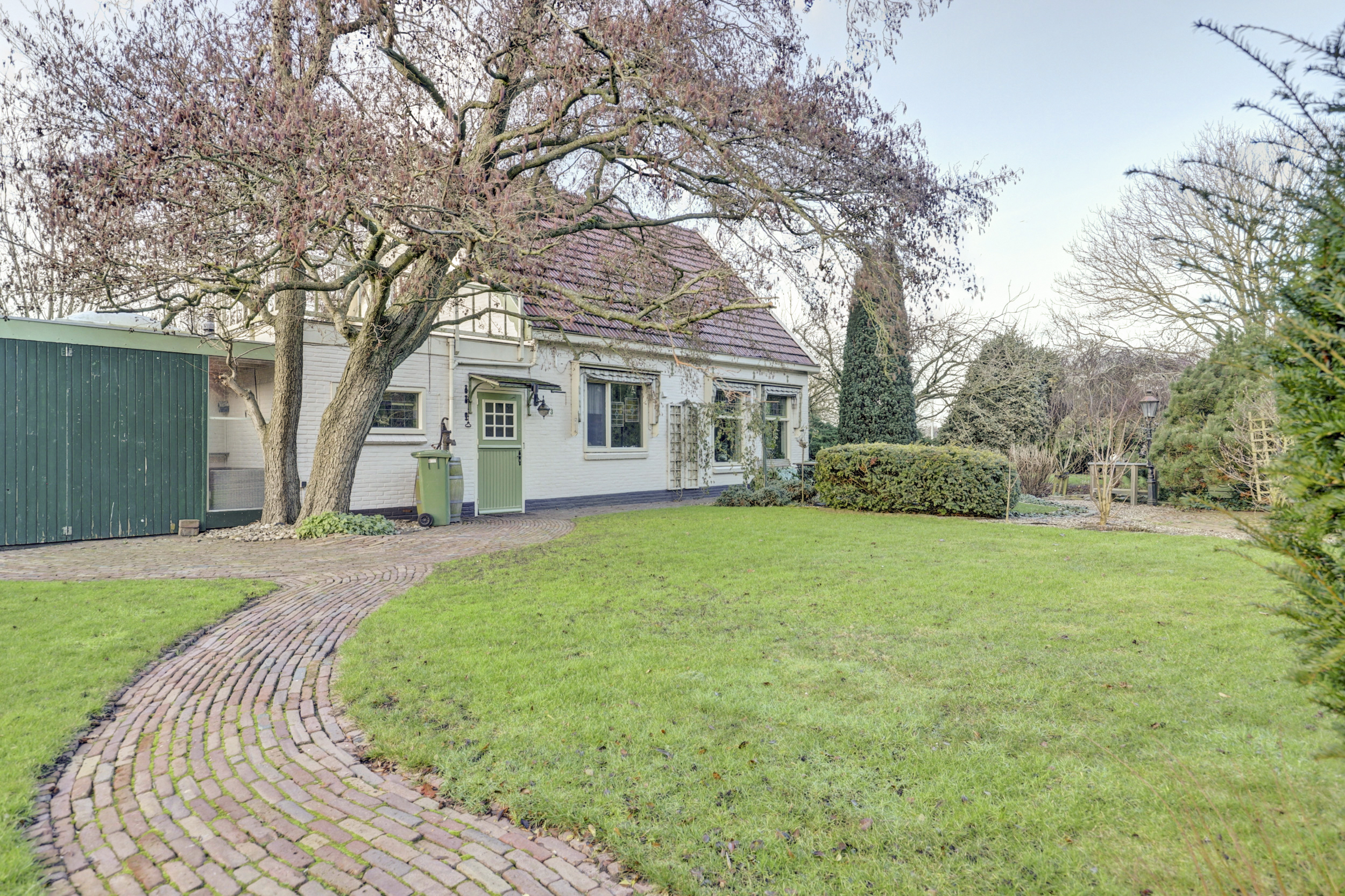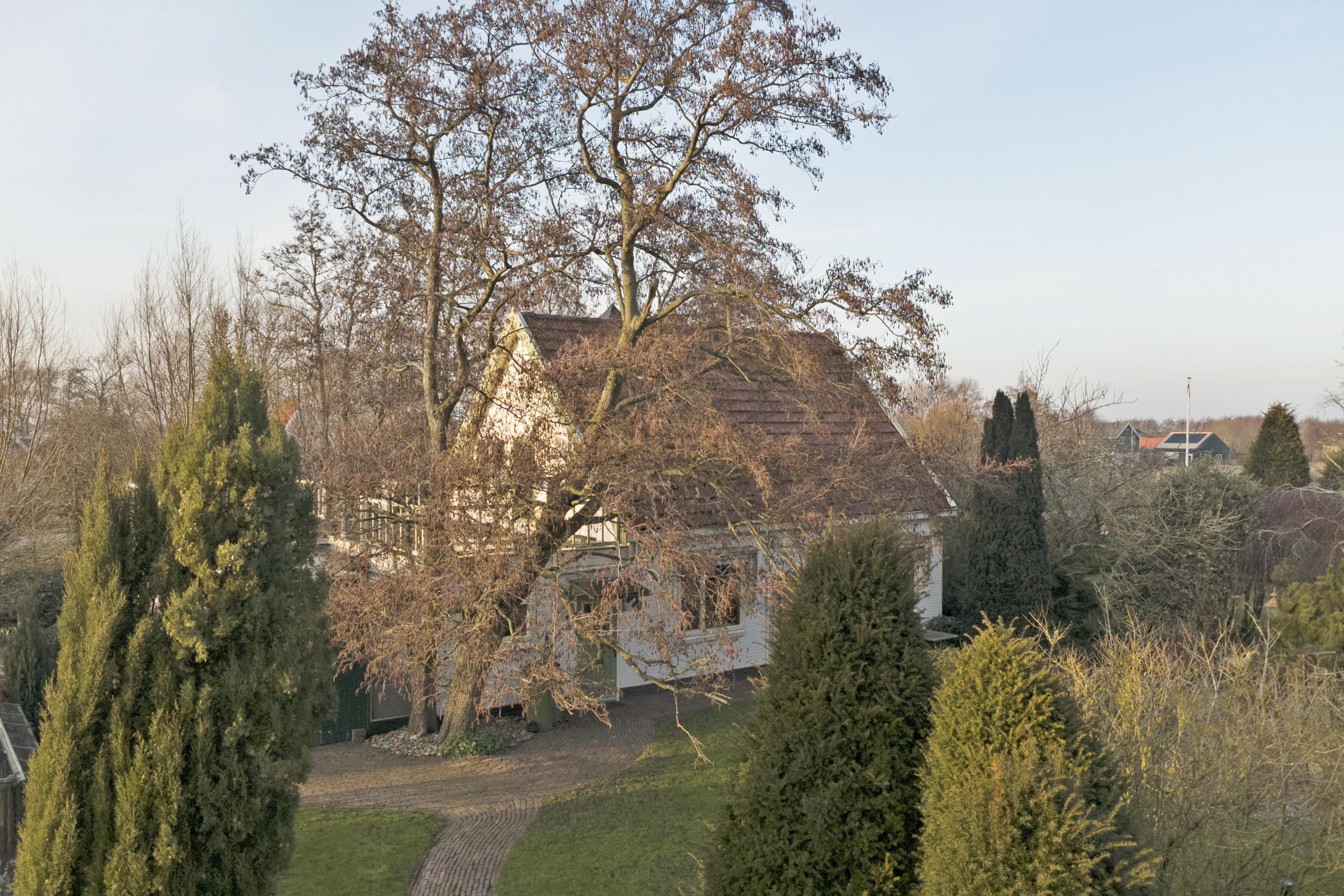 Een lange, keurig bestraatte oprit met statige poort leidt naar de woning en de achtergelegen garage. Via de zijentree betreedt u de woning.