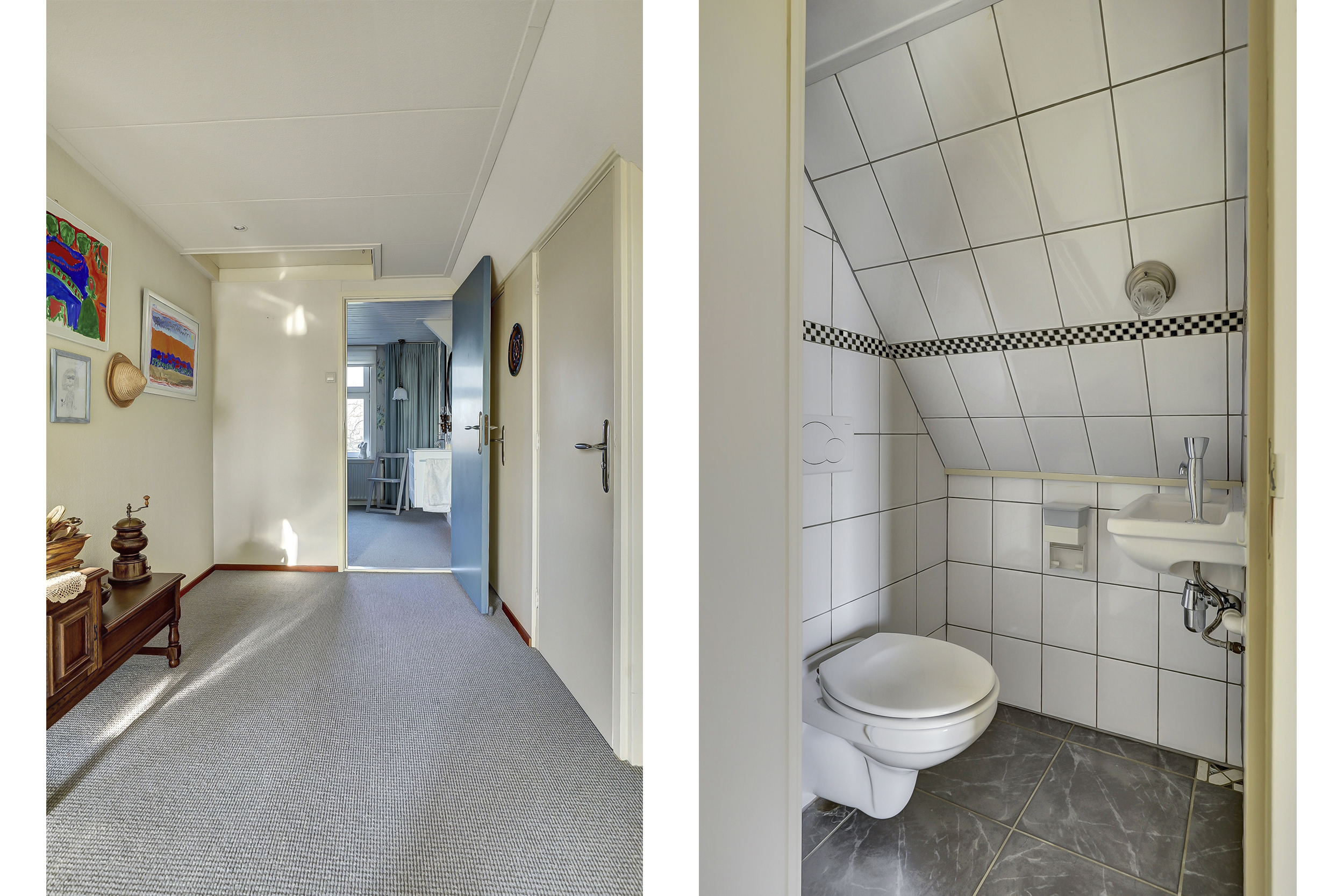 De centrale hal geeft toegang tot de badkamer (met douche en wastafelmeubel), een ruim toilet met wandcloset en fontein, de cv-ruimte, keuken en slaapkamer.