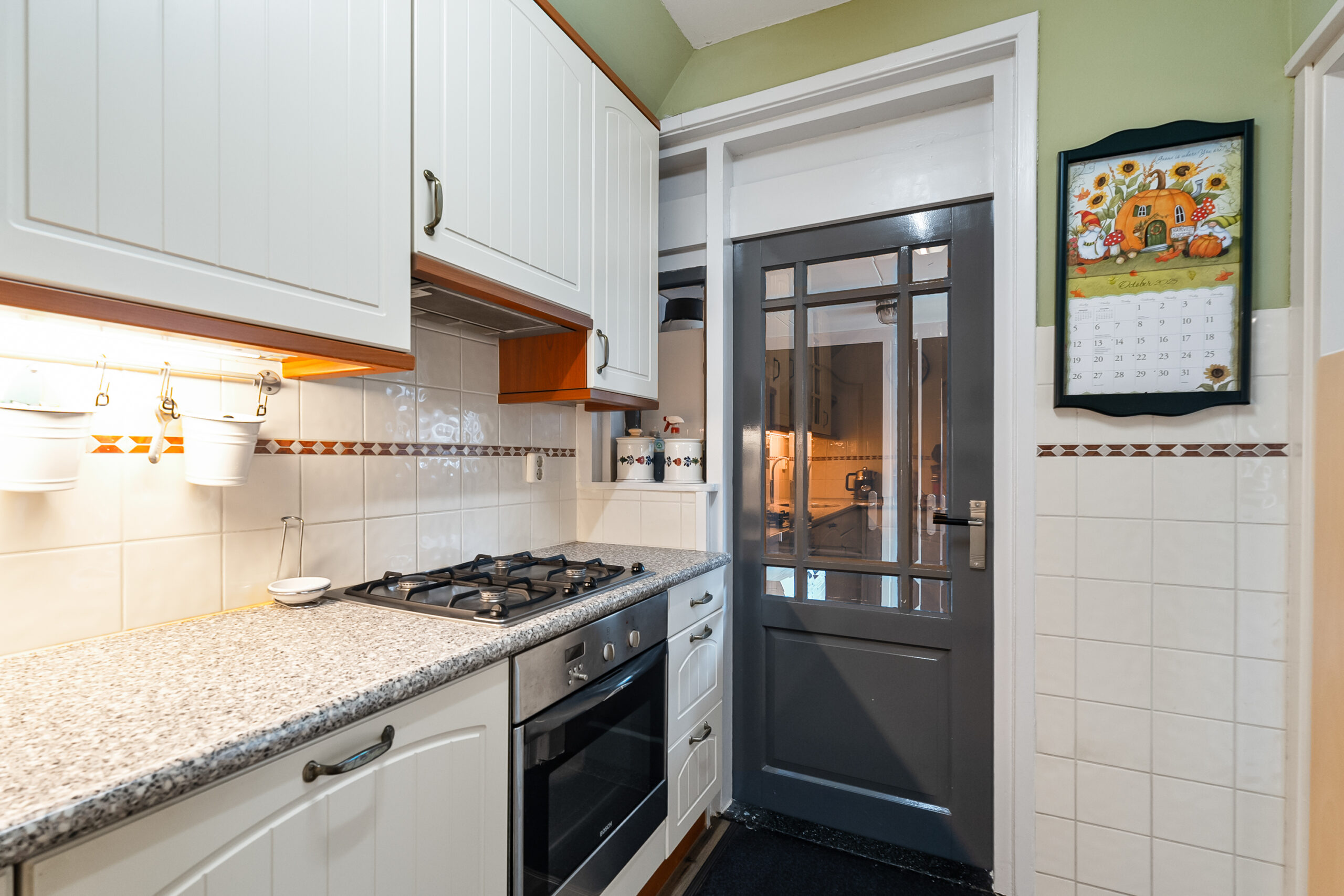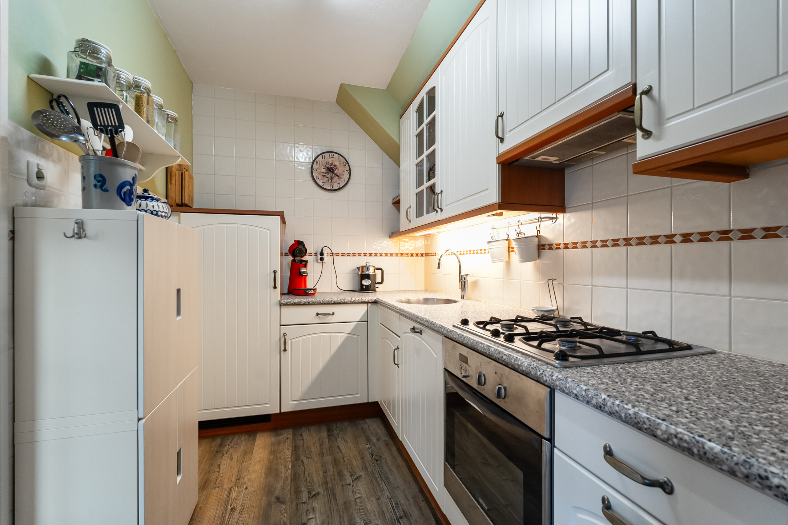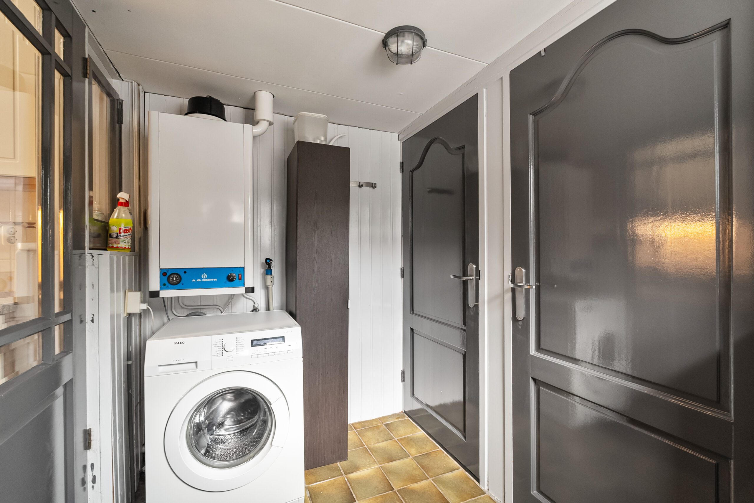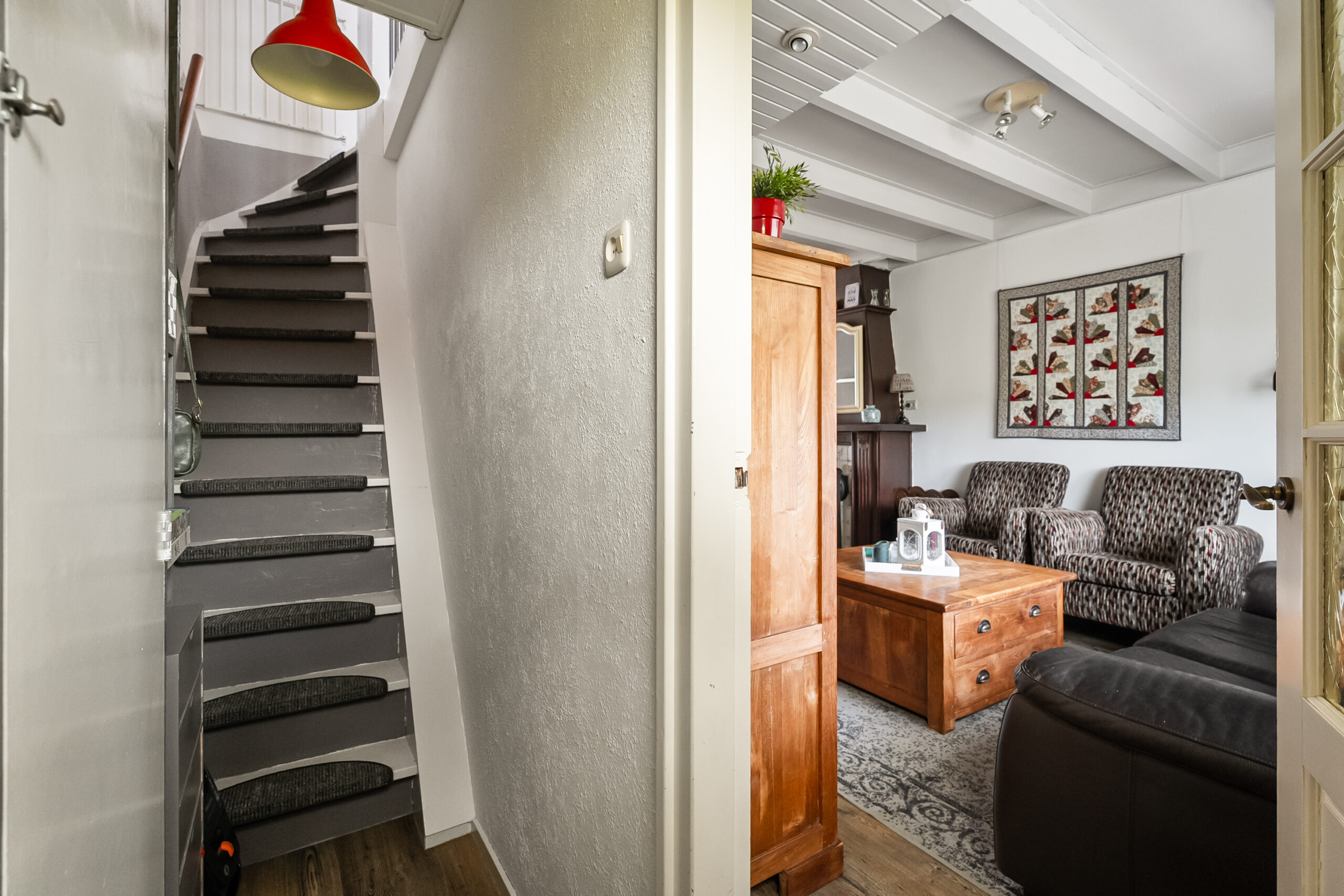 U komt binnen via de voorentree in de hal met trapopgang en meterkast. Lichte doorzonwoonkamer met vrij uitzicht aan de voorzijde. De woonkamer is afgewerkt met PVC-vloer, behang/lambrisering en de gaskachel. Dichte hoekkeuken met koelkast, oven, gaskookplaat, vaatwasser en afzuigkap. Achter de keuken treft u de bijkeuken met tuindeur, badkamer met douche en het toilet. Achter de woning staat nog de (voormalig)garage die nu in gebruik is als berging.