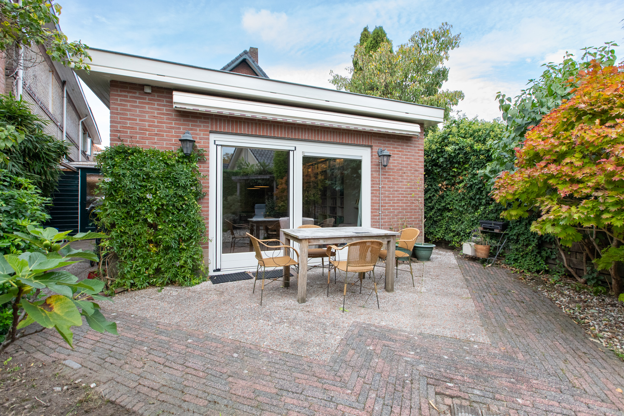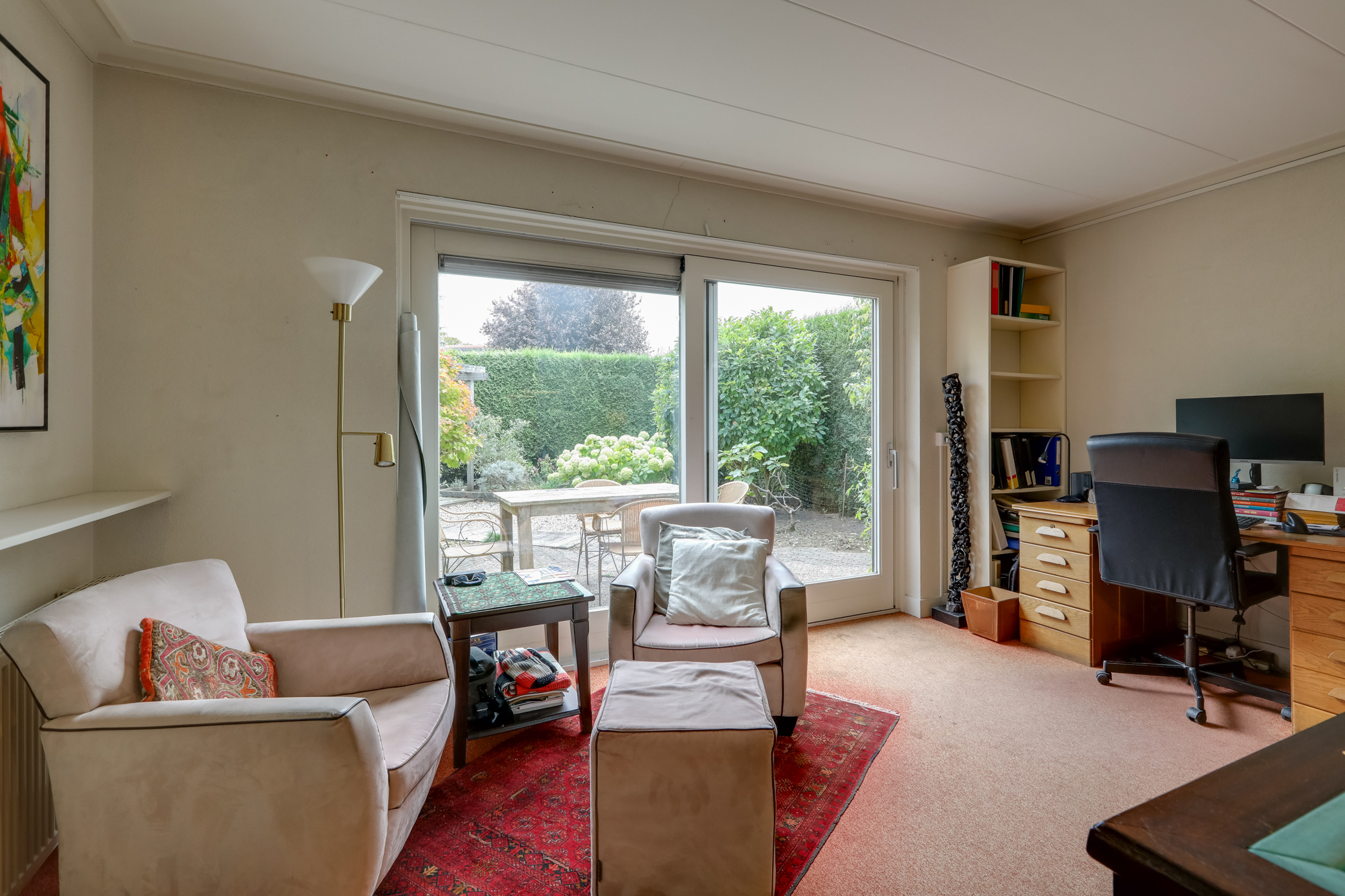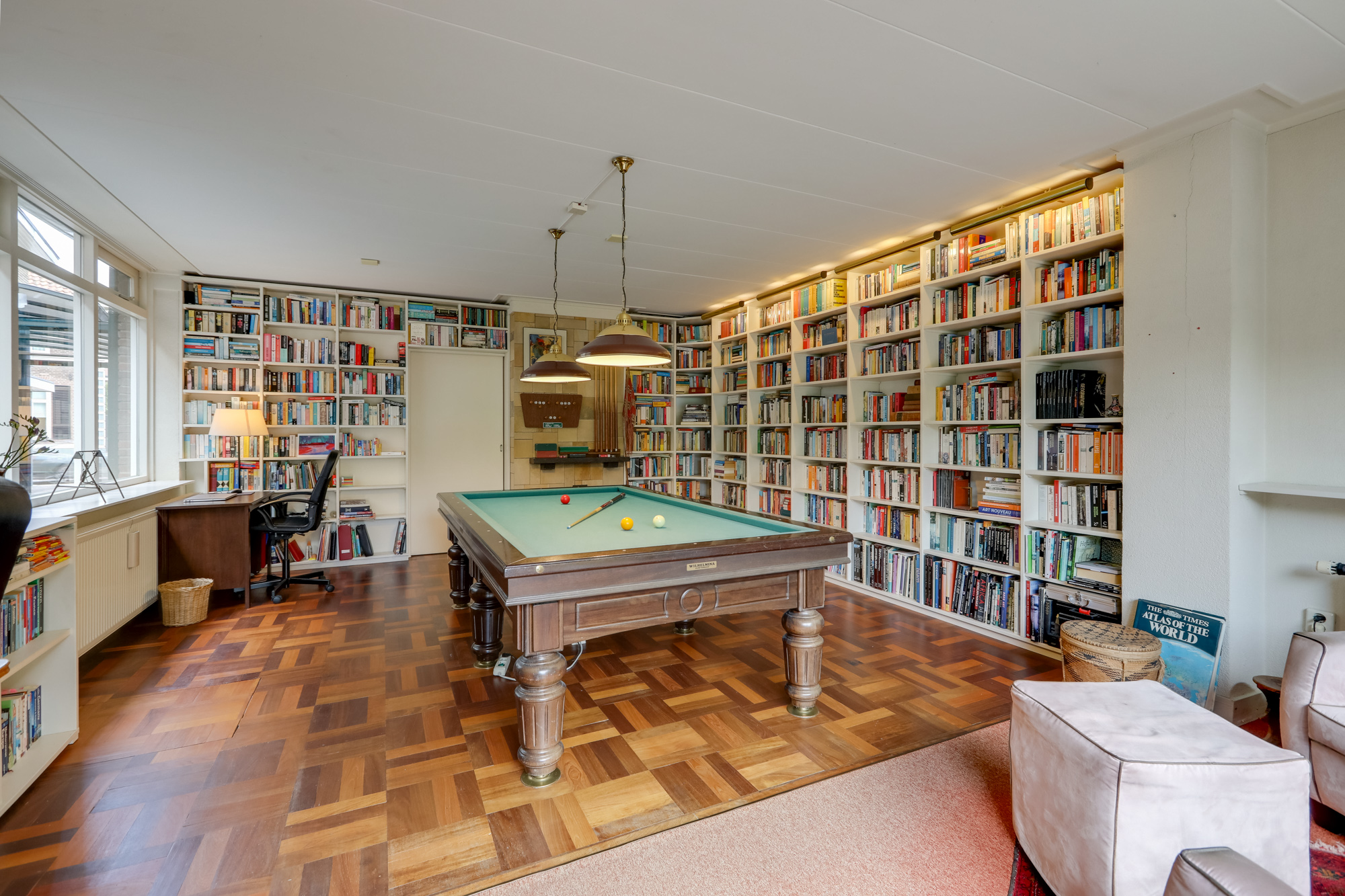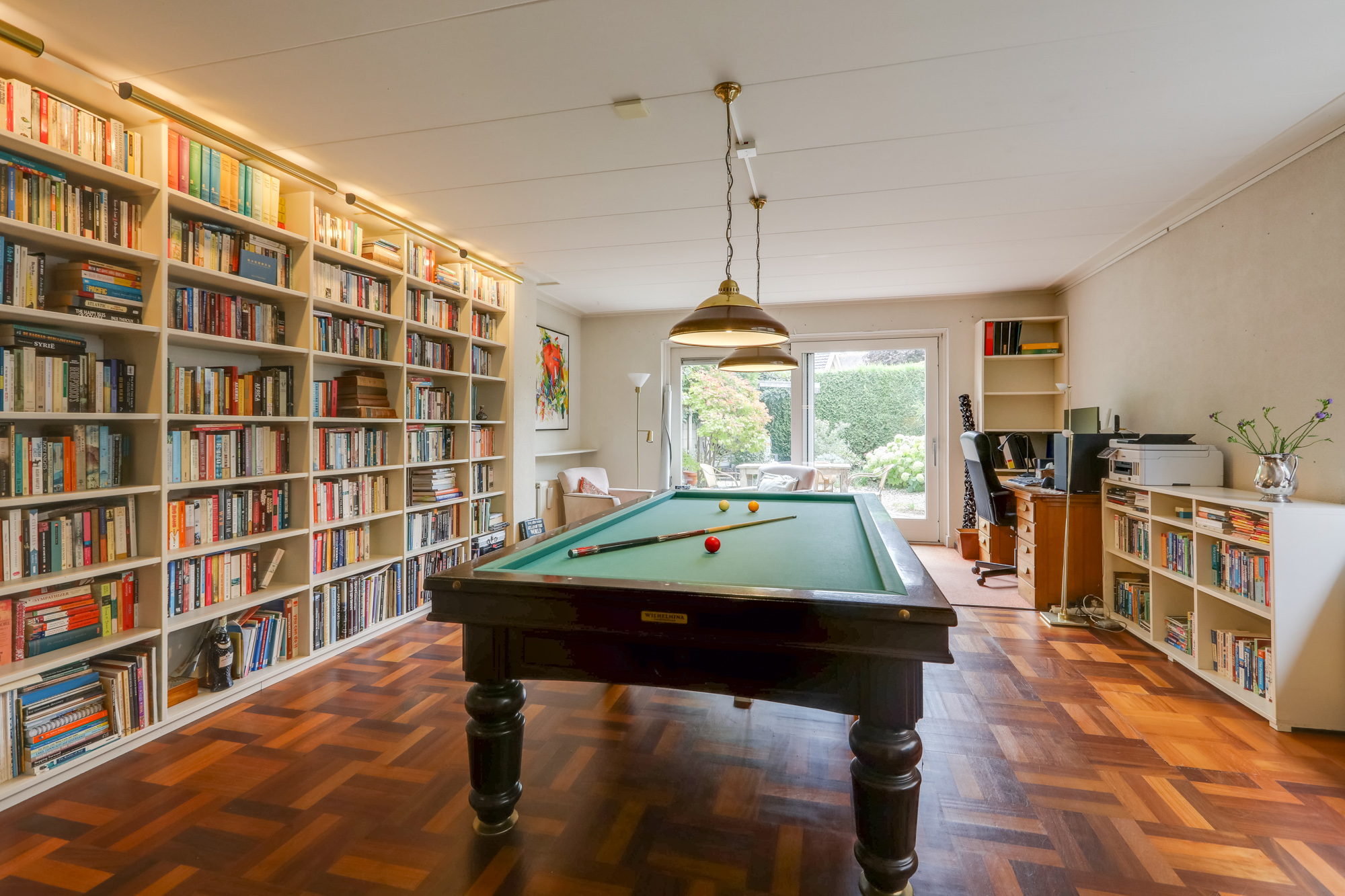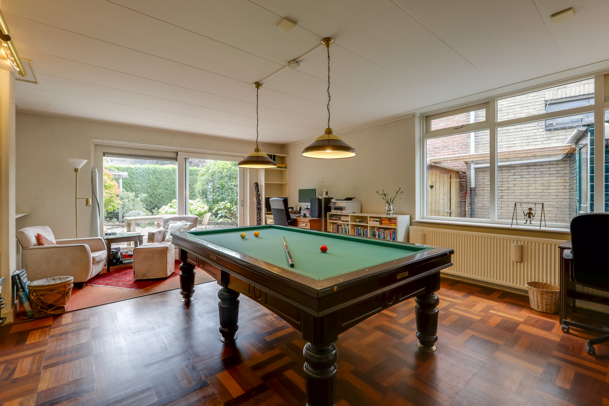 Terug naar de hal; via een extra zit/eet/studeerkamer met openslaande tuindeuren bereik je de forse aanbouw welke echt multifunctioneel is te noemen. Naast het huidige gebruik als kantoor/bibliotheek/biljartruimte is bijvoorbeeld het gebruik als 2e woonkamer of royale woonkeuken een goede optie. Ook kan er prima een herindeling plaatsvinden met extra slaapkamer en badkamer.