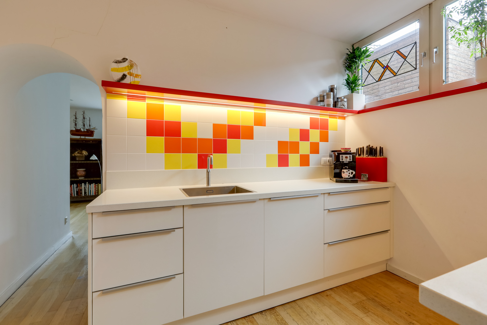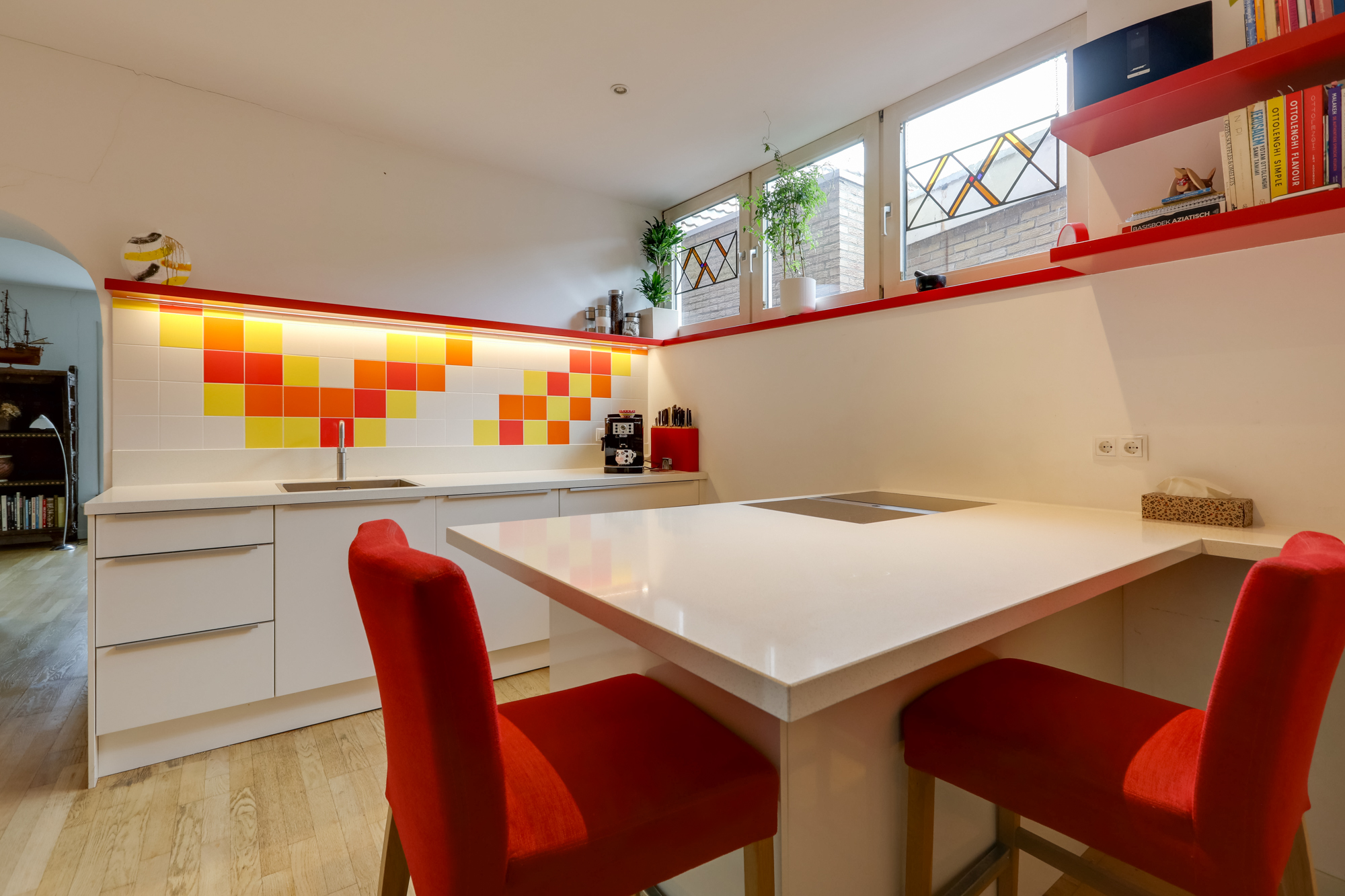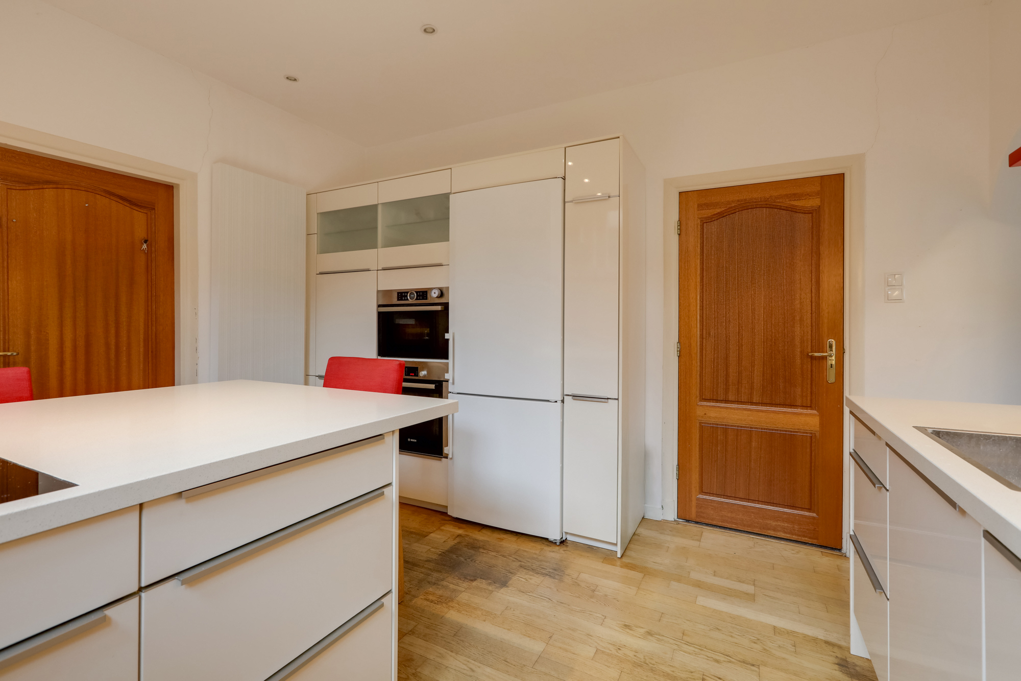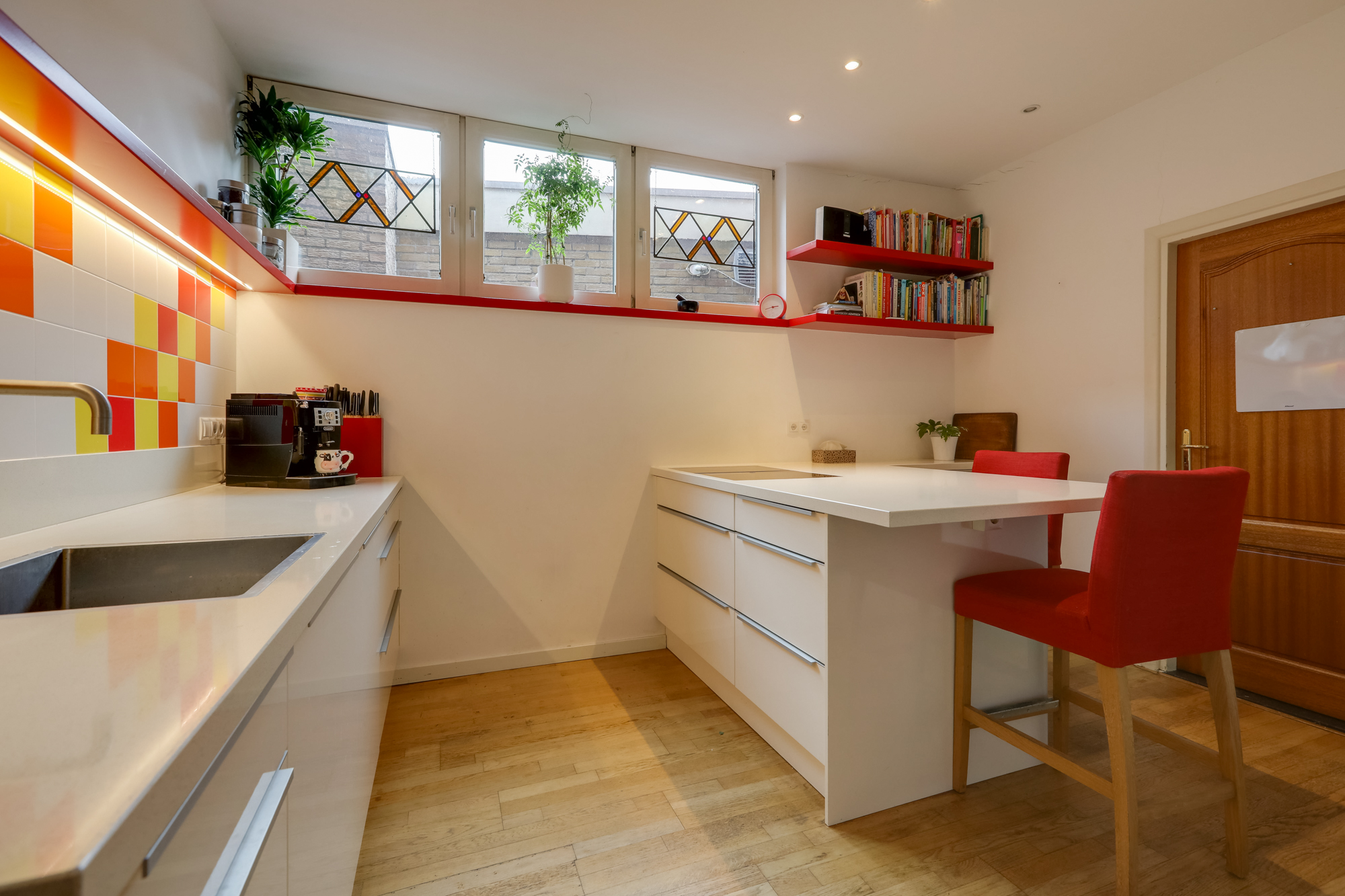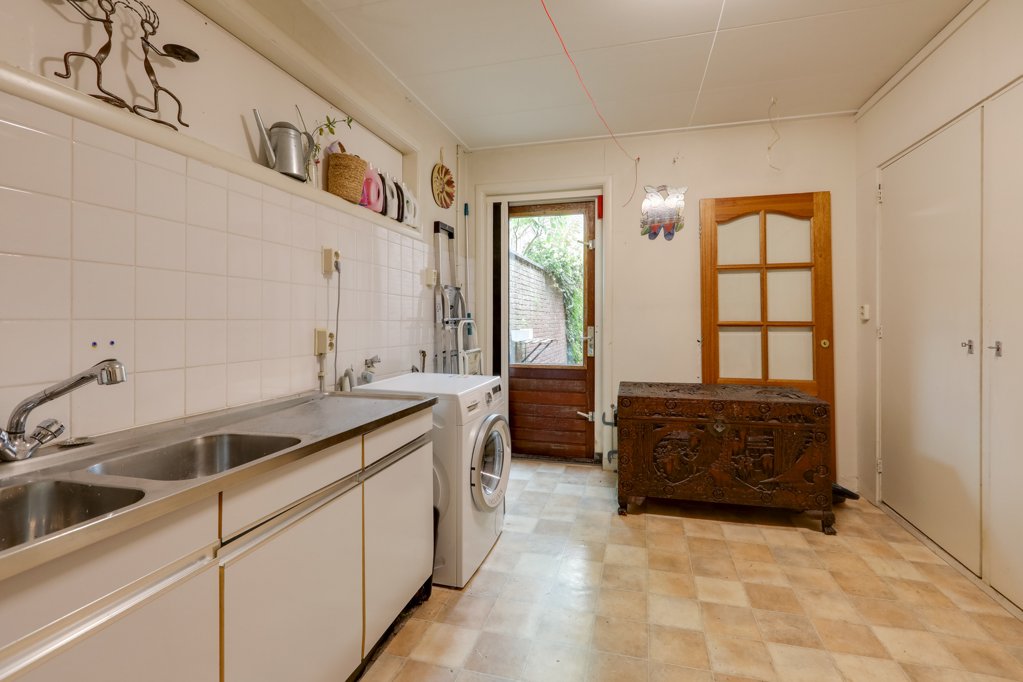 Aansluitend aan de keuken vindt je een praktische, ruime bijkeuken met veel inbouwkastruimte, keukenblok, witgoedopstelling, c.v. opstelling en omvormer zonnepanelen.