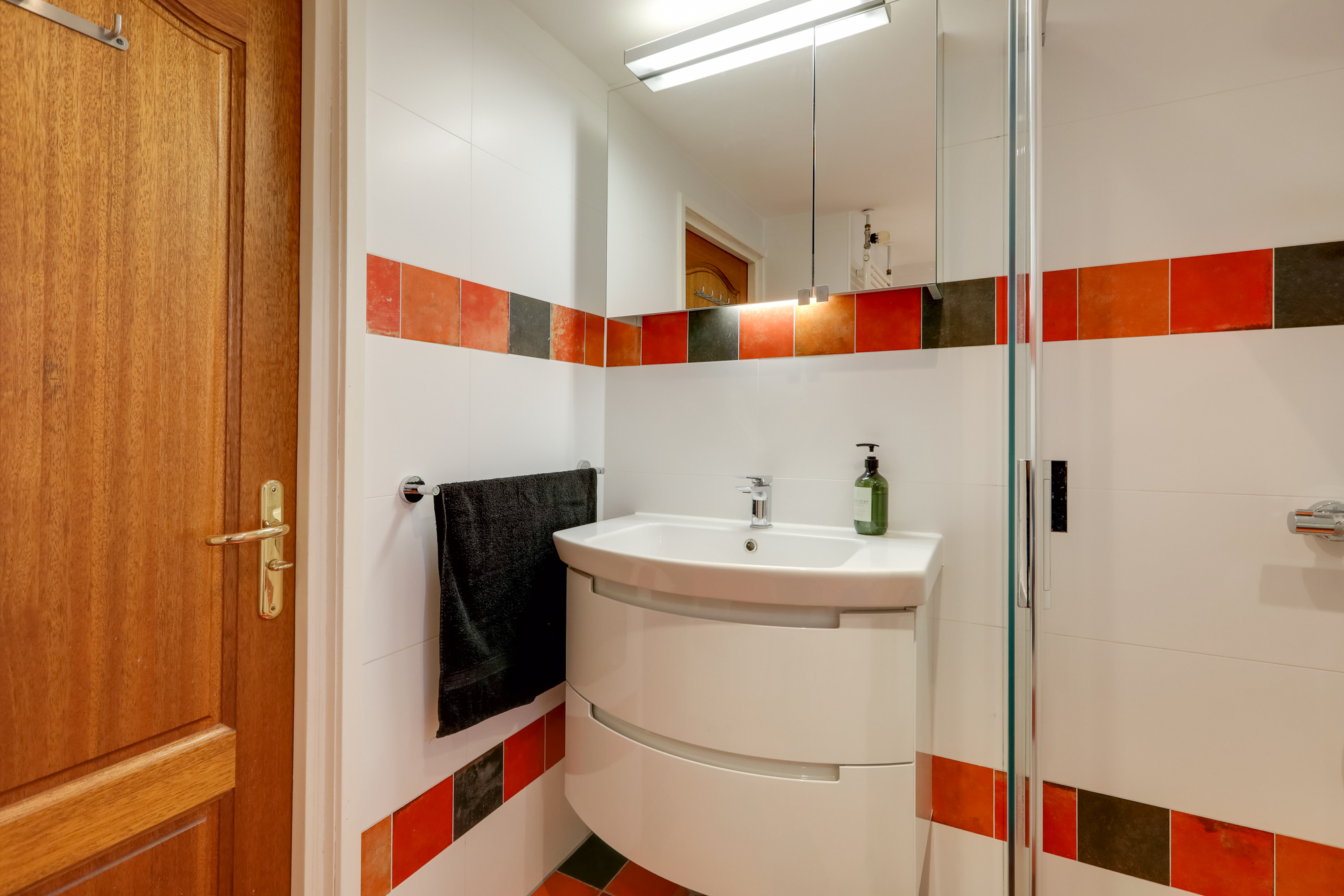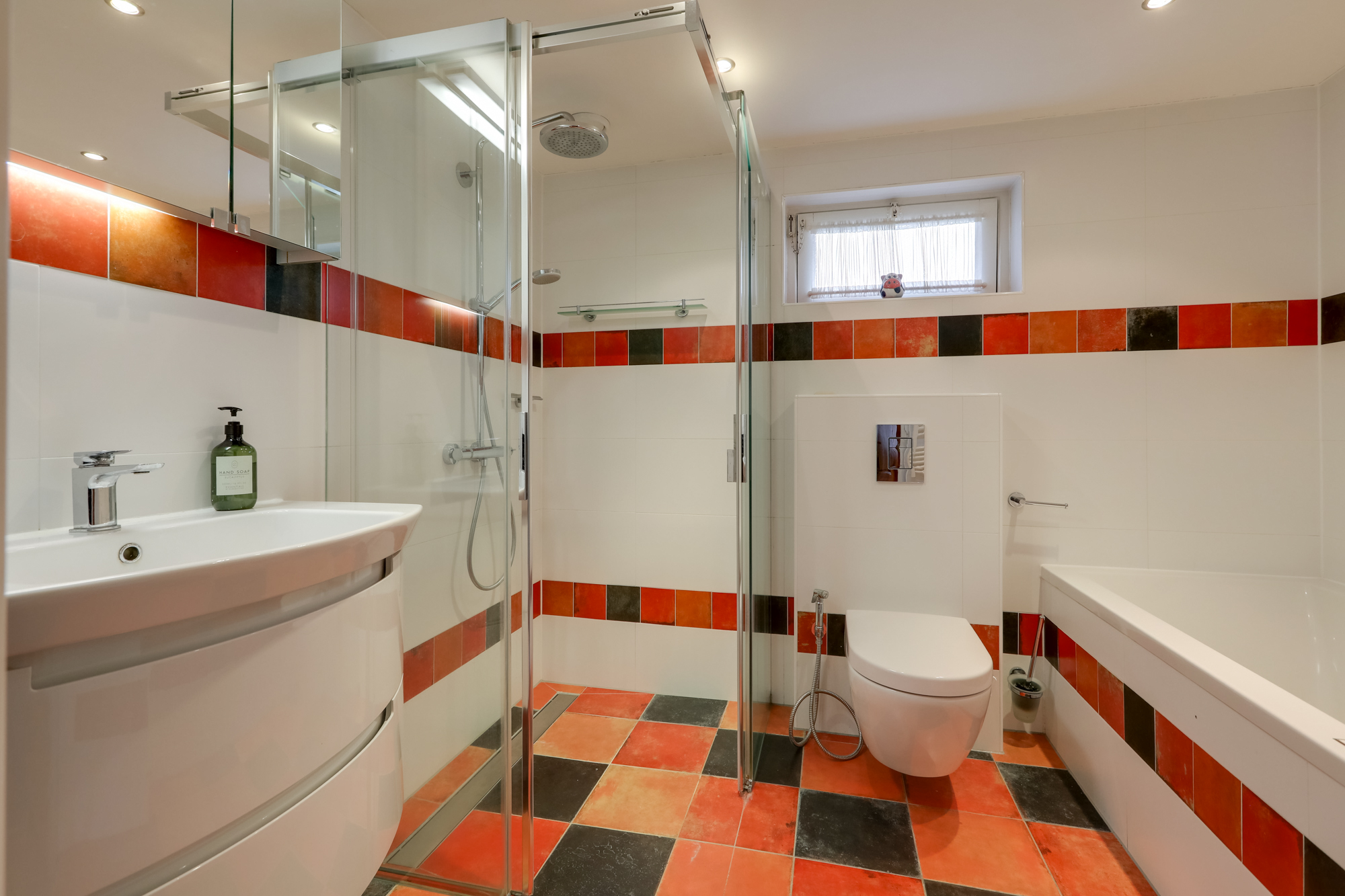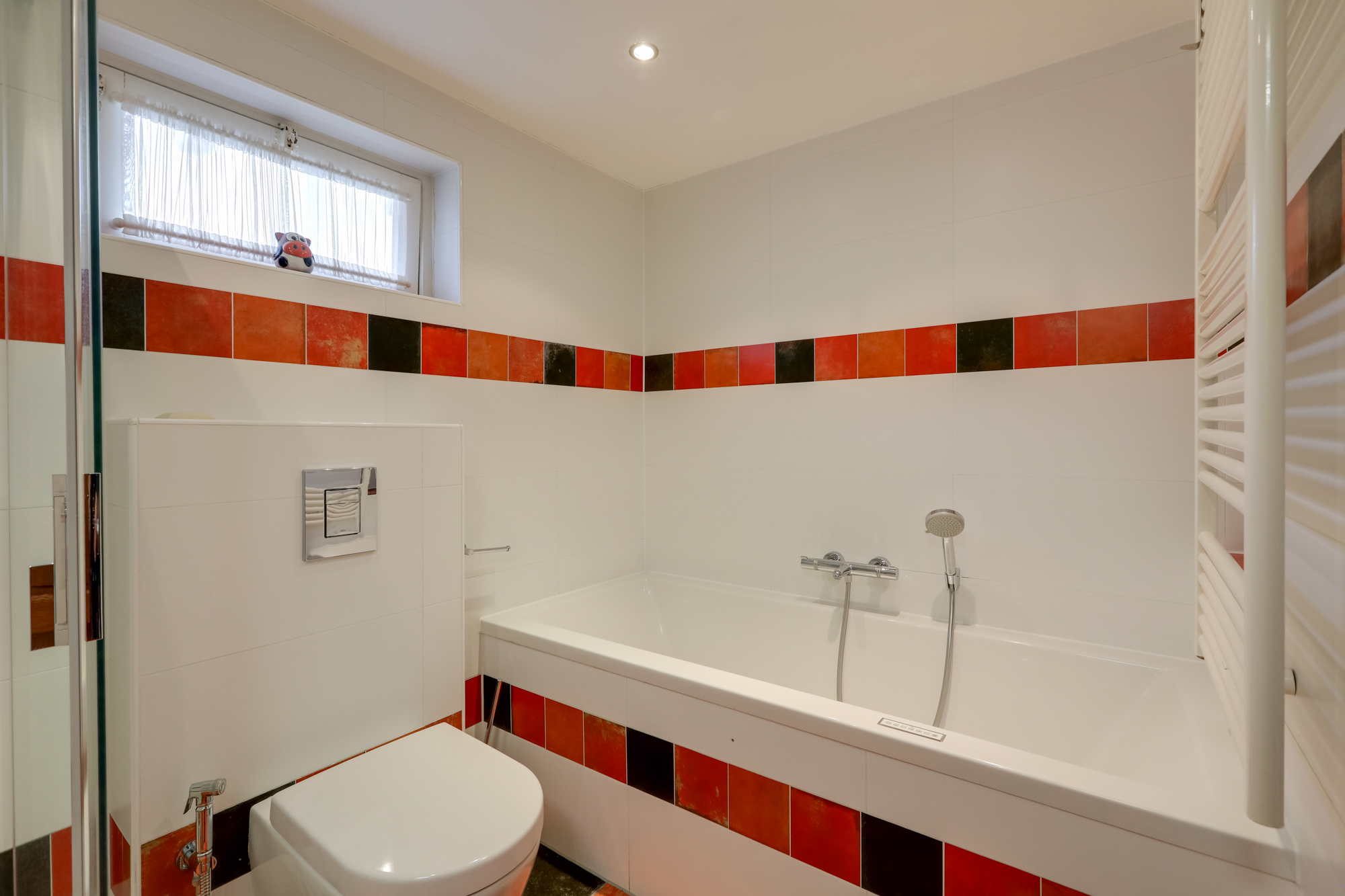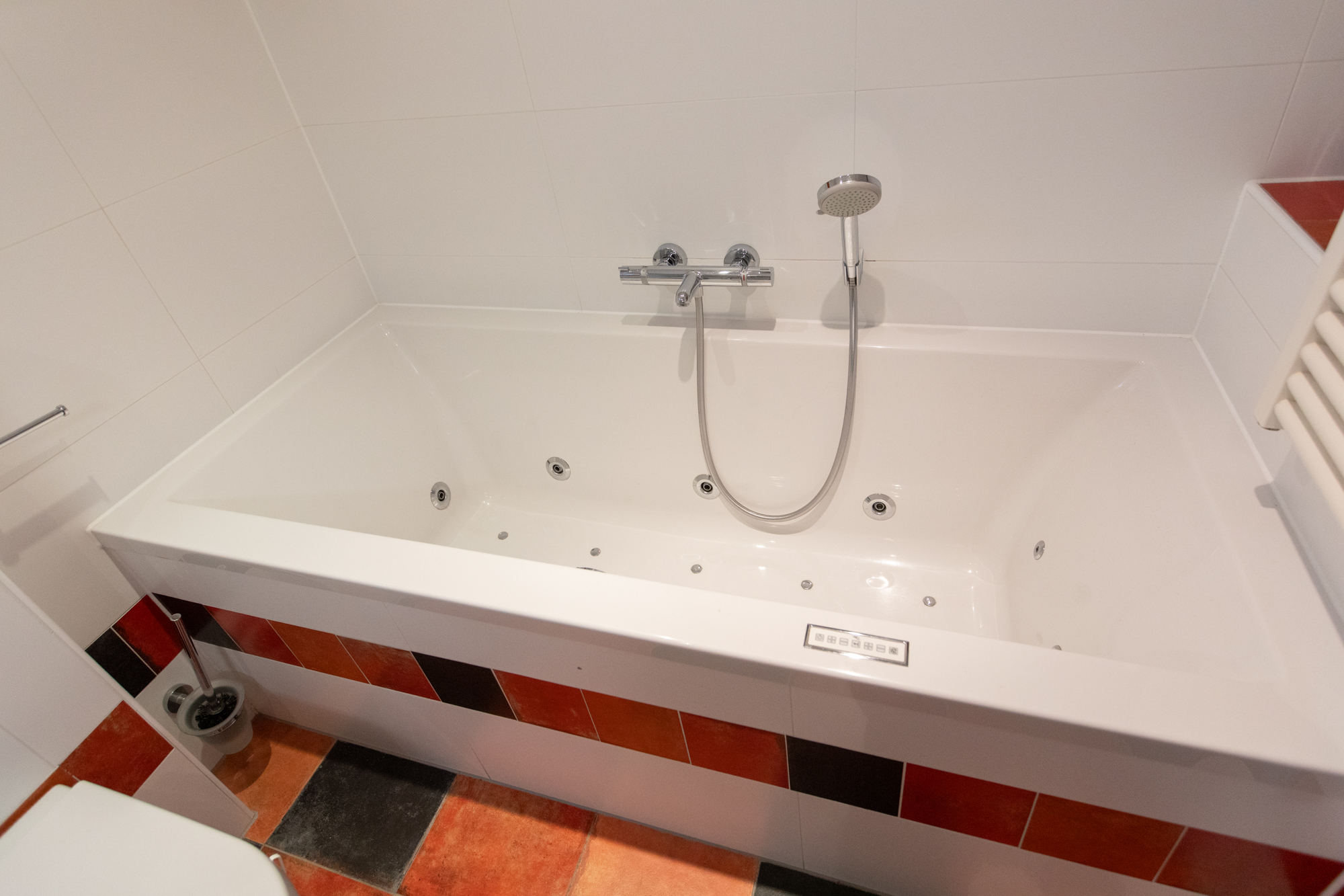 De op deze verdieping aanwezige badkamer beschikt over een douche, wastafelmeubel, 2e toilet, ligbad met whirlpool, designradiator en vloerverwarming.
