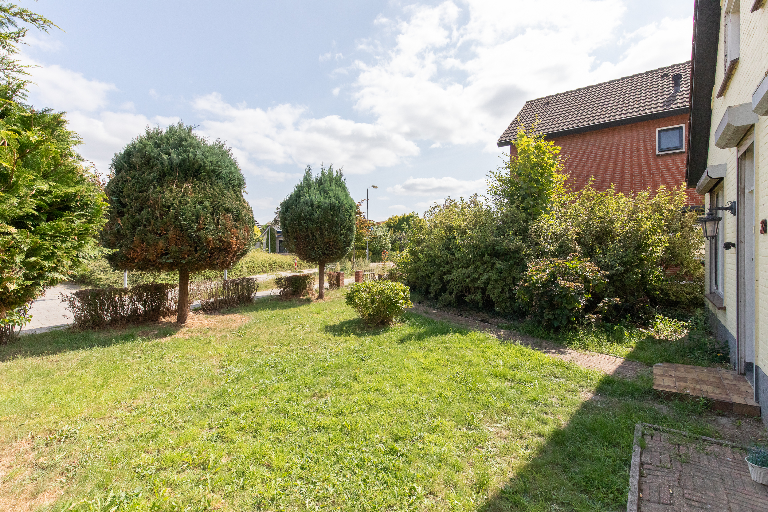 Aan de zijkant van de woning is een oprit met ruimte voor meerdere auto’s. Verder is de tuin rondom aangelegd met diverse beplanting, bestrating en erfafscheidingen.
