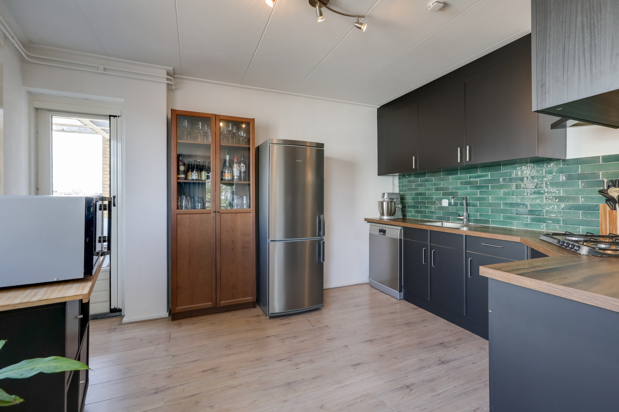 (Remeha 2017) en aansluiting voor wasmachine, slaapkamer met toegang tot een balkon, toilet met hangcloset, moderne en keurig verzorgde badkamer met douche en wastafel. Via de hal bereik je de ruime woonkamer met vaste kast en gezellig balkon, royale open keuken voorzien recentelijk gemoderniseerde keuken met allerhande apparatuur zoals een koelkast, vriezer, vaatwasser, combi-oven en een 4 pits gaskookplaat met afzuigkap. Ook vanuit de keuken is er toegang tot een balkon.
