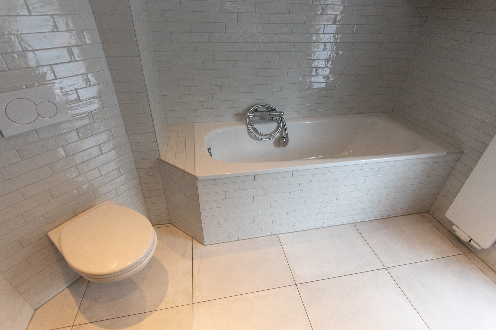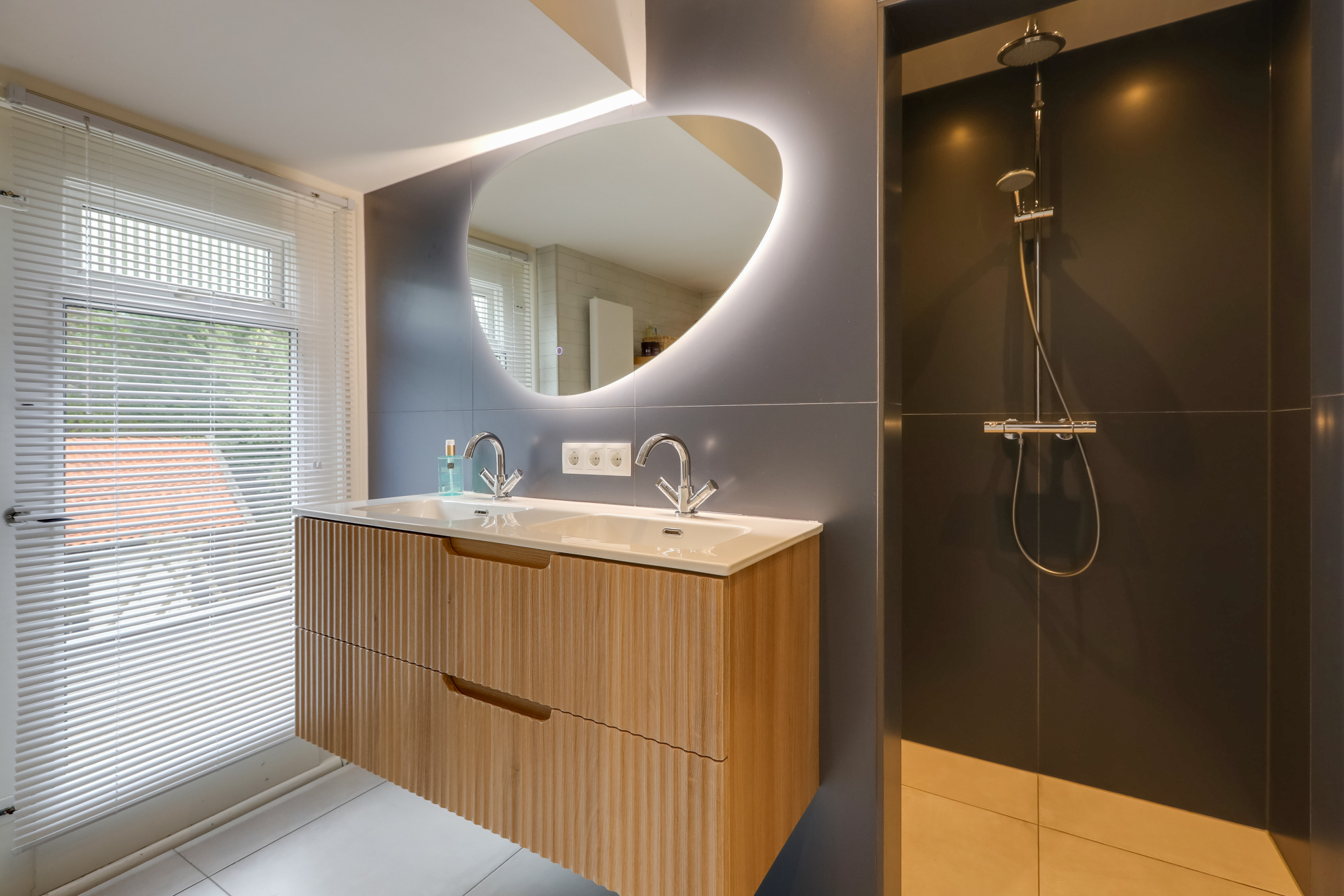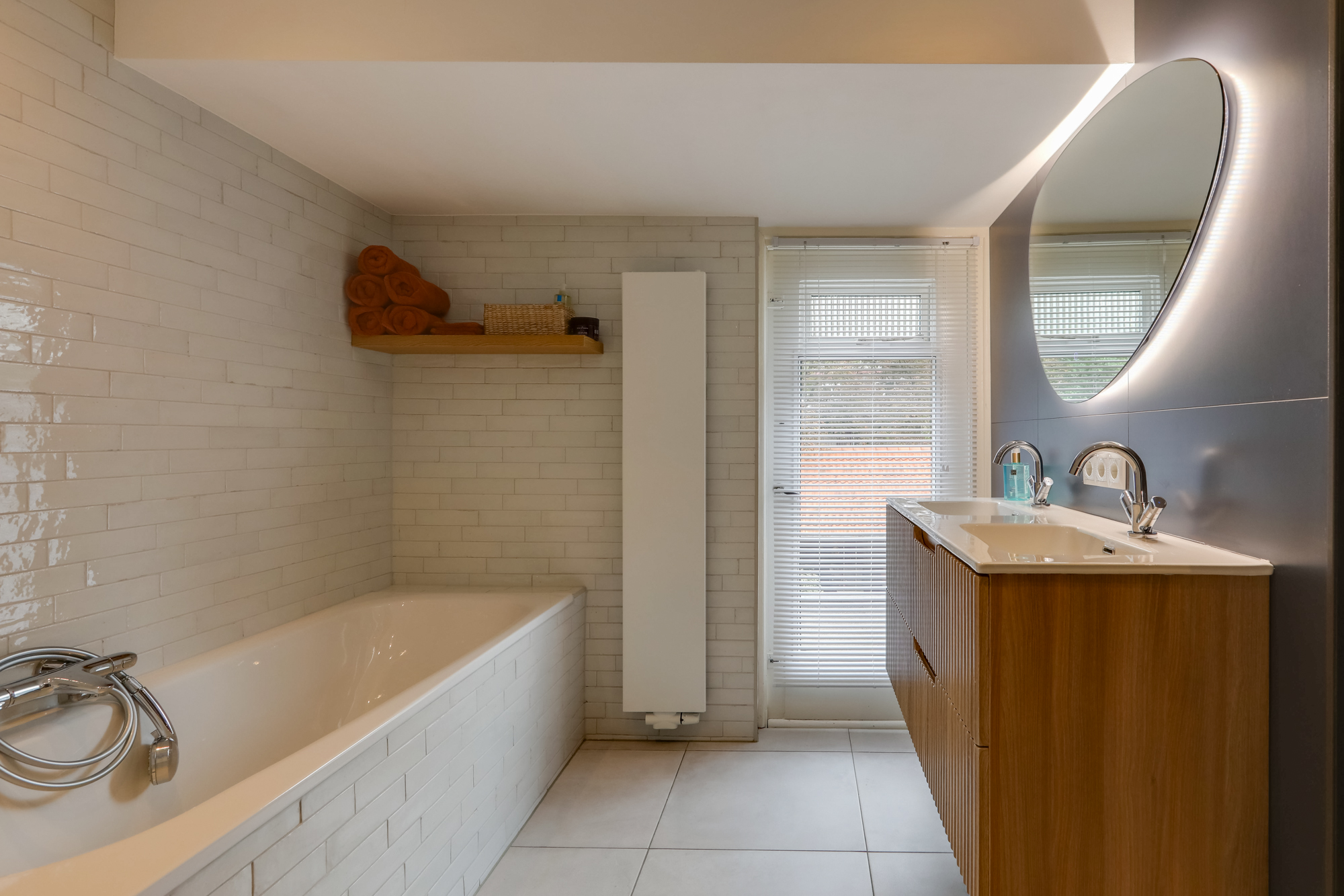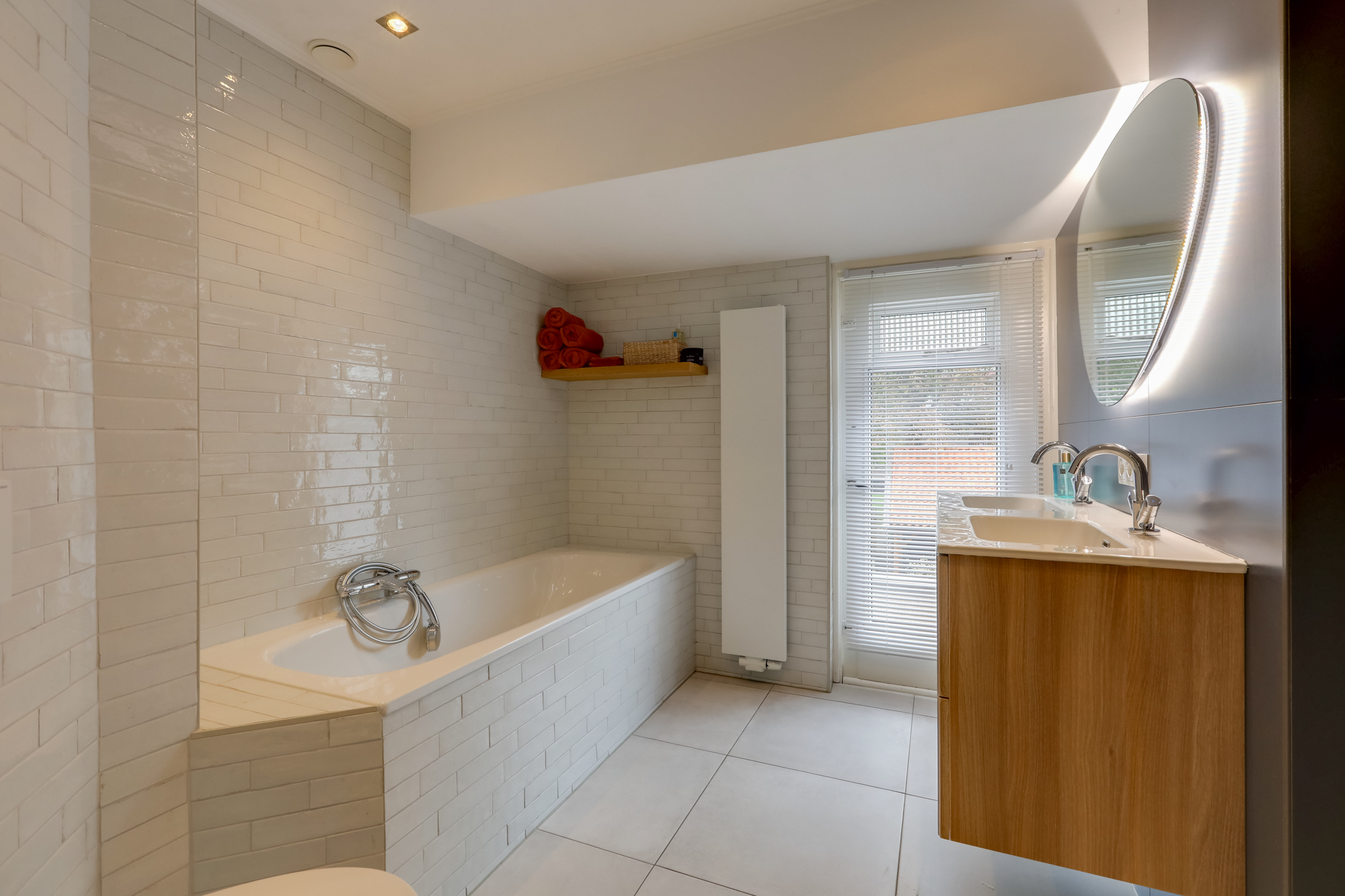 • Badkamervoorzieningen Ligbad, Toilet, Dubbele wastafel, Inloopdouche, Vloerverwarming