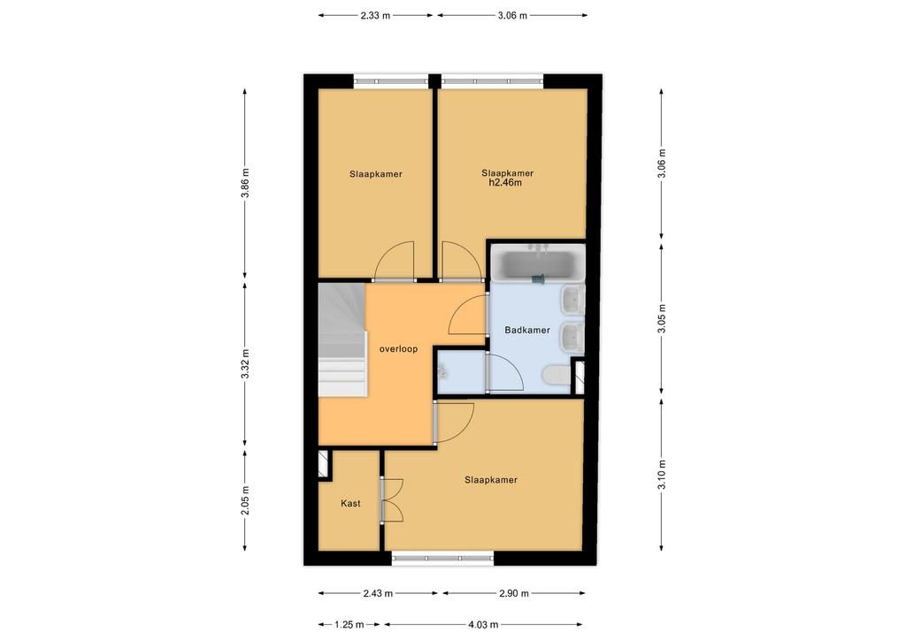 Ruime overloop, 2 slaapkamers aan de achterzijde (9 m2 en 10 m2 groot) beiden voorzien van nieuwe laminaatvloer en elektrisch rolluik aan de buitenzijde.
