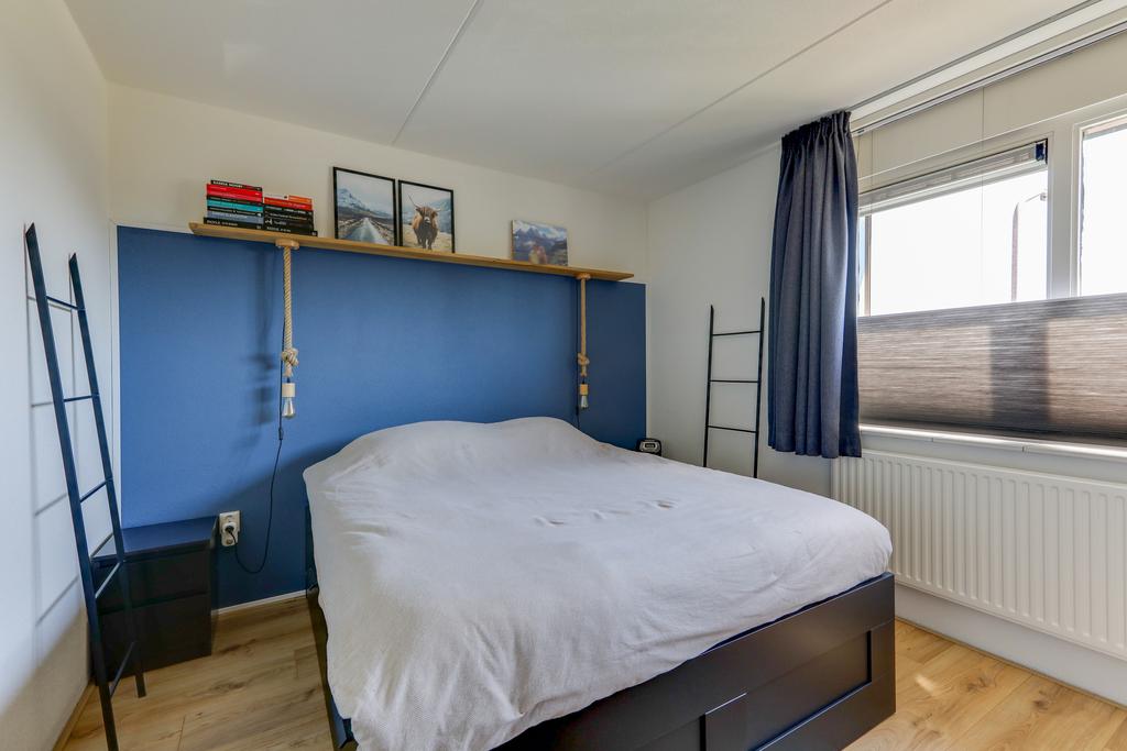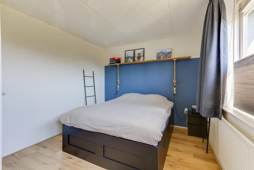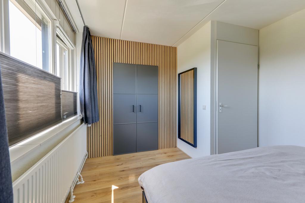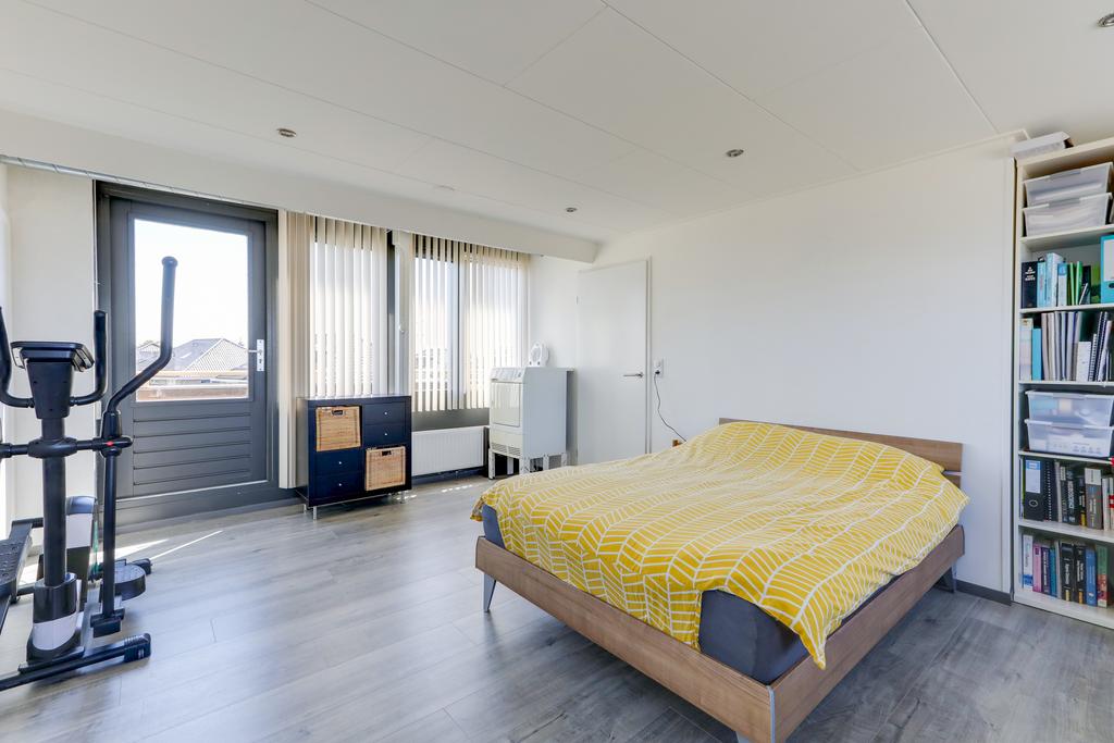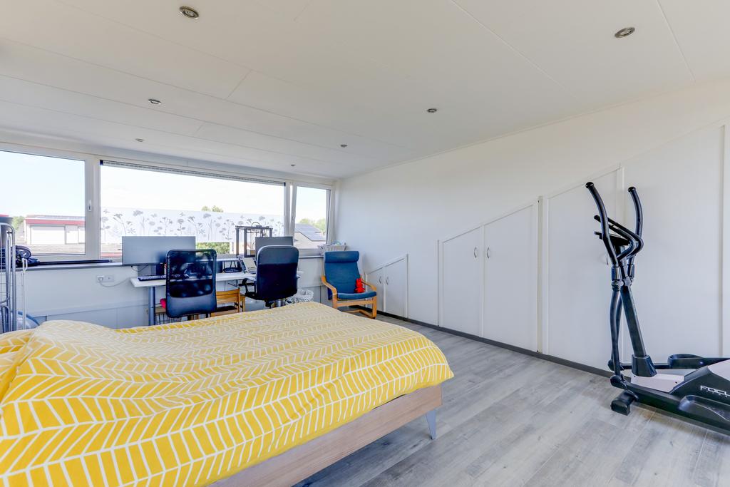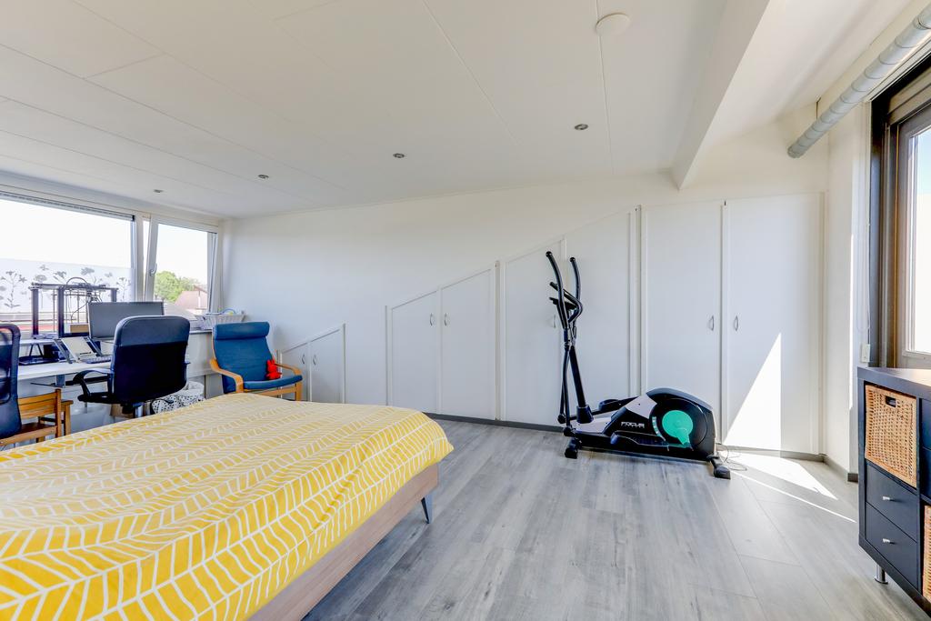 Grote 4e slaapkamer (werkkamer of hobbykamer, zelfs opsplitsen is mogelijk) doordat er in 2018 een dakkapel (in kunststof uitgevoerd, draai-/kiepramen met dubbele beglazing HR++, elektrische rolluiken en vlieghorren) is geplaatst. Deze grote en prettige ruimte heeft een vaste kastenwand, laminaatvloer en spotjes in het plafond. De zolder is extra aangenaam door de airco die is geplaatst in 2022. Vanuit deze slaapkamer is het balkon/dakterras van 7.7 m2 aan de voorzijde te bereiken.
