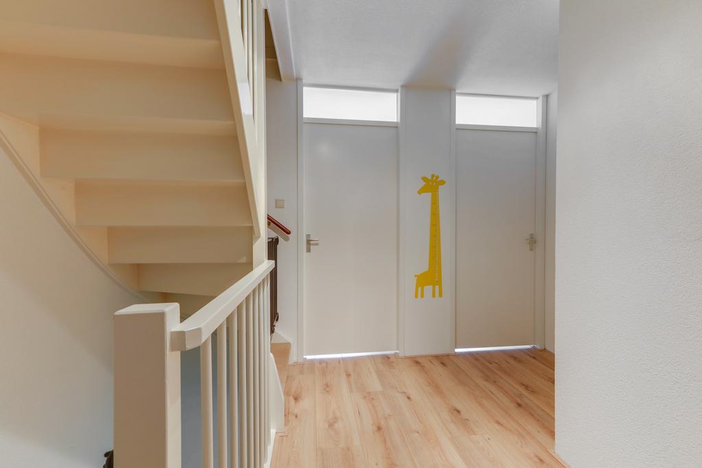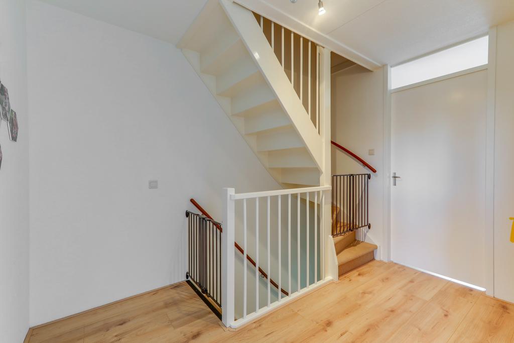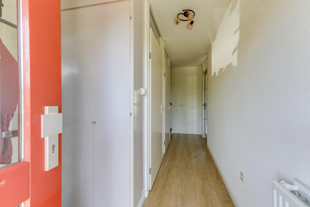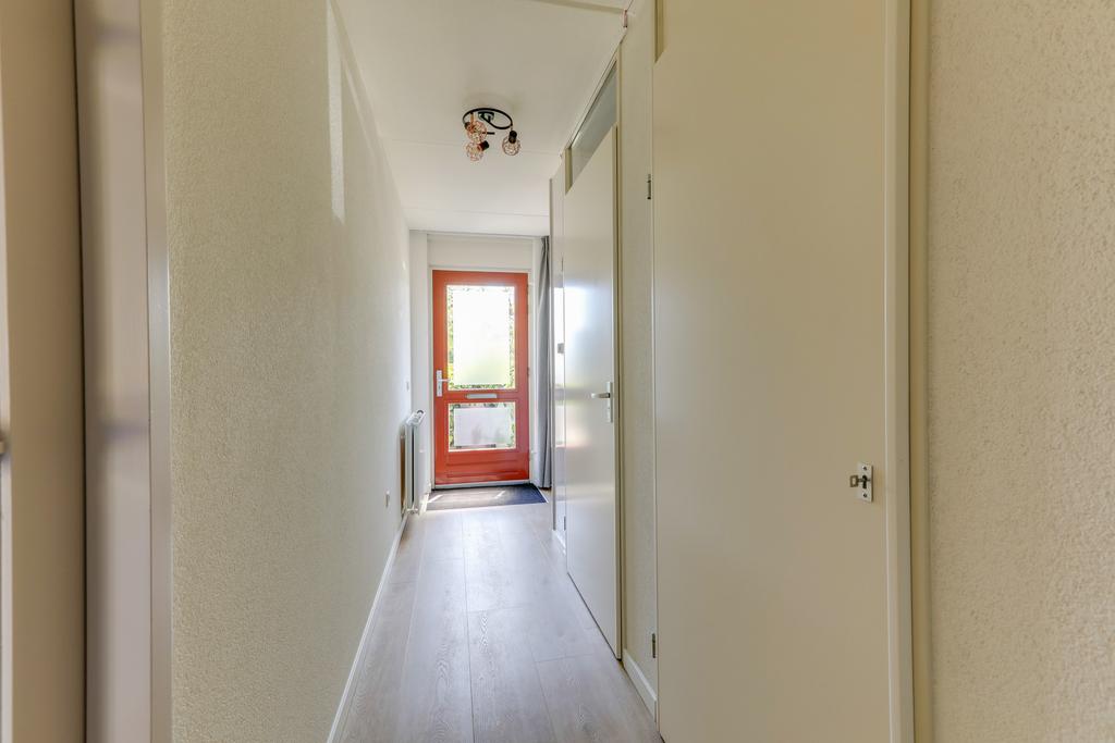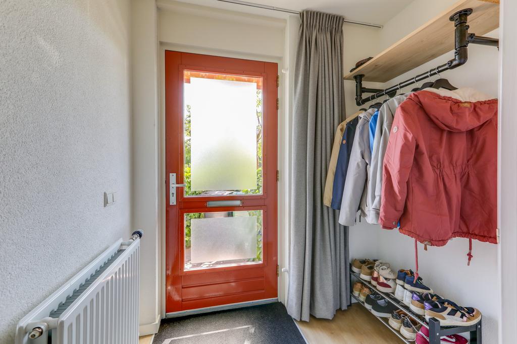 Overdekte entree en goed bemeten hal met garderobe, meterkast (automatenkast, stadsverwarming unit en watermeter), nette toiletruimte met zwevend toilet en fontein. Handig is de provisieruimte onder de trap, hier is de verdeler van de vloerverwarming geplaatst.