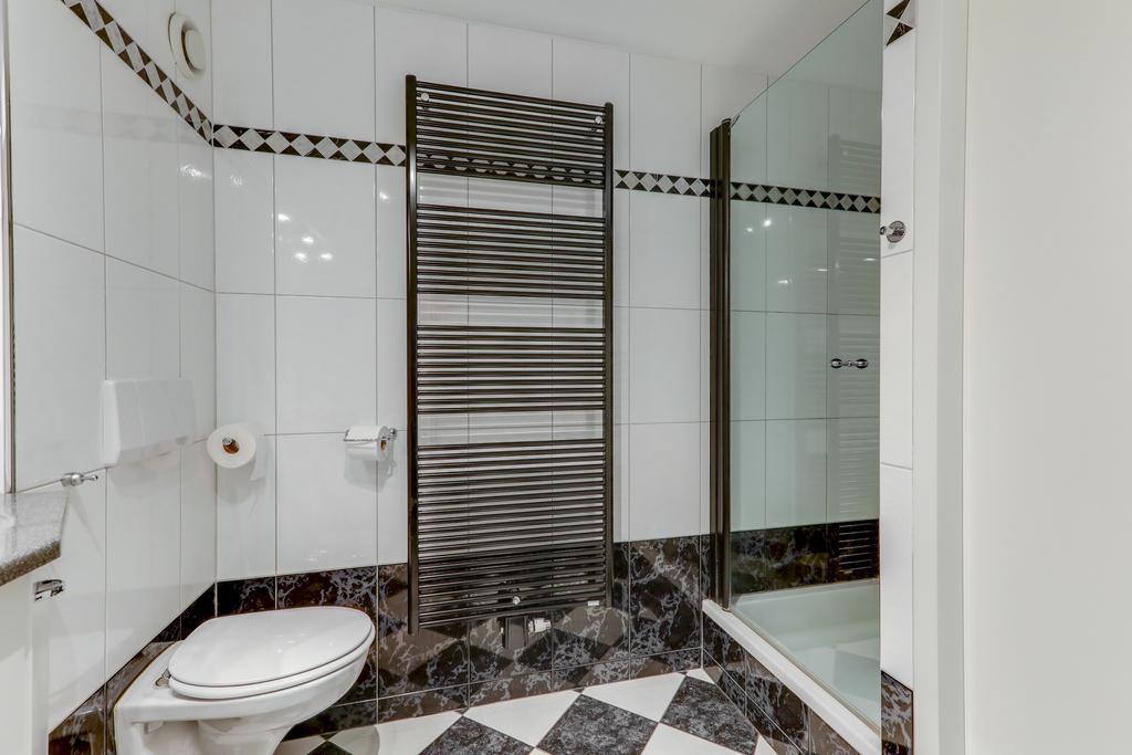 Complete en nette badkamer met ligbad, toilet, douche met glazendouche deur, design radiator, dubbele vaste wastafel in meubel en met spiegelkast.