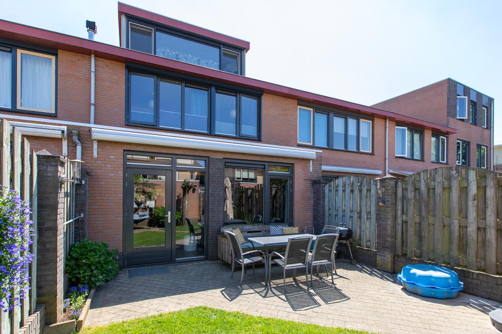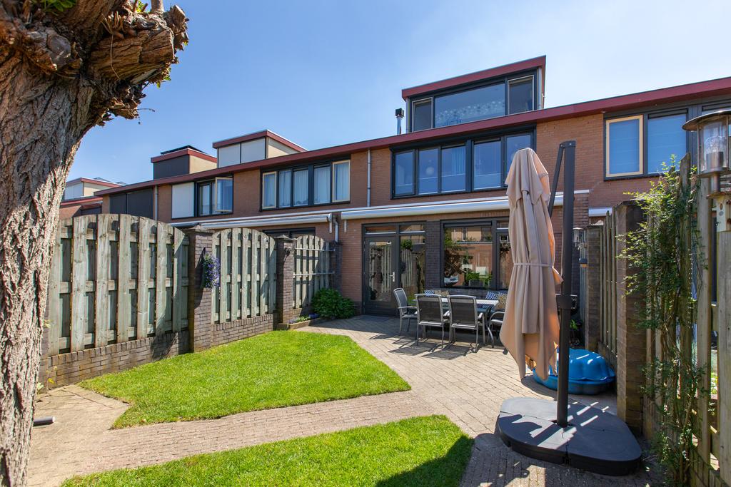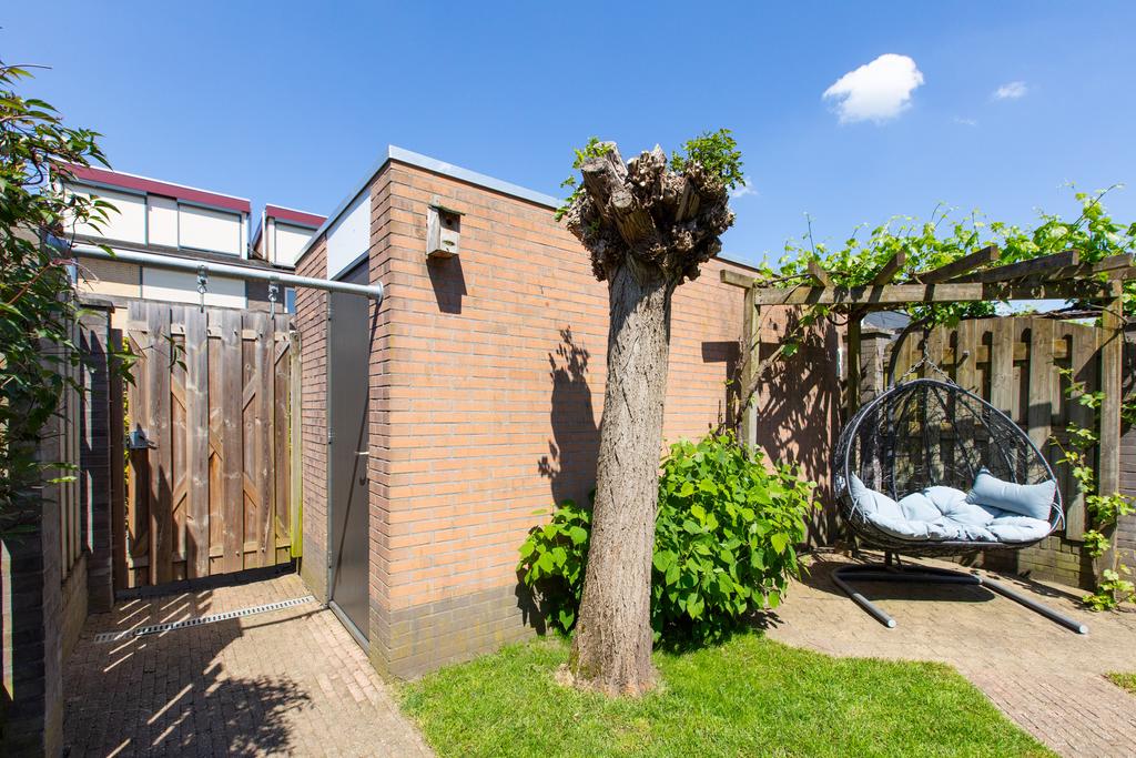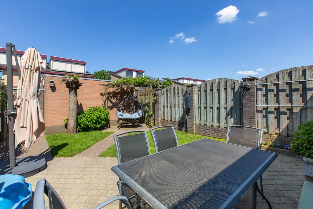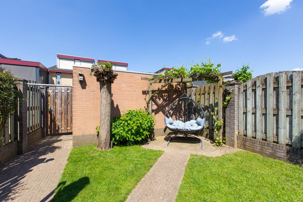 Via de woonkamer is de zonnige achtertuin te bereiken. Aan de woonkamerzijde is een groot terras, pad naar tweede zitje en 2 keer een stukje gazon. Er zijn degelijke erfafscheidingen en als de boom uitloopt een extra schaduw plek. De berging is ruimer als standaard (10.1 m2) en er is een achterom naar het achtergelegen pad.