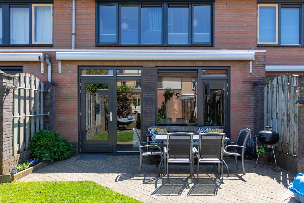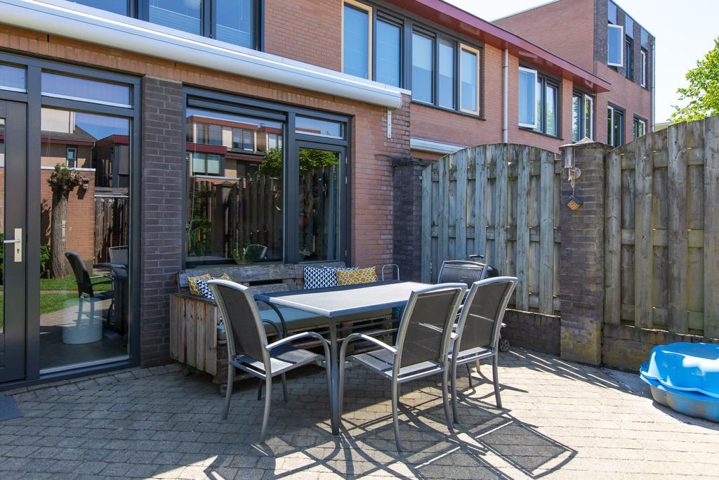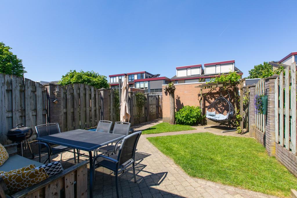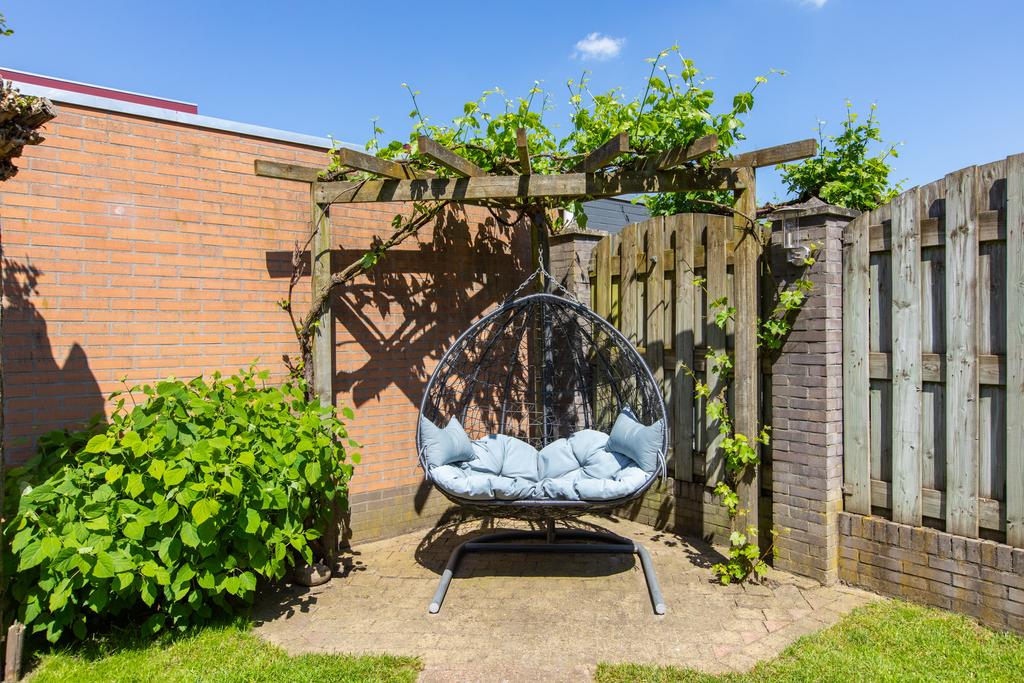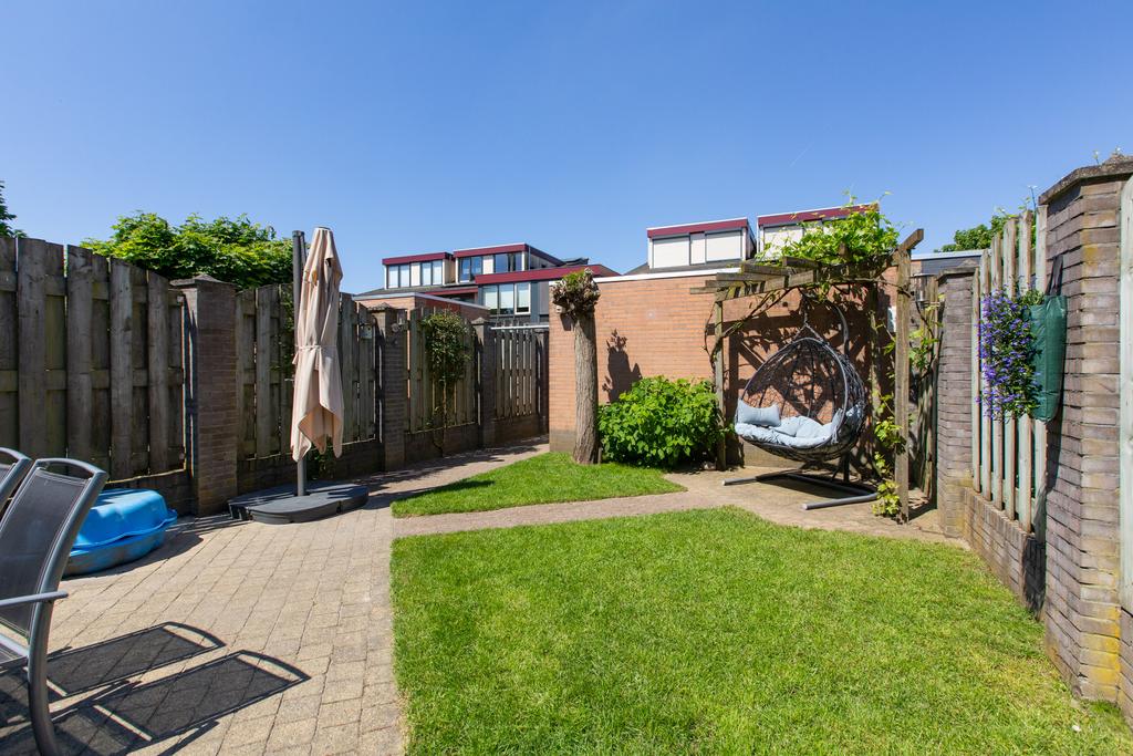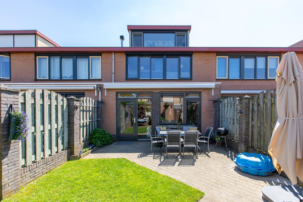 Via de woonkamer is de zonnige achtertuin te bereiken. Aan de woonkamerzijde is een groot terras, pad naar tweede zitje en 2 keer een stukje gazon. Er zijn degelijke erfafscheidingen en als de boom uitloopt een extra schaduw plek. De berging is ruimer als standaard (10.1 m2) en er is een achterom naar het achtergelegen pad.