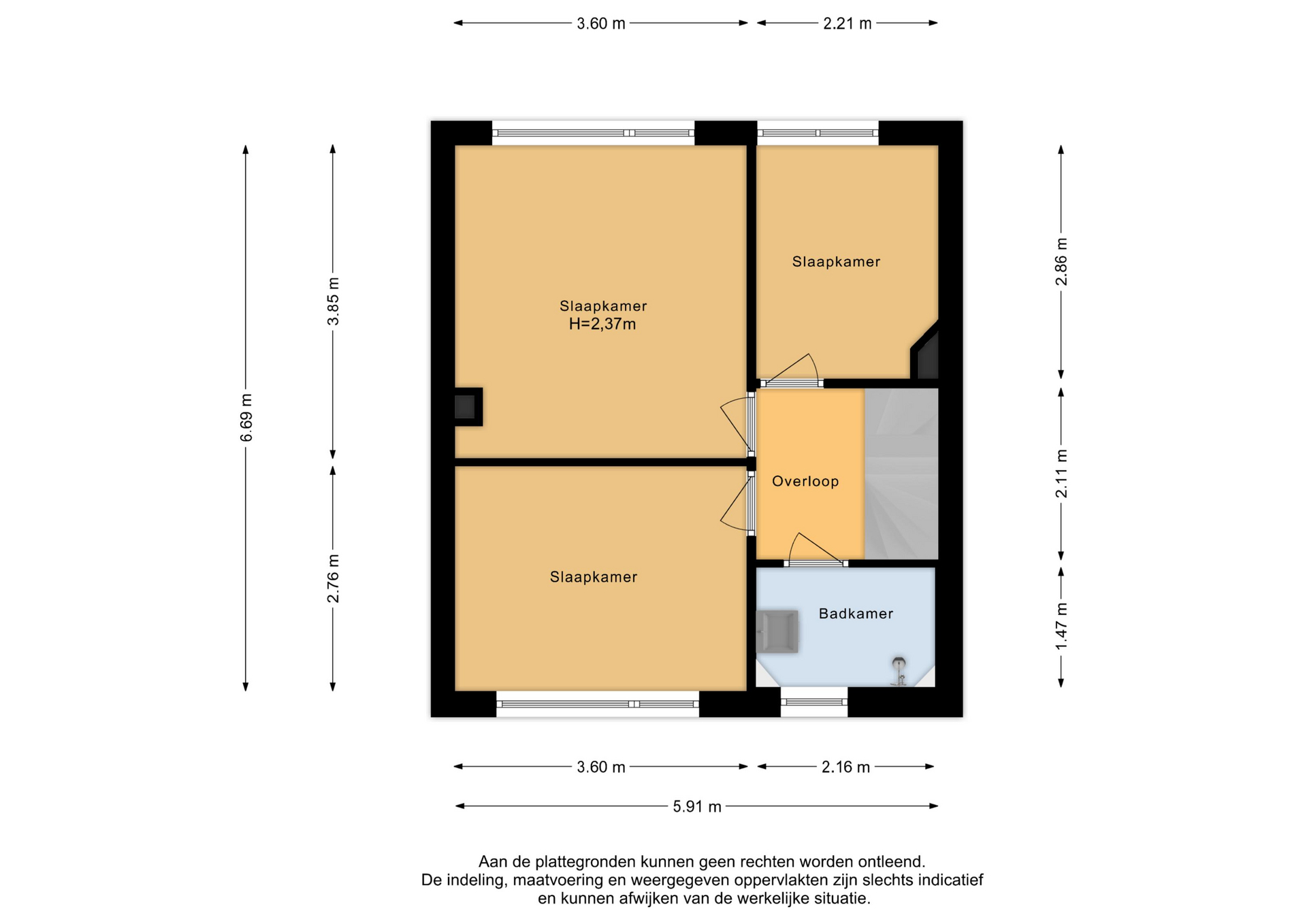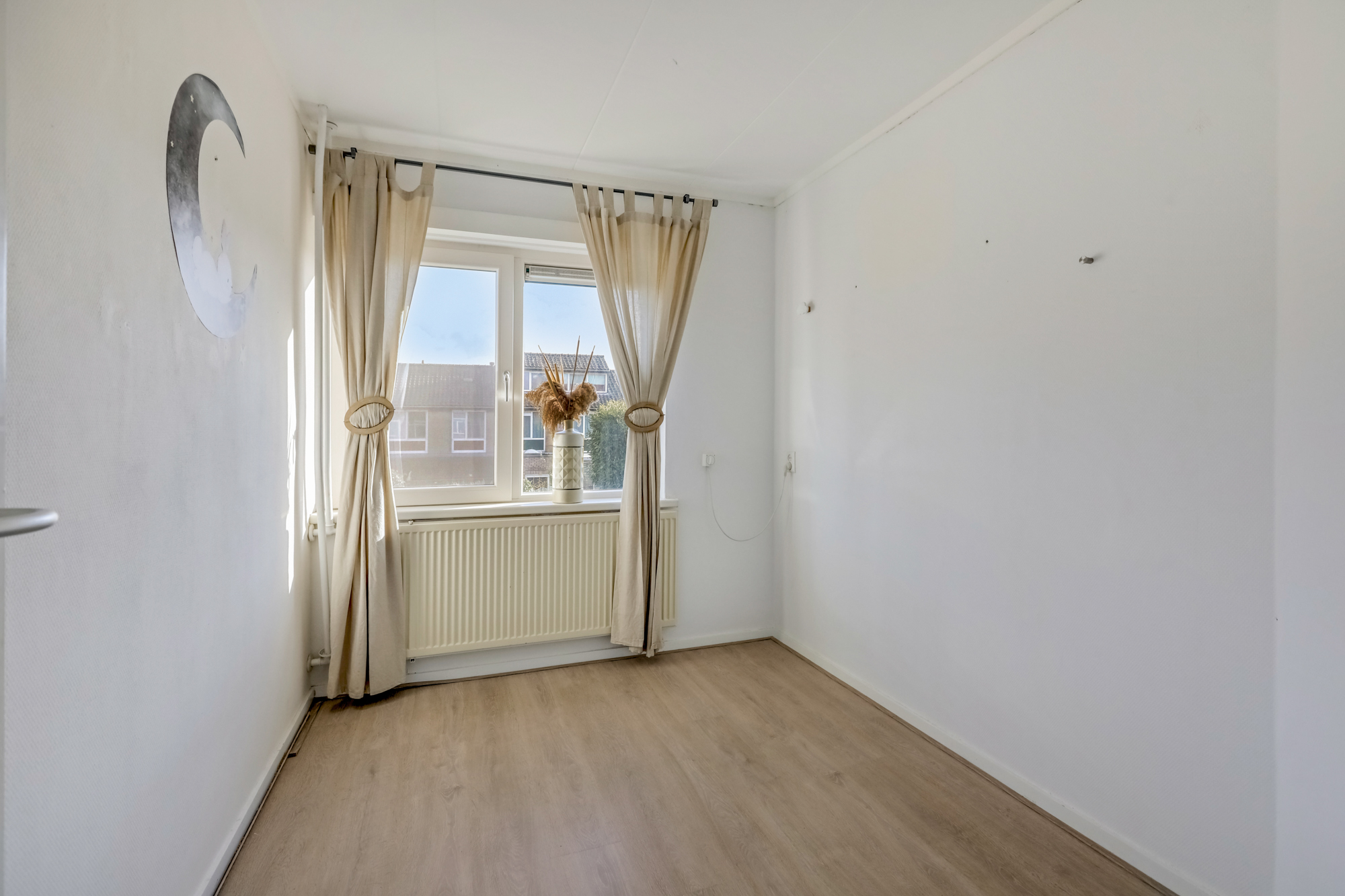 Op de eerste verdieping zijn drie slaapkamers en een badkamer met douche en wastafel. De slaapkamers zijn aan achterzijde voorzien van draai- kiepramen en horren.