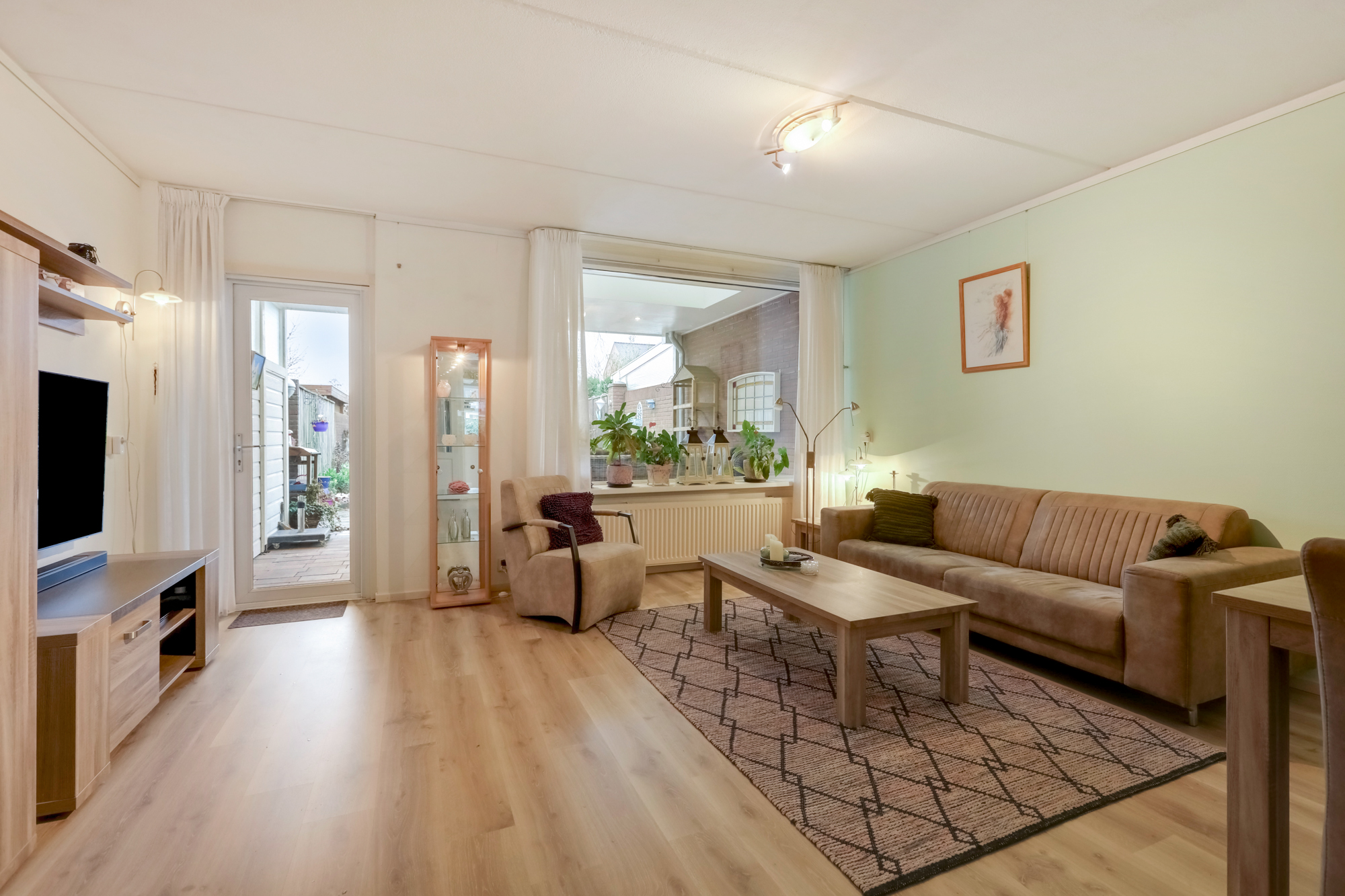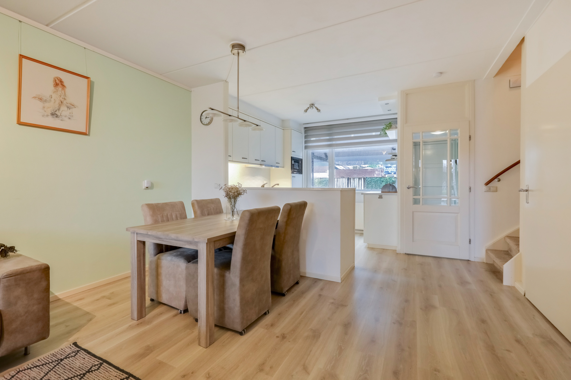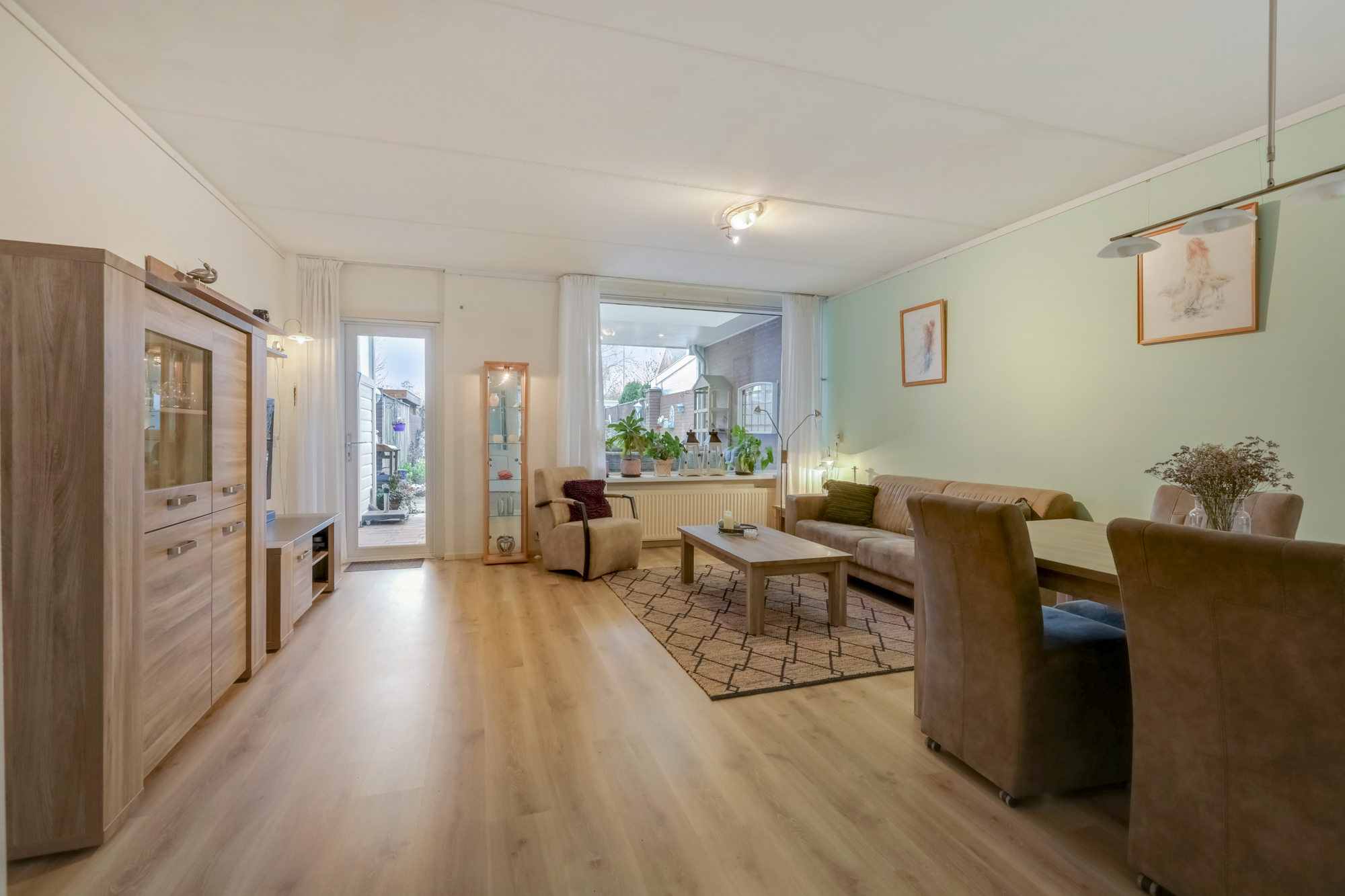 De woonkamer is voorzien van laminaatvloer en keurige wandafwerking. Het zitgedeelte is aan de tuinzijde en is licht en ruim van opzet. Er zijn meerdere mogelijkheden om de woonkamer in te delen en handig is de provisieruimte onder de trap.