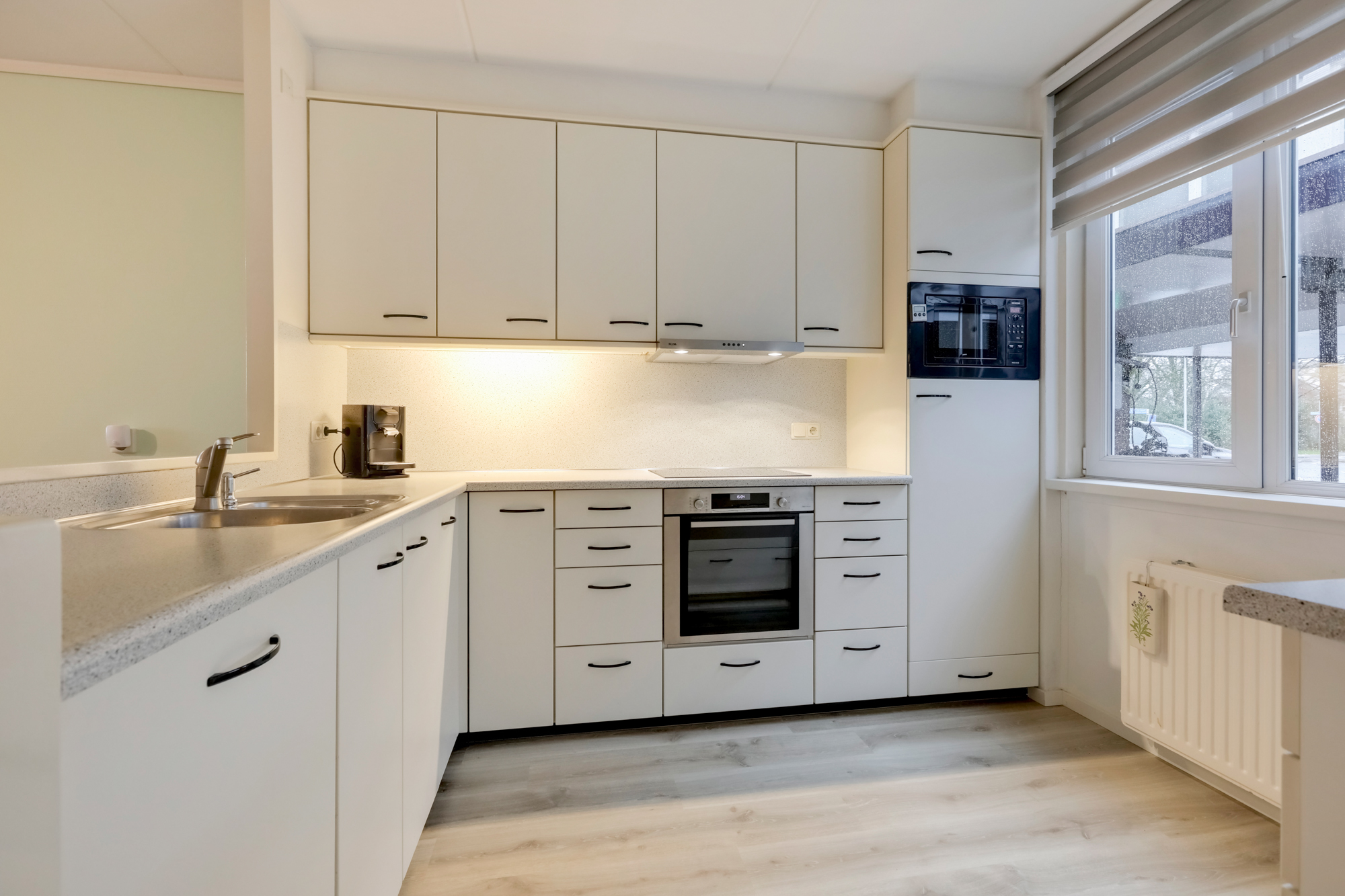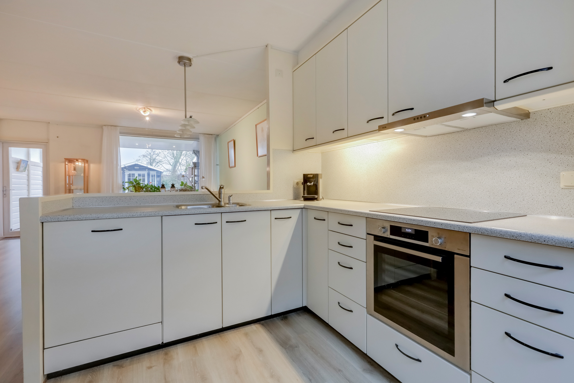 De lichte moderne keuken ligt aan de voorzijde, is in hoekopstelling en heeft hierdoor veel werk- en kastruimte. De keuken is voorzien van inbouwapparatuur te weten: vaatwasser, inductiekookplaat, afzuigkap, oven, combimagnetron en koelkast. Een gedeelte van de inbouw apparatuur is in 2023/2024 vervangen.