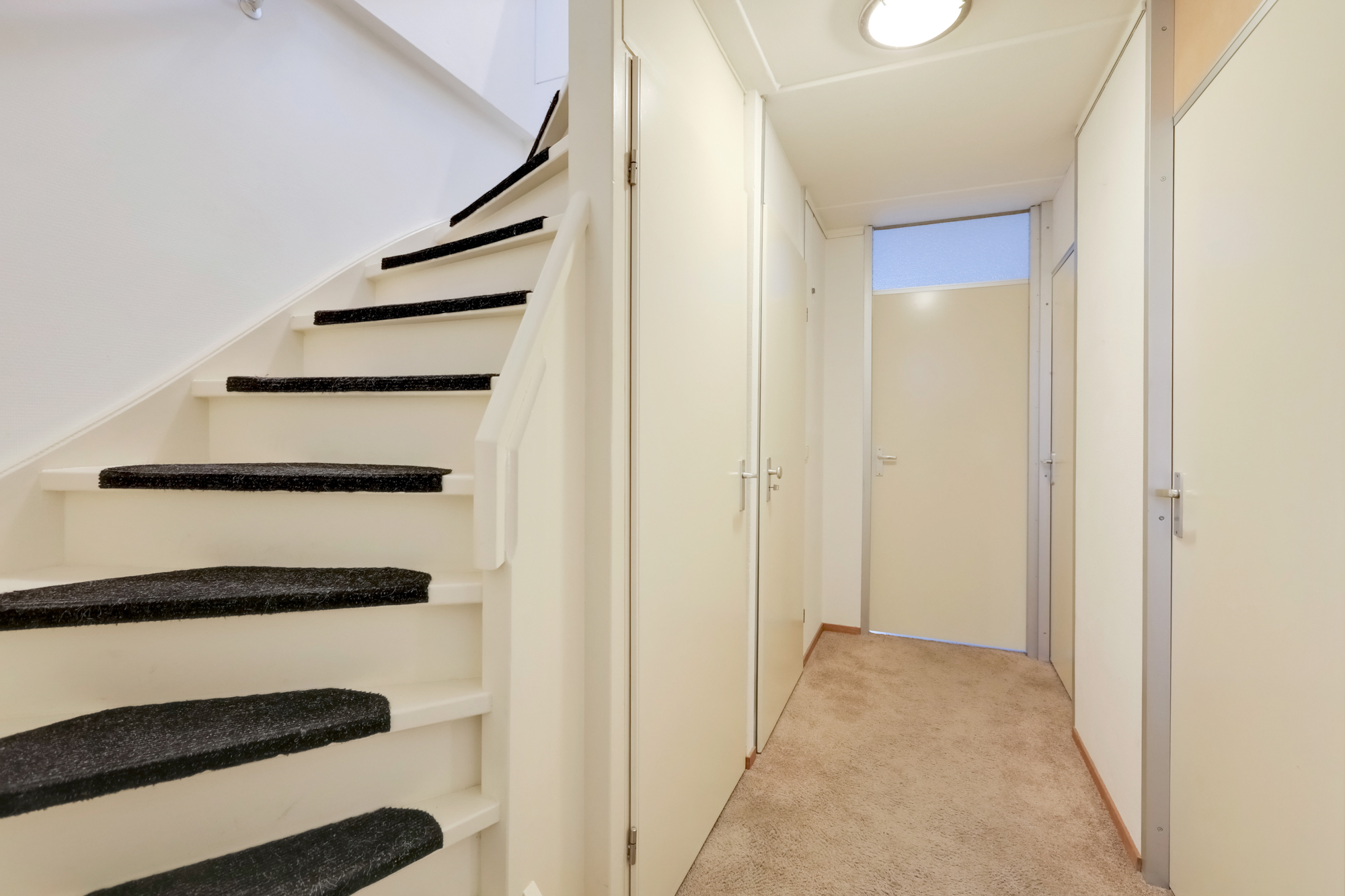 Overloop met vaste inbouwkast en 3 slaapkamers. Slaapkamer 1 (12.1 m2) ligt aan de voorzijde en is voorzien van een vaste kast met schuif(spiegel)deuren en nieuw rolluik. Slaapkamer 2 is 12 m2 groot en heeft een screen en uitzicht op de tuin. Slaapkamer 3 (6.6 m2) is nu in gebruik als waskamer (aansluitingen voor de wasapparatuur aanwezig) en ligt net als slaapkamer 2 aan de tuinzijde.