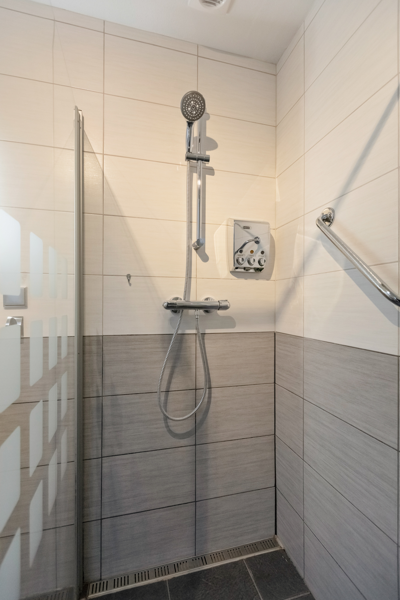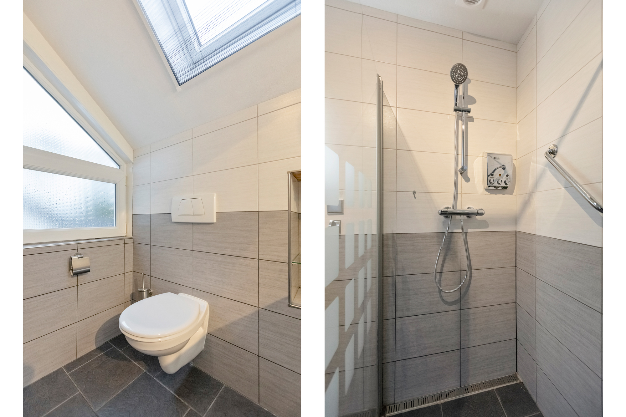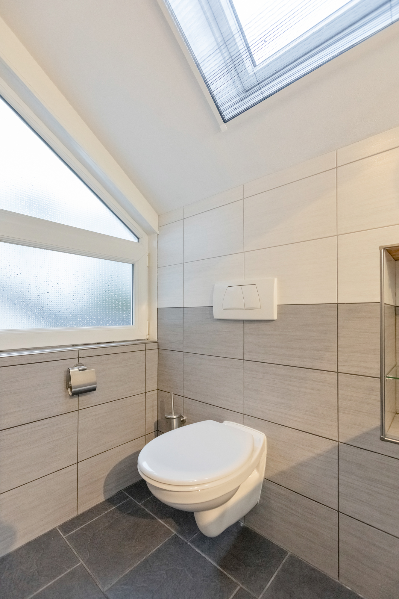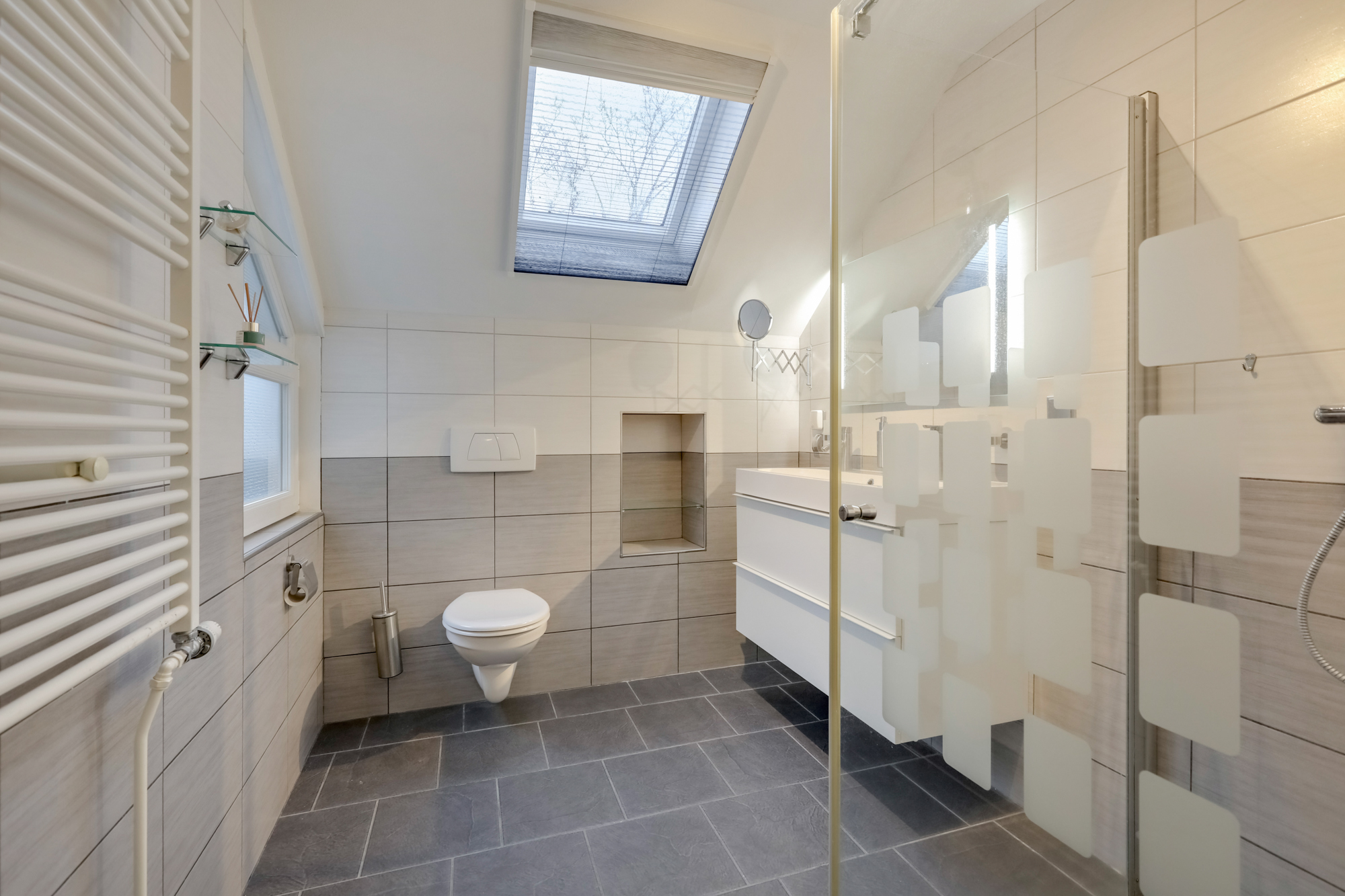 De royale badkamer is in 2017 vernieuwd en voorzien van zwevend toilet, inloopdouche (met 2 glazenwanden en draingoot), afzuiging en breed wastafelmeubel met wastafel voorzien van 2 kranen en spiegel. Er is naast het kunststof zijraam ook een onderhoudsarm Velux dakraam geplaatst.