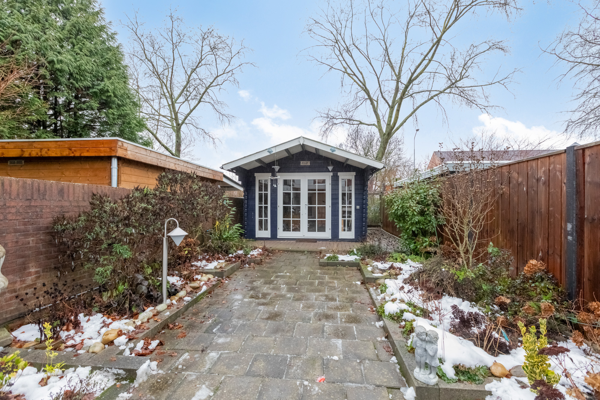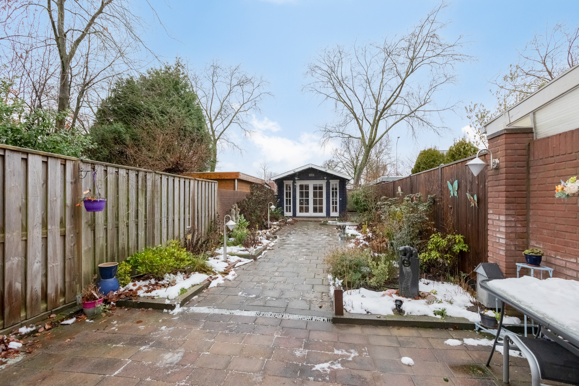 De diepe achtertuin van een goede 21 meter met tuinberging.