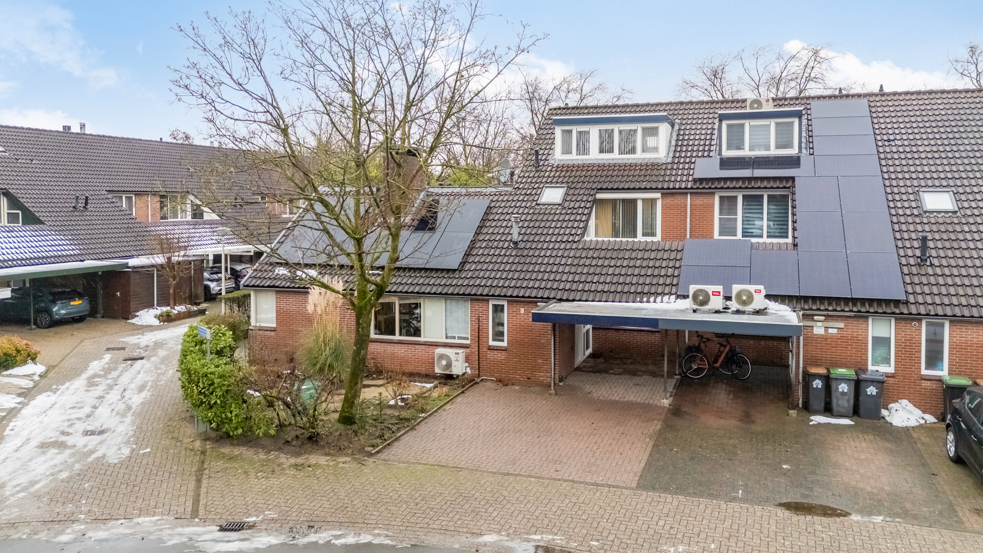 Aan autoluwe straat gelegen tussenwoning met oprit voor 2 auto’s, carport, stenen berging, 4 slaapkamers en erg diepe achtertuin met grote overkapping aan woonkamerzijde, tuinberging achter in de tuin.