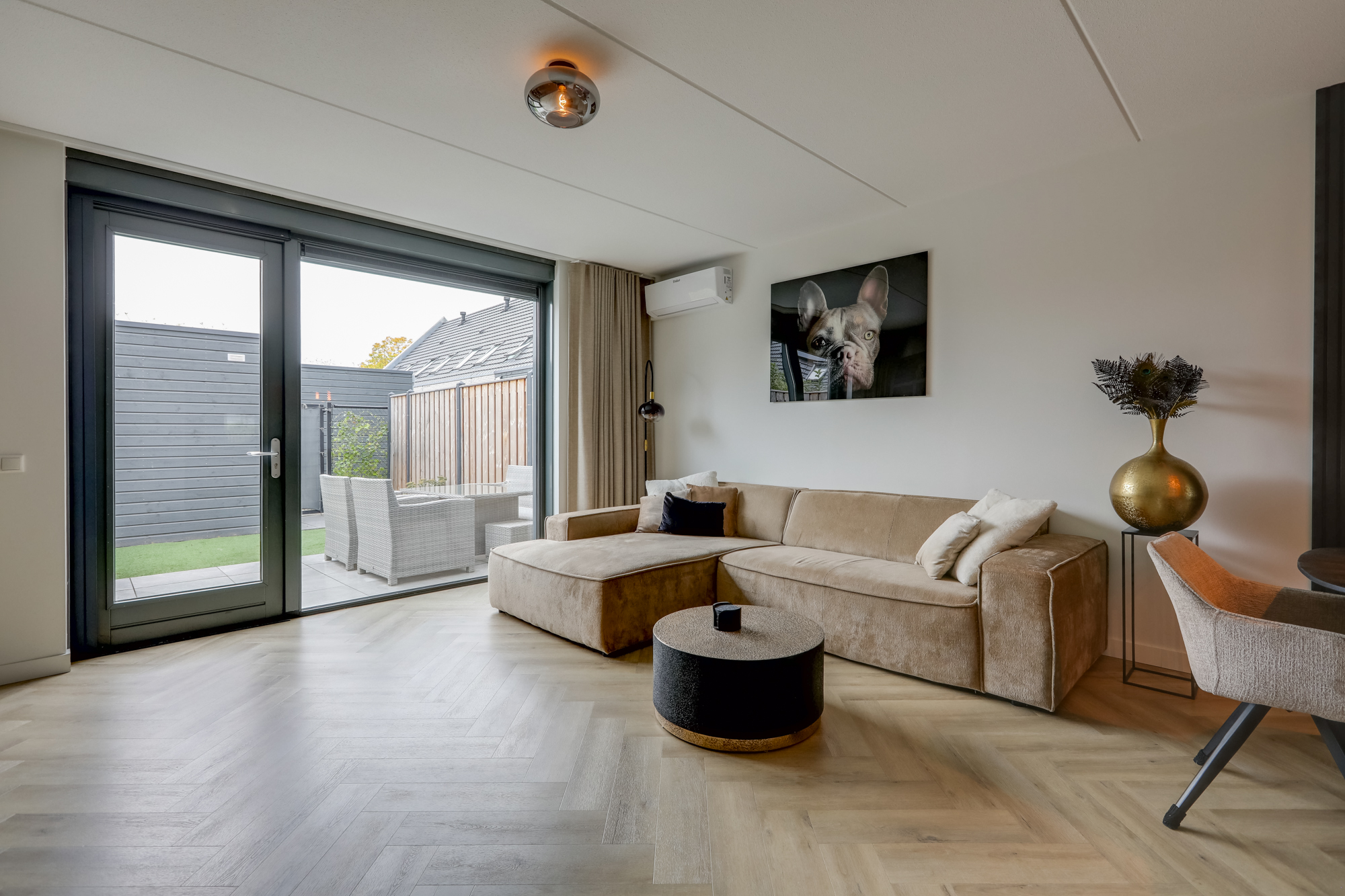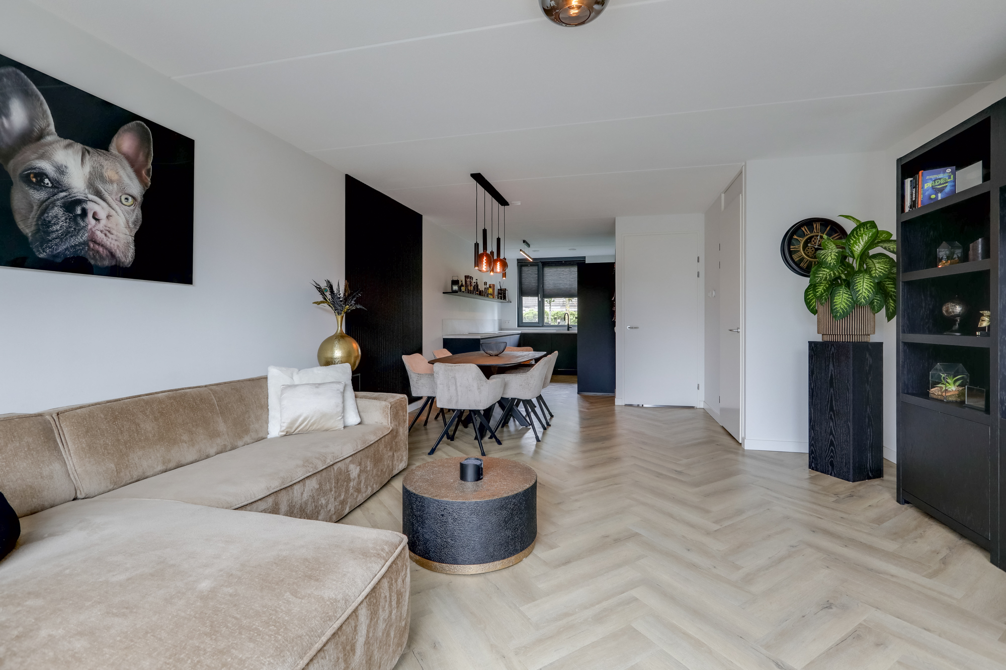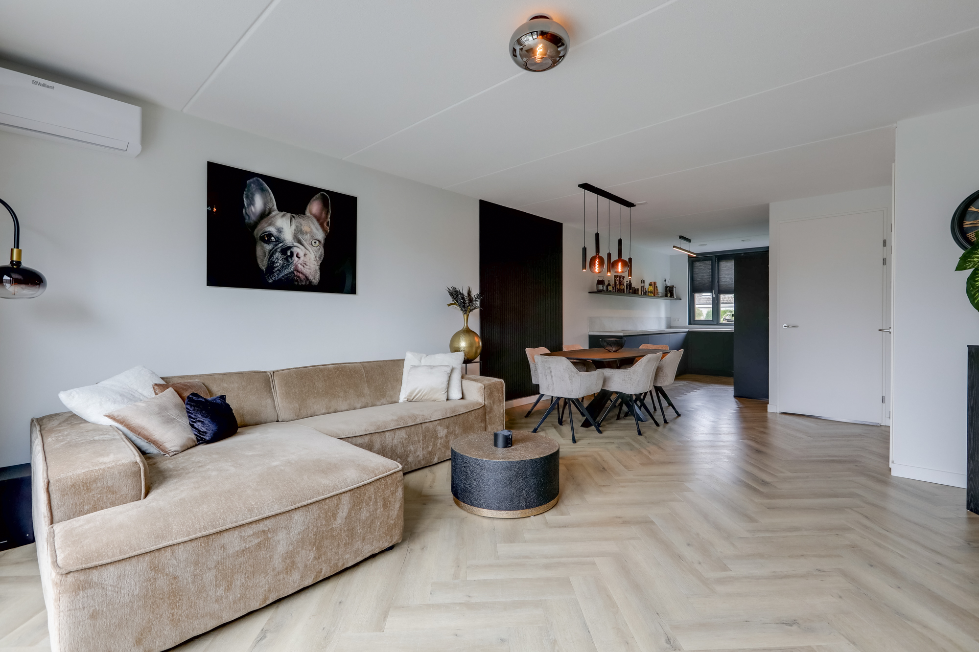 Je komt binnen in een ruime hal met moderne toiletruimte en meterkast. Vanuit hier stap je de royale, uitgebouwde woonkamer in. De PVC-visgraatvloer met vloerverwarming zorgt voor een warme, luxe uitstraling en optimaal wooncomfort. De wanden zijn compleet gestukadoord en voorzien van vliesbehang en daarna af gesausd.