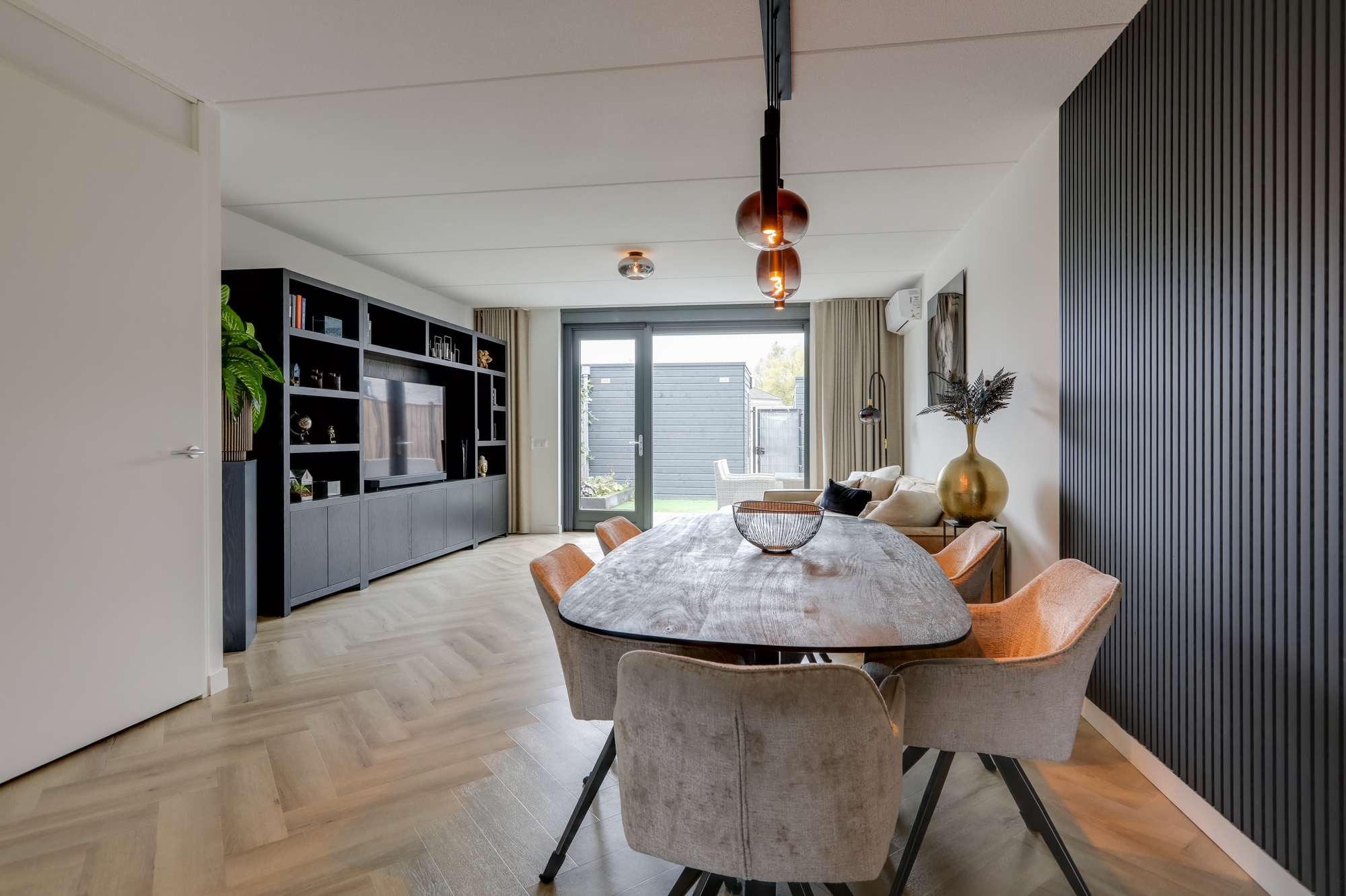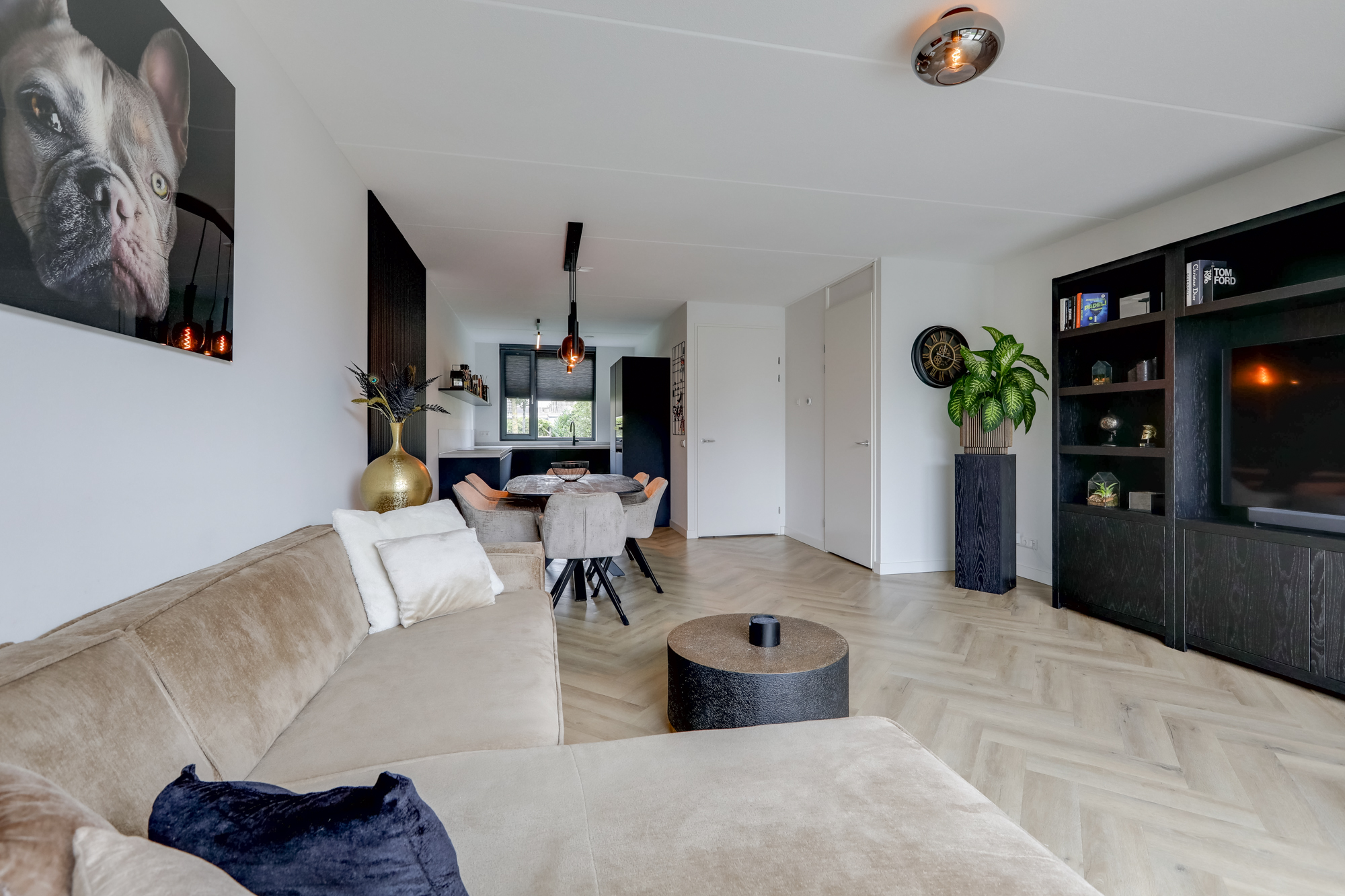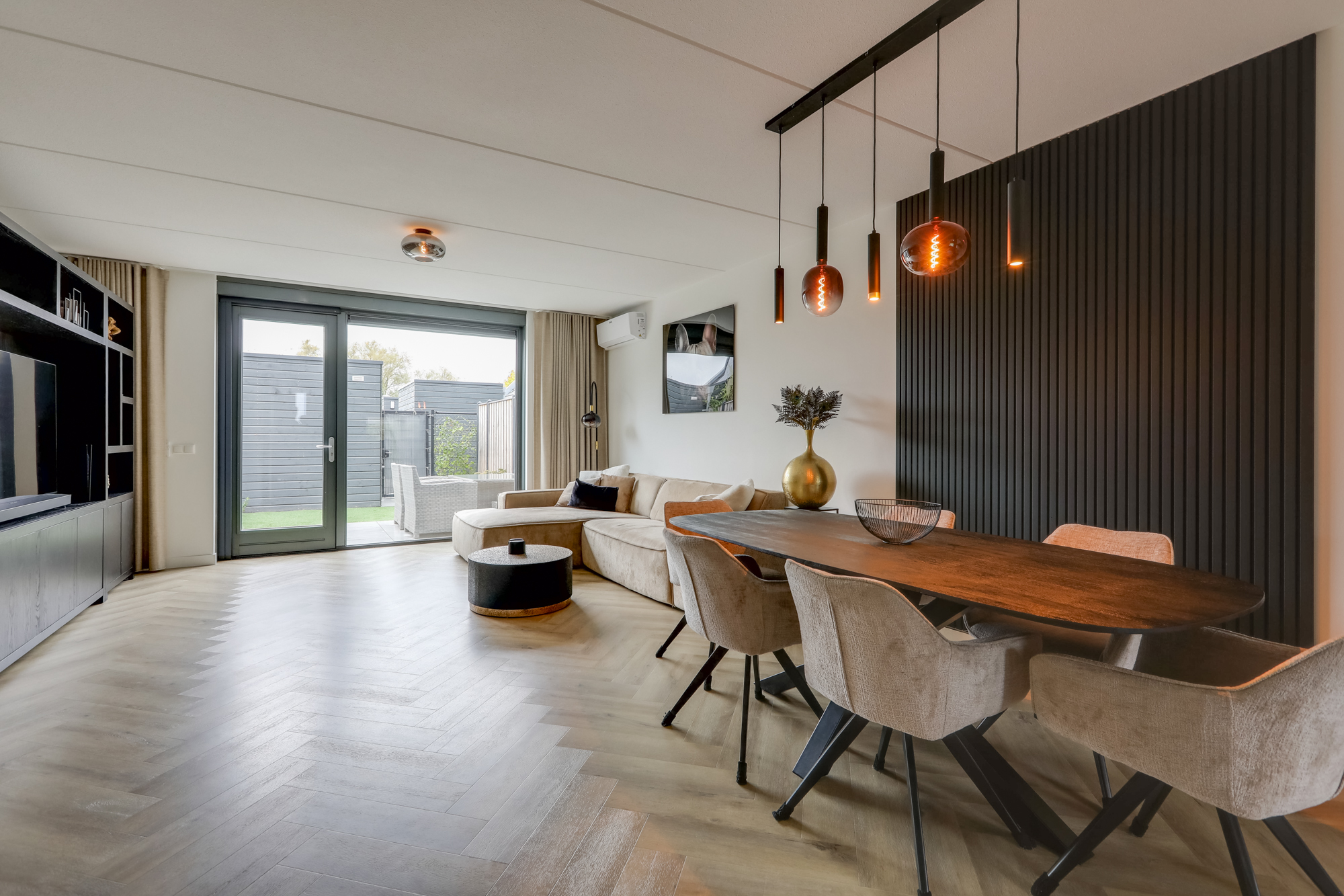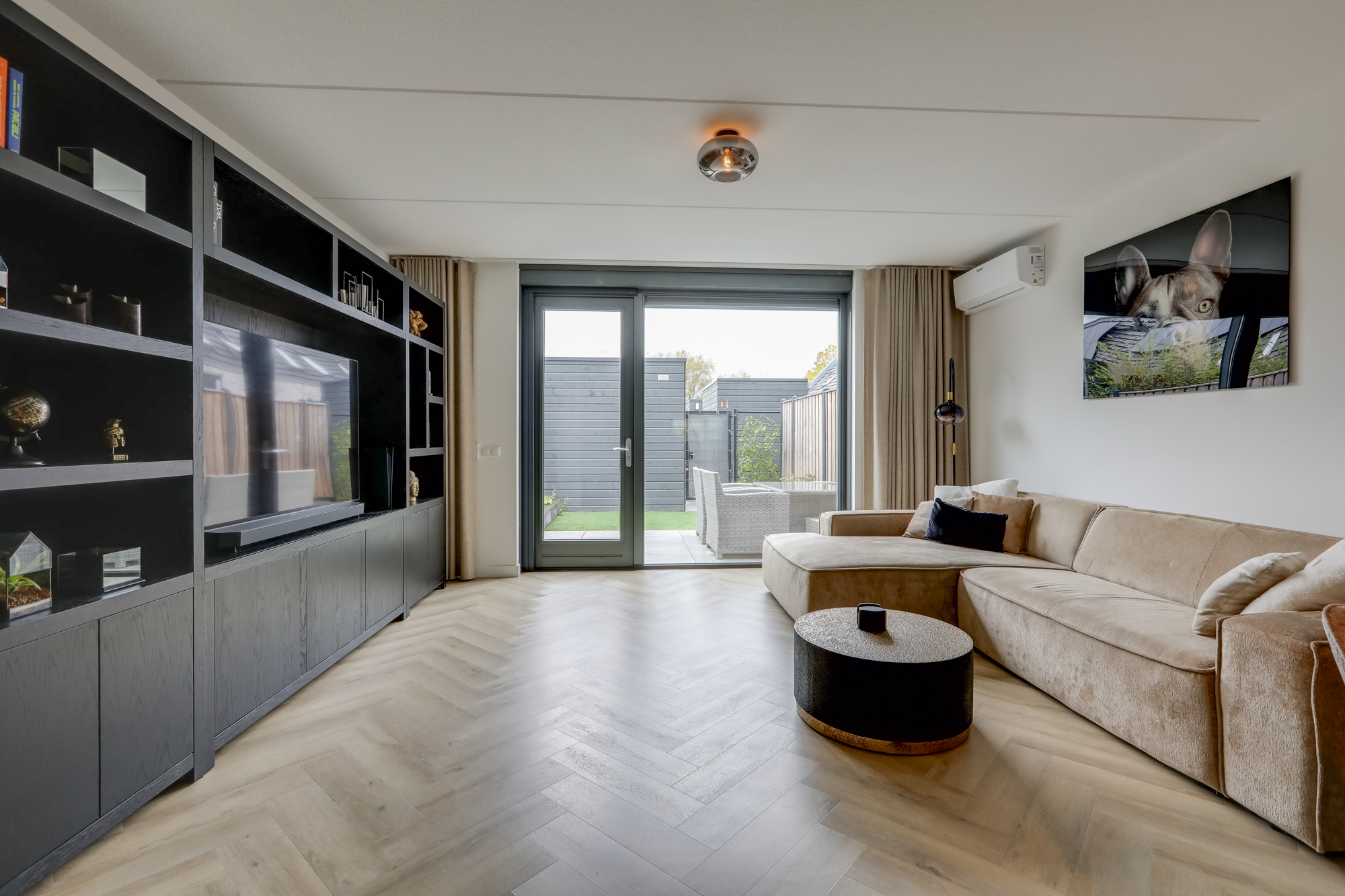 Je komt binnen in een ruime hal met moderne toiletruimte en meterkast. Vanuit hier stap je de royale, uitgebouwde woonkamer in. De PVC-visgraatvloer met vloerverwarming zorgt voor een warme, luxe uitstraling en optimaal wooncomfort. De wanden zijn compleet gestukadoord en voorzien van vliesbehang en daarna af gesausd.