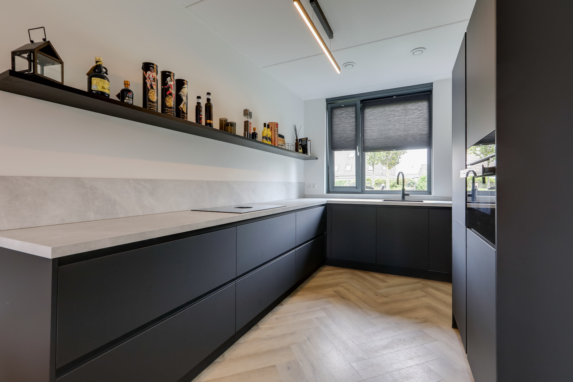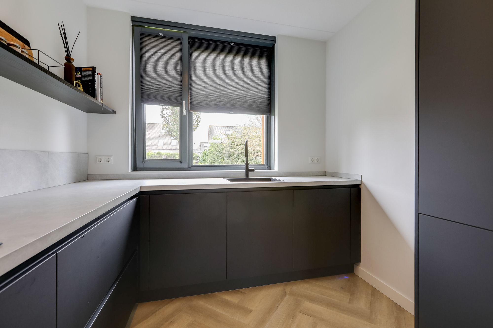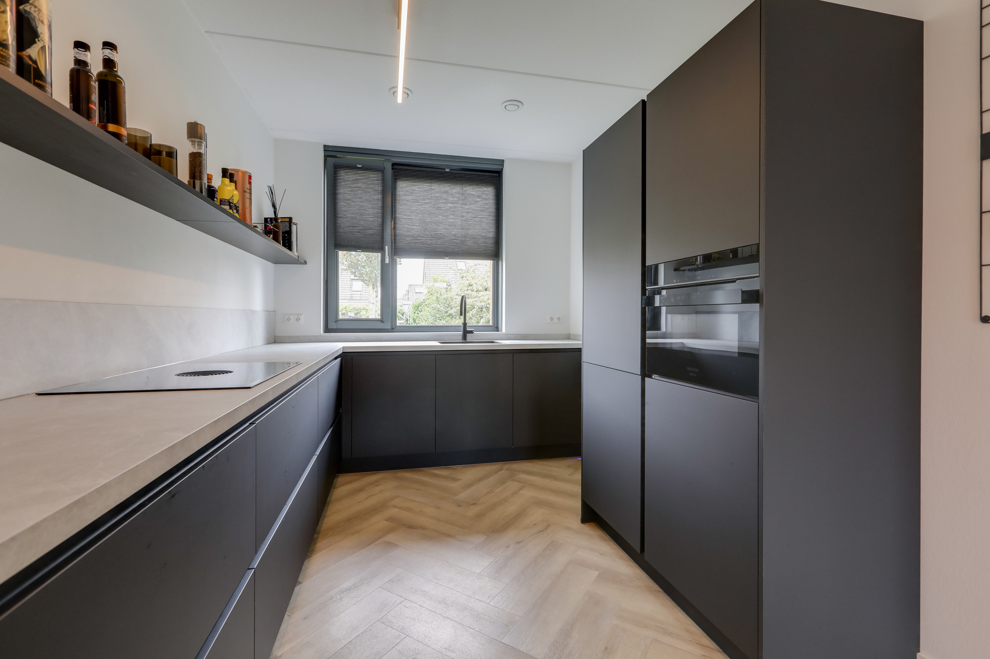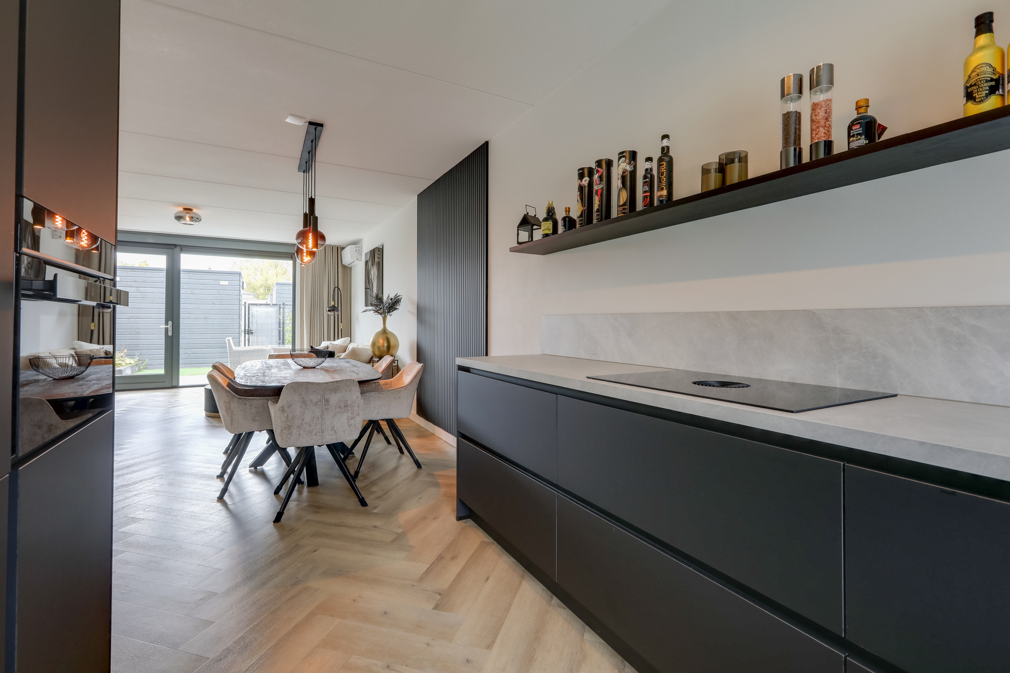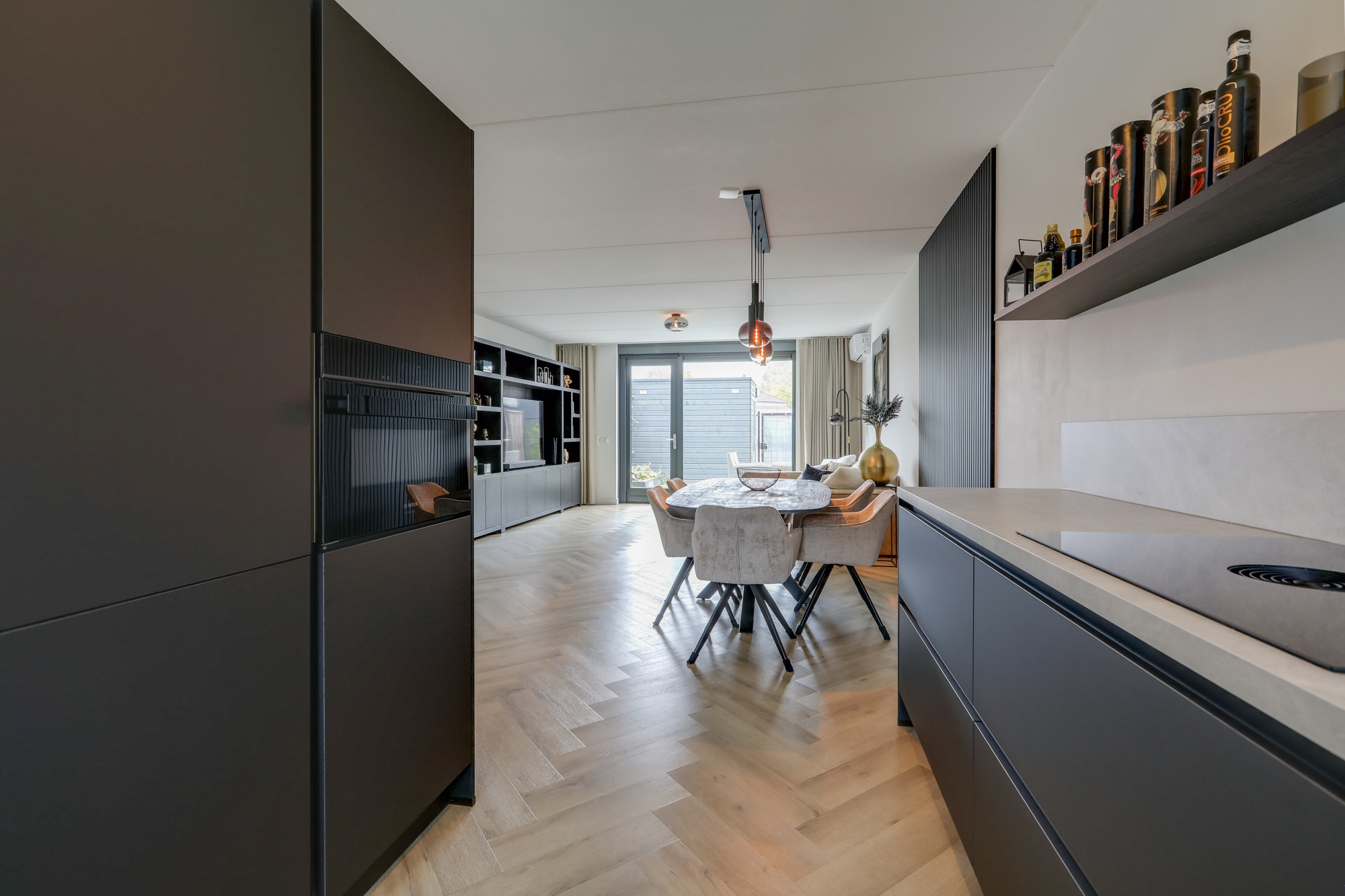 Aan de voorzijde bevindt zich de prachtige hoekkeuken, volledig uitgerust met hoogwaardige inbouwapparatuur: een vaatwasser, koelkast, vriezer, combi-oven/magnetron, Quooker en een Bora-kooksysteem met geïntegreerde afzuiging. Alles voor de echte kookliefhebber!