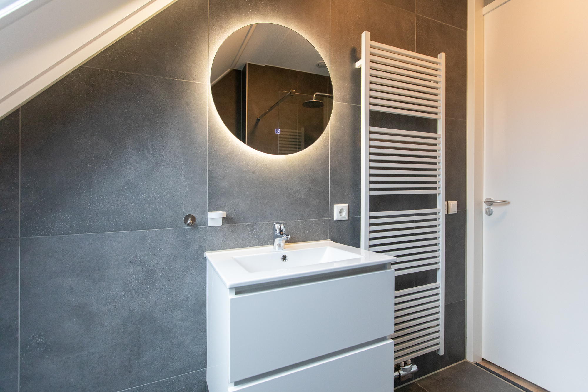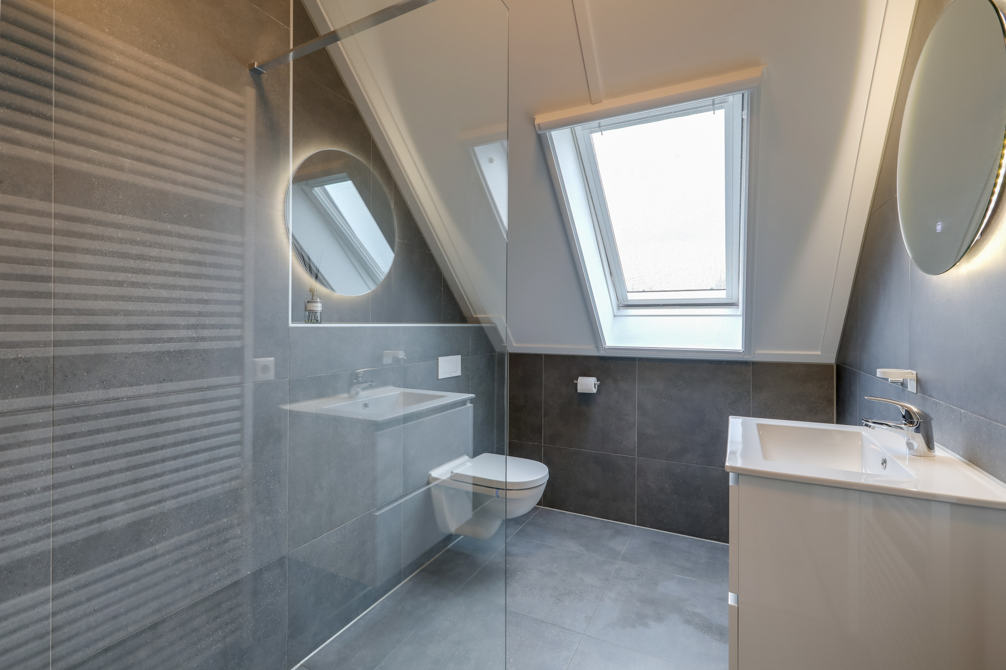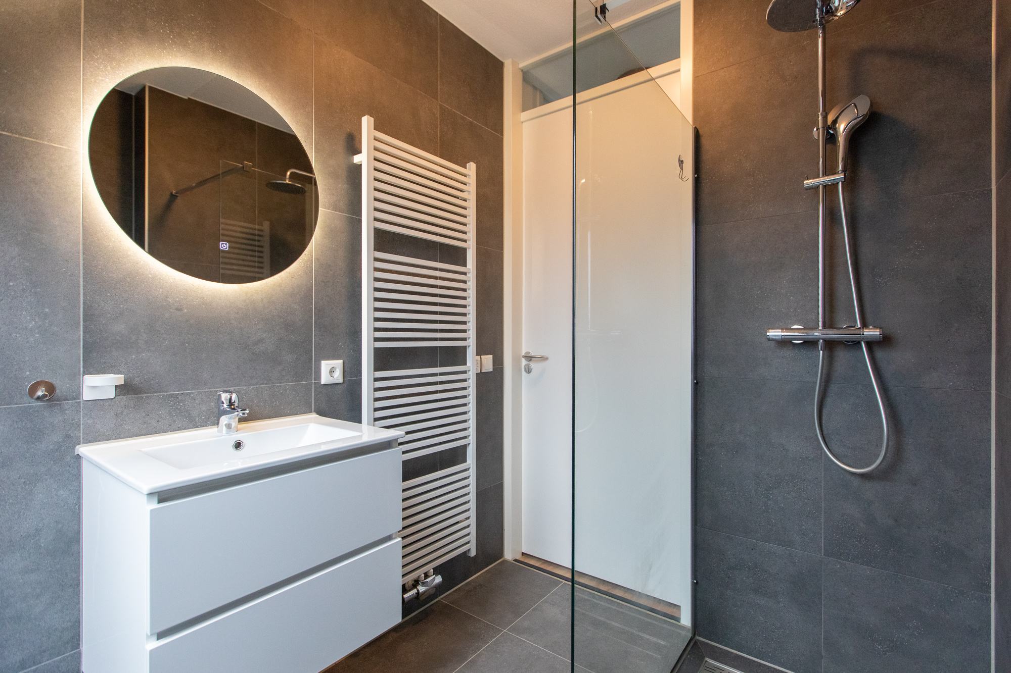 De moderne badkamer is volledig in stijl met de rest van de woning: afgewerkt met grote, eigentijdse tegels en voorzien van een inloopdouche, tweede toilet, wastafelmeubel en mechanische ventilatie.