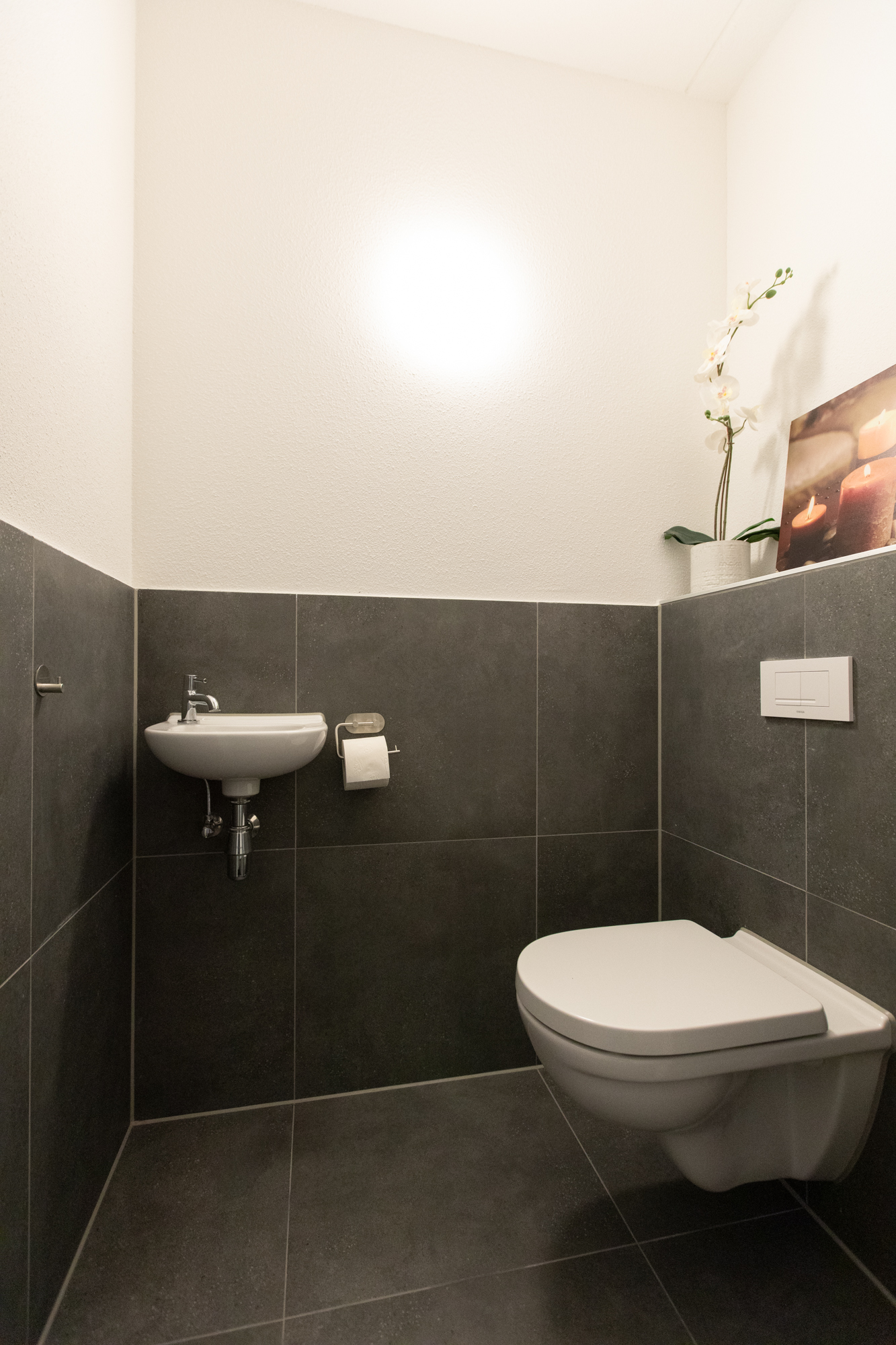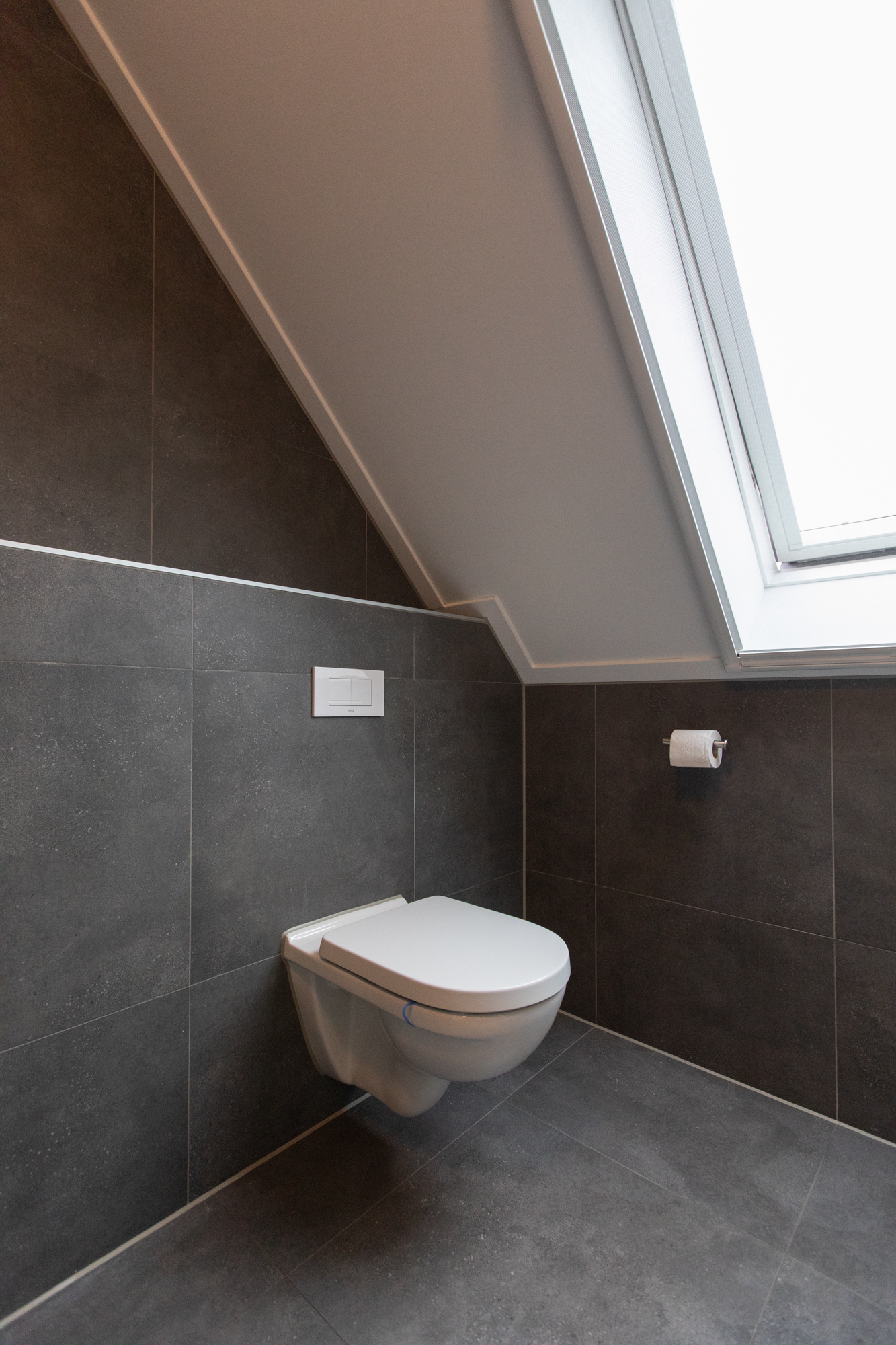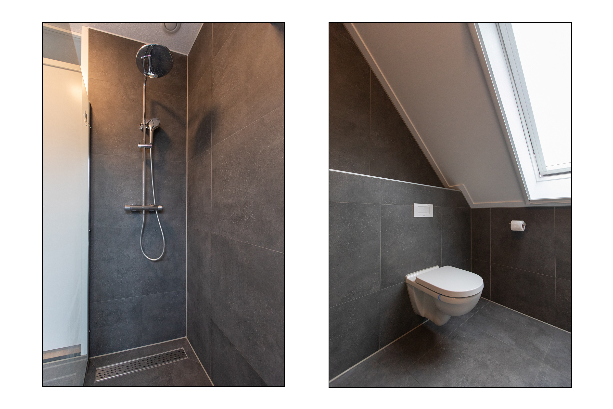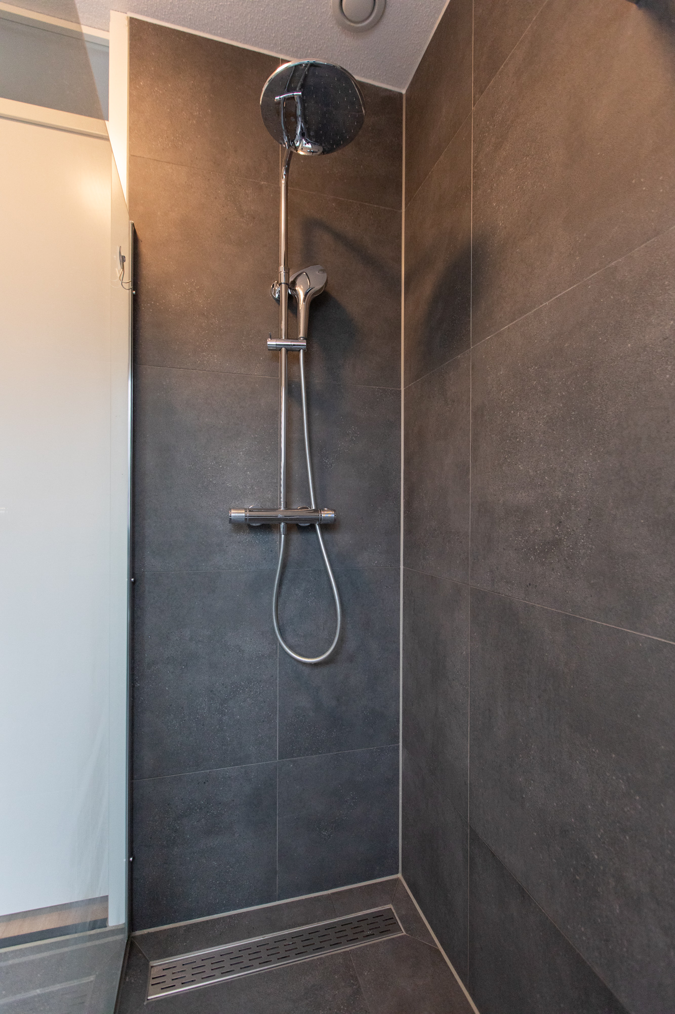 De moderne badkamer is volledig in stijl met de rest van de woning: afgewerkt met grote, eigentijdse tegels en voorzien van een inloopdouche, tweede toilet, wastafelmeubel en mechanische ventilatie.