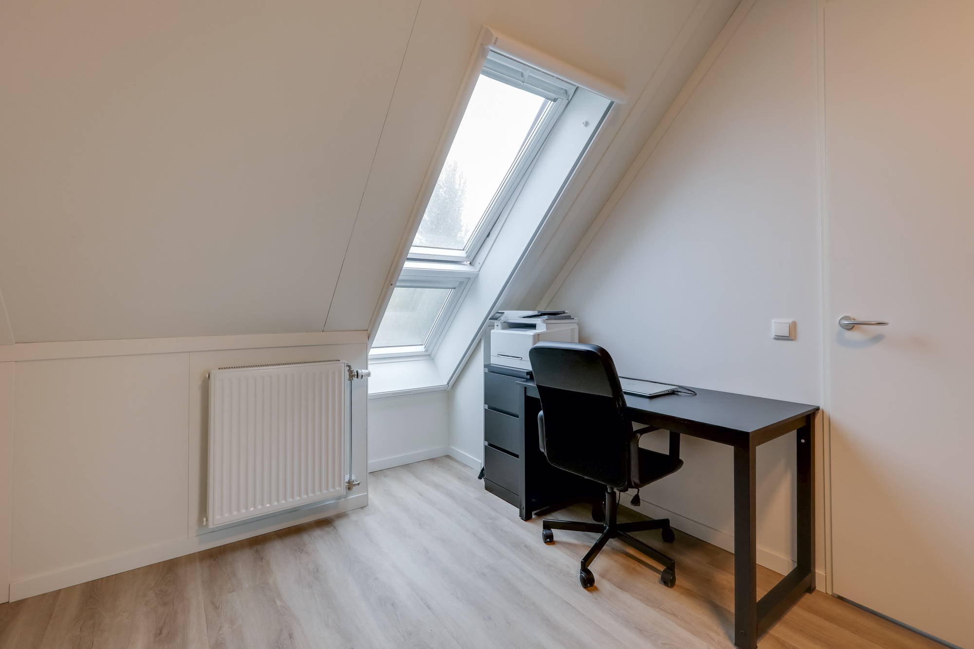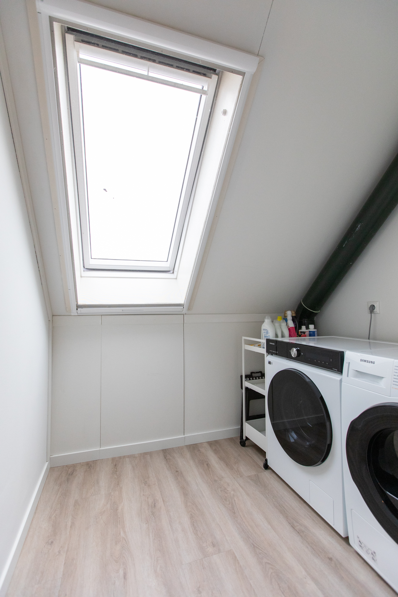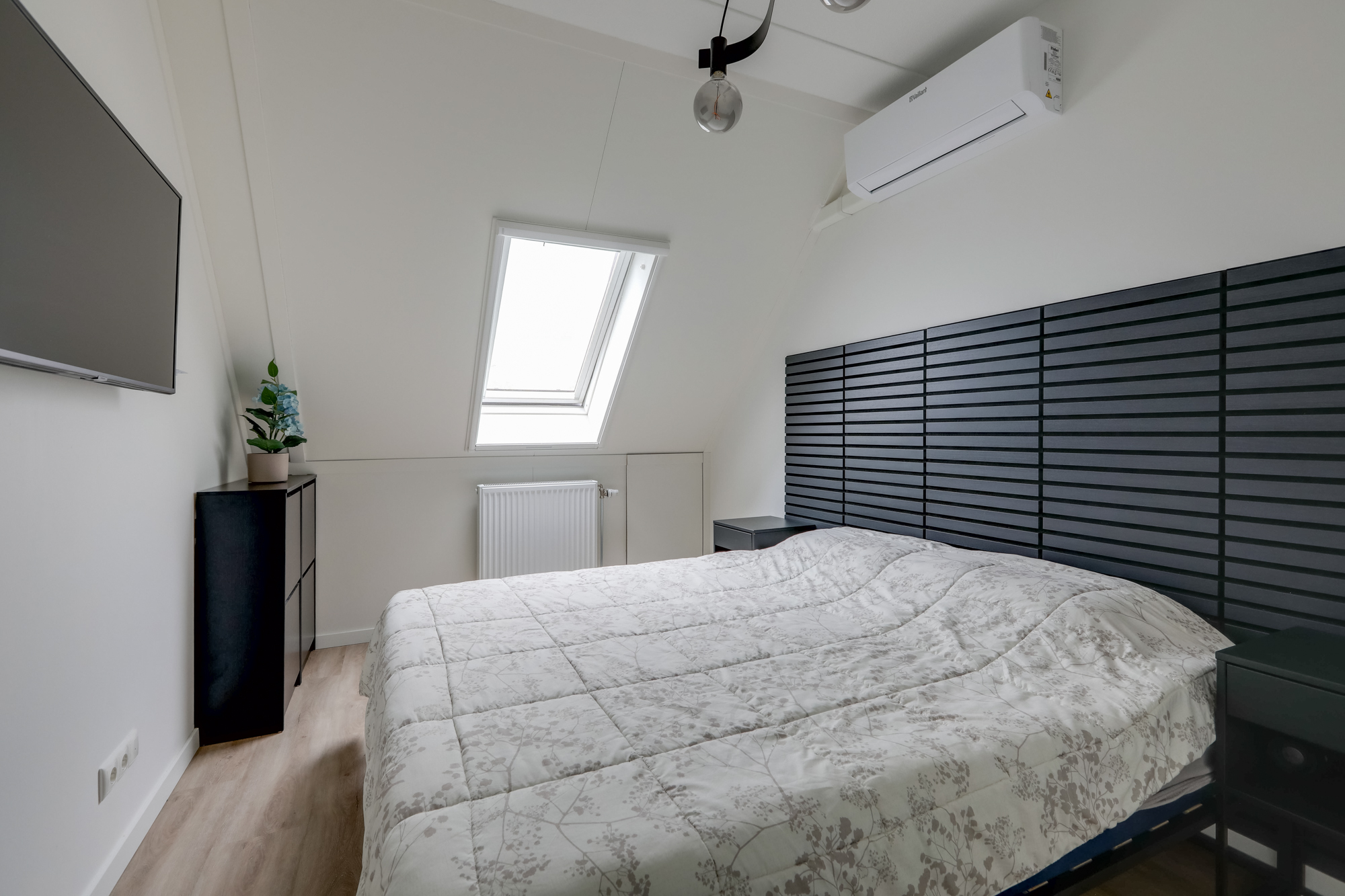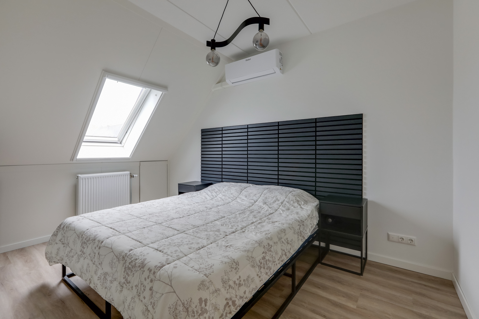 Via de strak beklede trap bereik je de eerste verdieping. Hier vind je twee ruime slaapkamers, beide voorzien van horren, een dakraam en een doorgelegde PVC-vloer. De woning is bovendien uitgerust met airco’s op zowel de begane grond als de verdieping – heerlijk comfortabel in alle seizoenen. Daarnaast een knusse derde slaapkamer waar nu waskamer van gemaakt is.