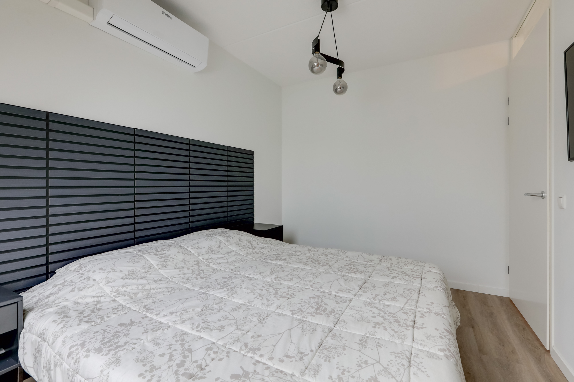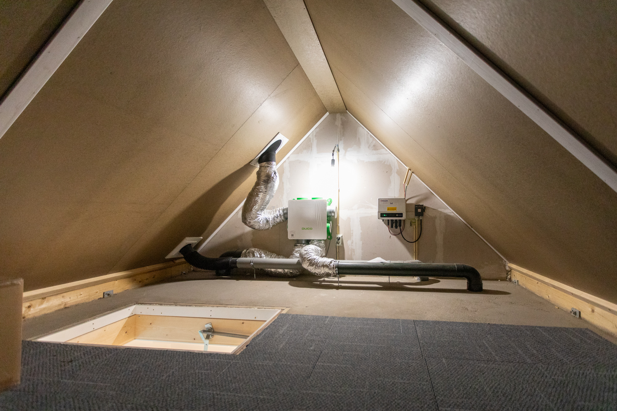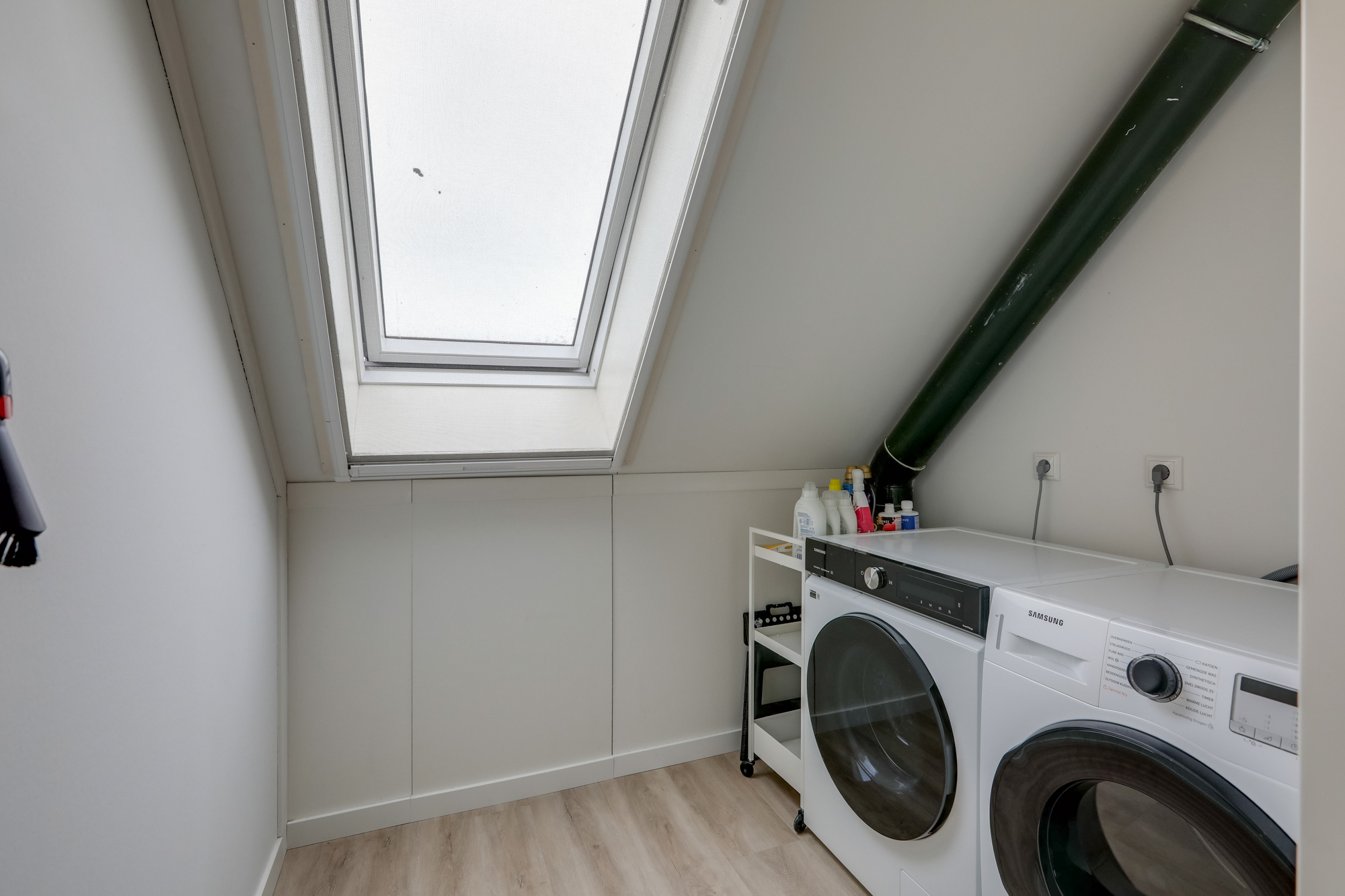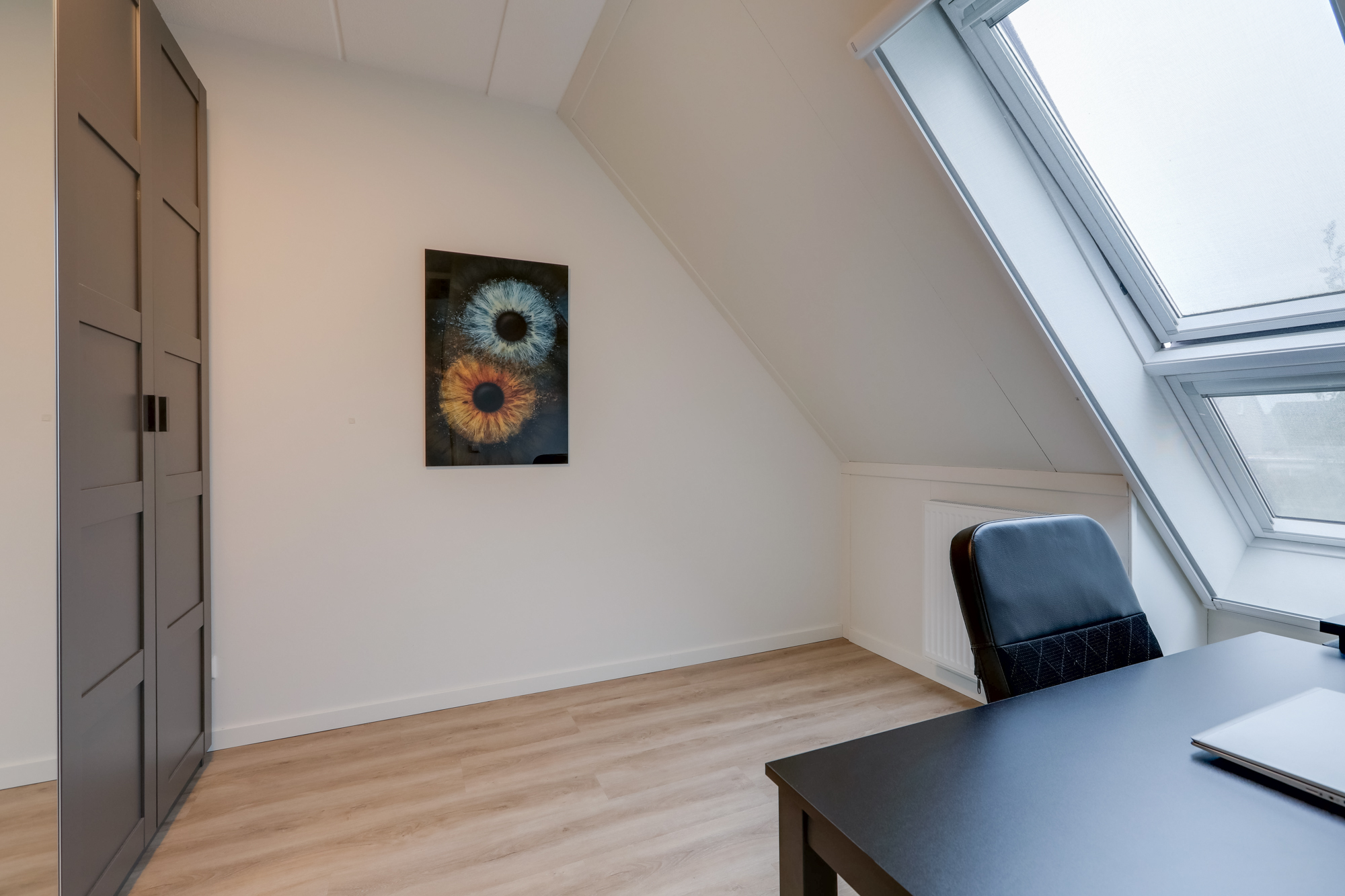 Via de strak beklede trap bereik je de eerste verdieping. Hier vind je twee ruime slaapkamers, beide voorzien van horren, een dakraam en een doorgelegde PVC-vloer. De woning is bovendien uitgerust met airco’s op zowel de begane grond als de verdieping – heerlijk comfortabel in alle seizoenen. Daarnaast een knusse derde slaapkamer waar nu waskamer van gemaakt is.