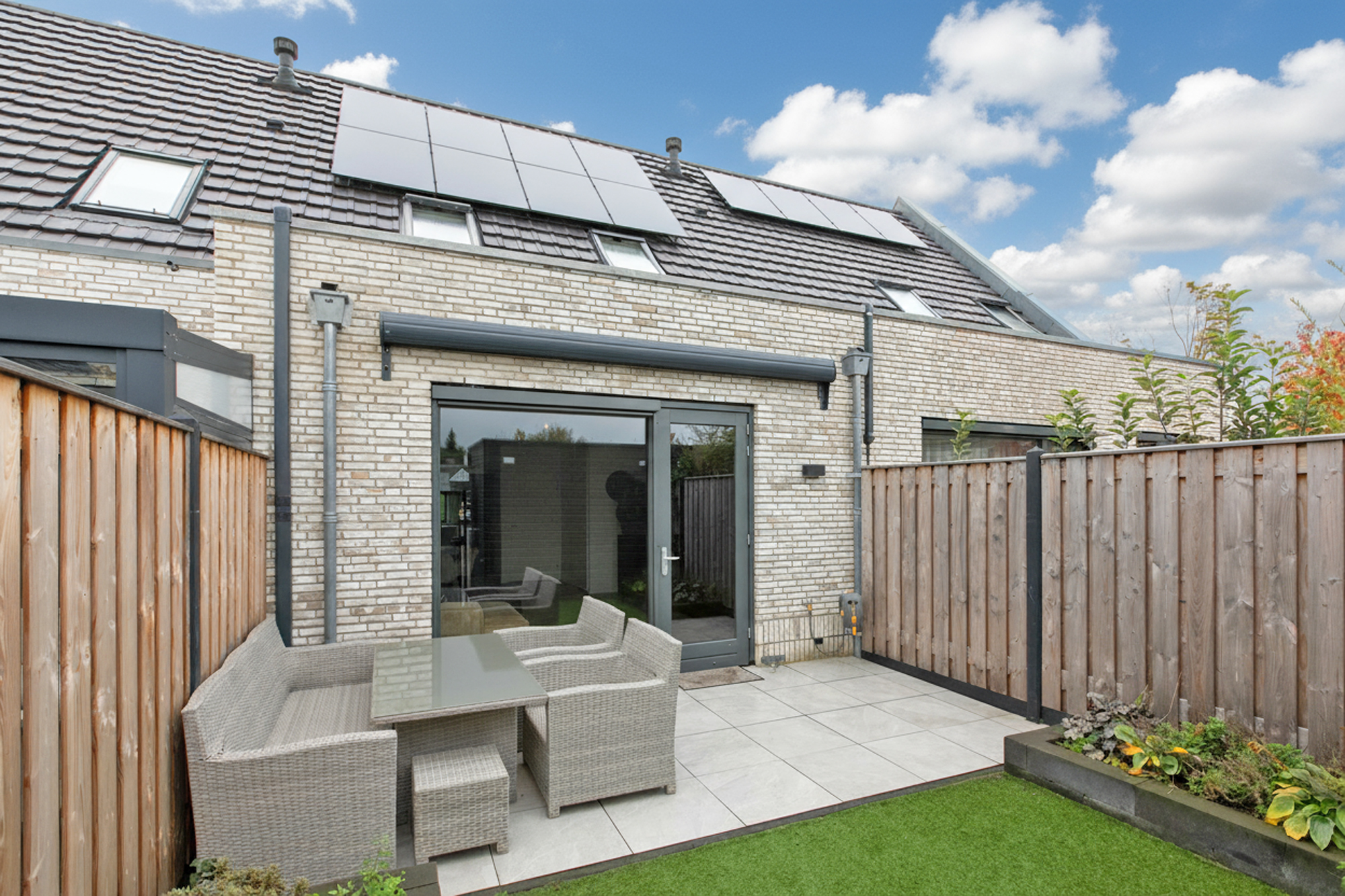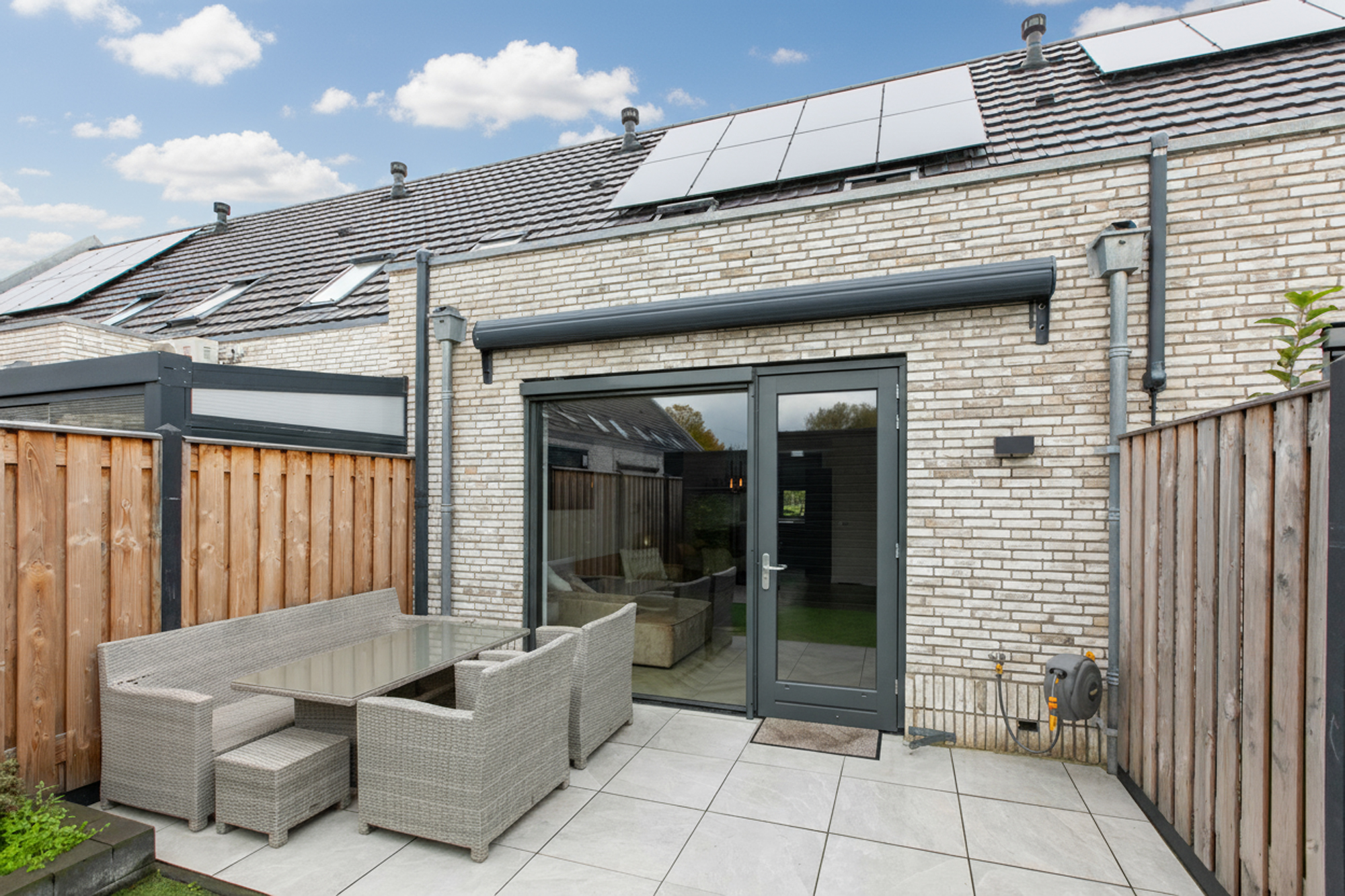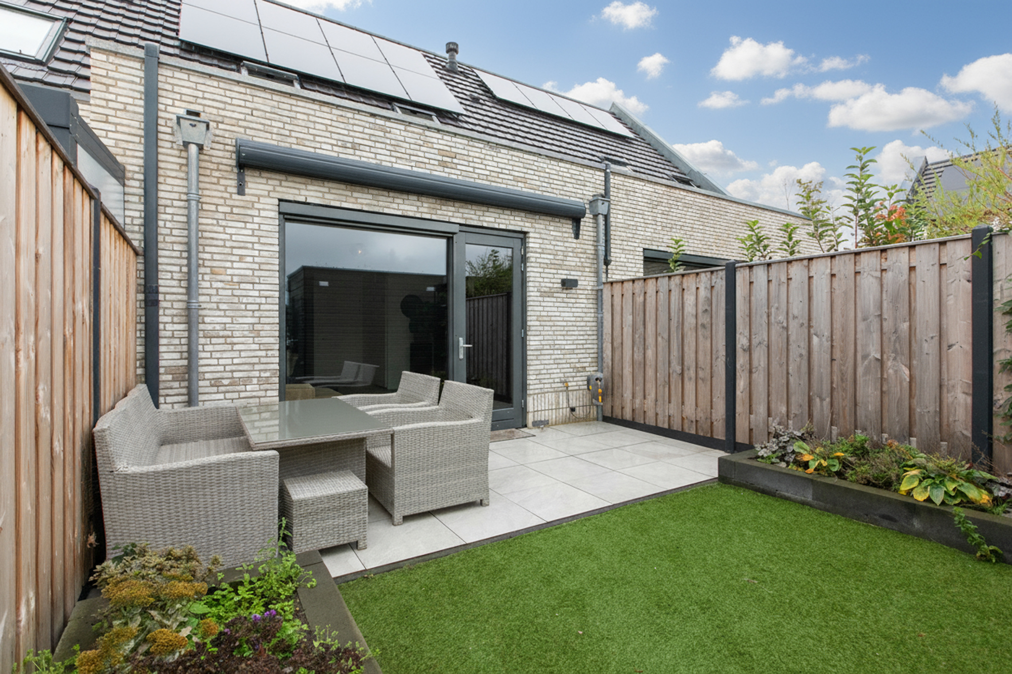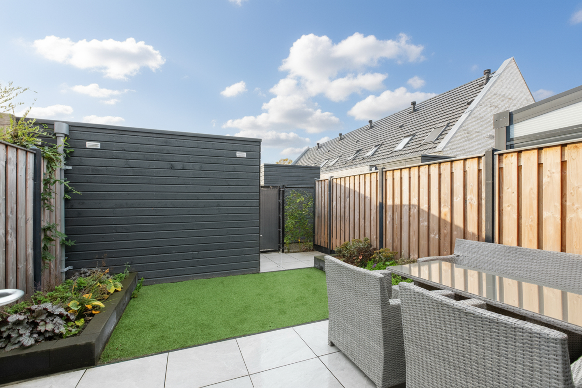 De achtertuin is onderhoudsarm en stijlvol aangelegd met sierbestrating en kunstgras – perfect voor wie houdt van een verzorgde uitstraling zonder het tuinwerk. Dankzij de zuidelijke ligging geniet je hier volop van de zon, en met het in 2025 geplaatste elektrische zonnescherm creëer je eenvoudig een fijne schaduwplek. In de tuin vind je verder diverse stroompunten en