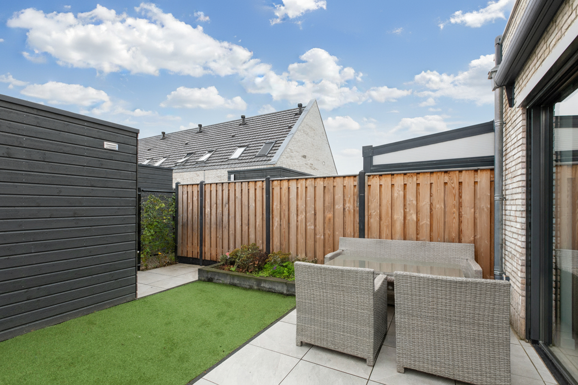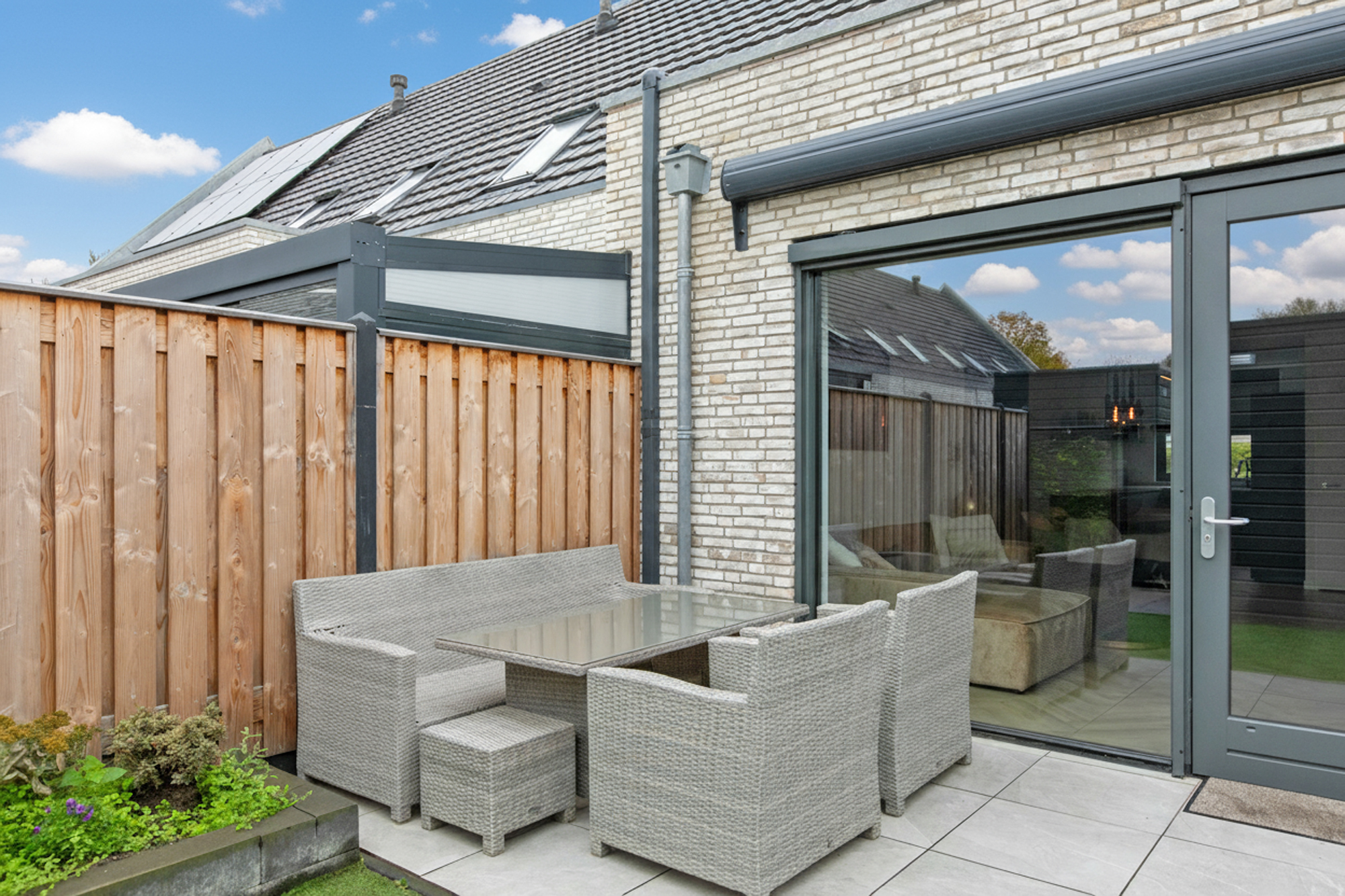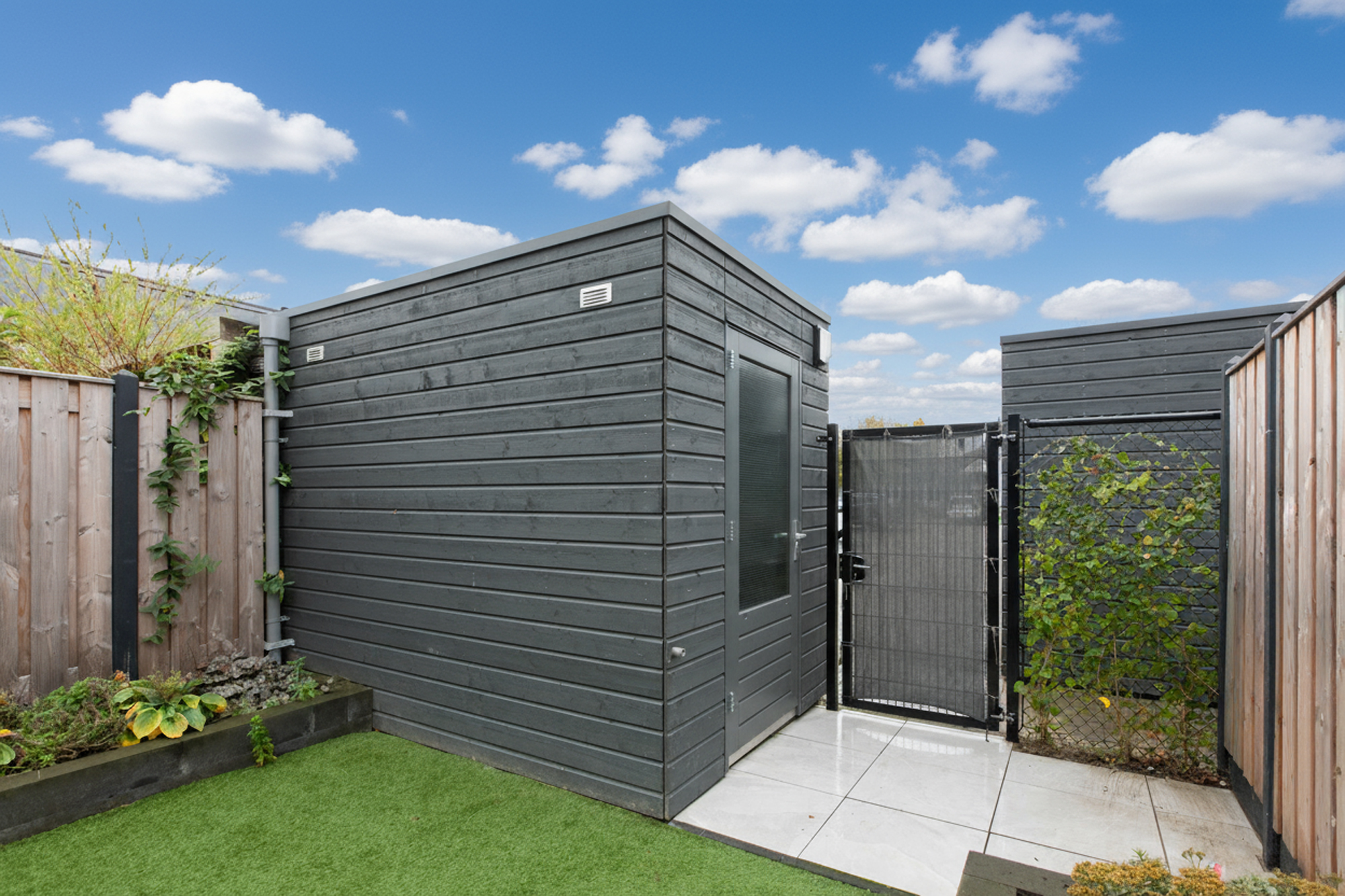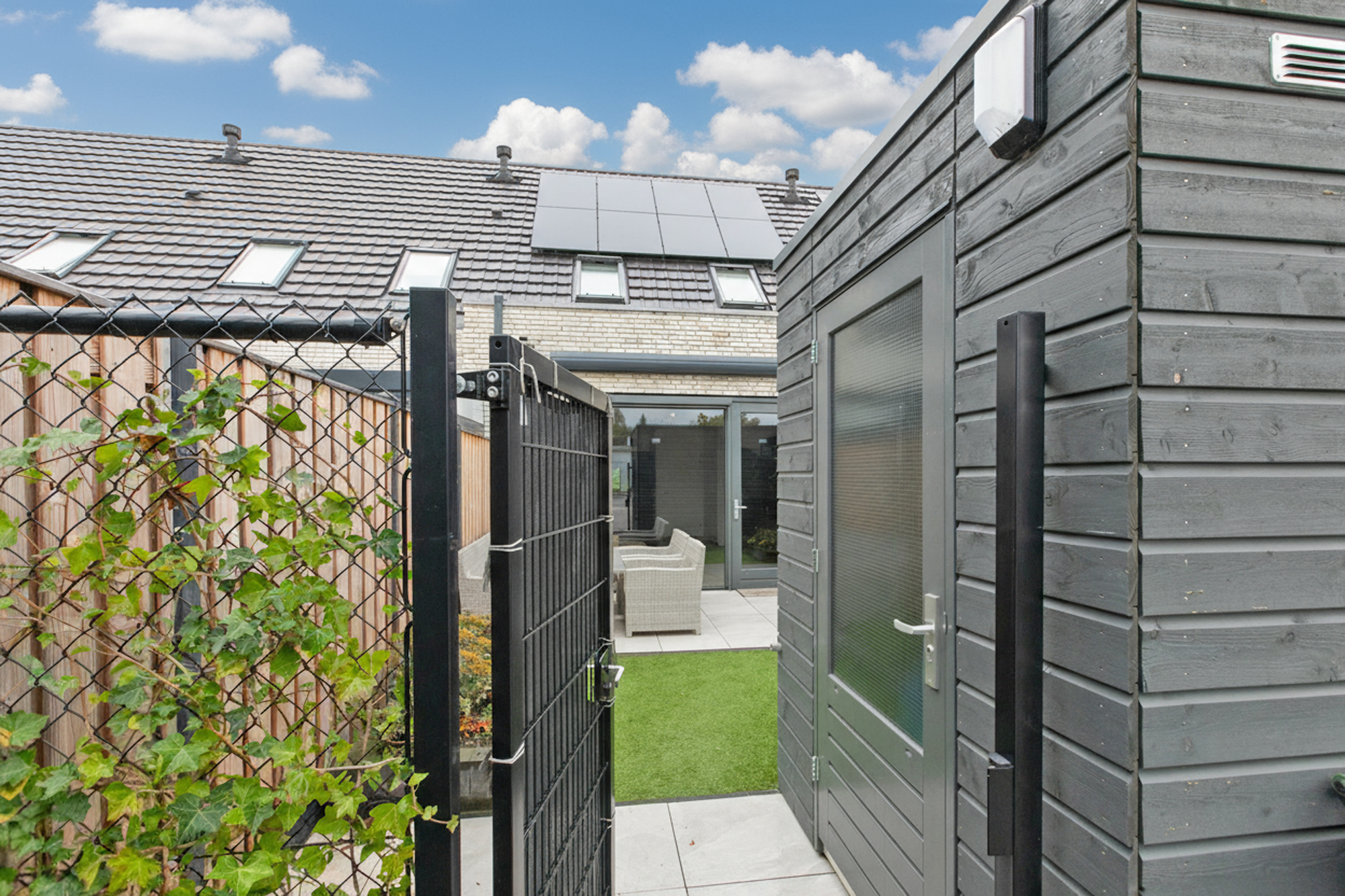 De achtertuin is onderhoudsarm en stijlvol aangelegd met sierbestrating en kunstgras – perfect voor wie houdt van een verzorgde uitstraling zonder het tuinwerk. Dankzij de zuidelijke ligging geniet je hier volop van de zon, en met het in 2025 geplaatste elektrische zonnescherm creëer je eenvoudig een fijne schaduwplek. In de tuin vind je verder diverse stroompunten en