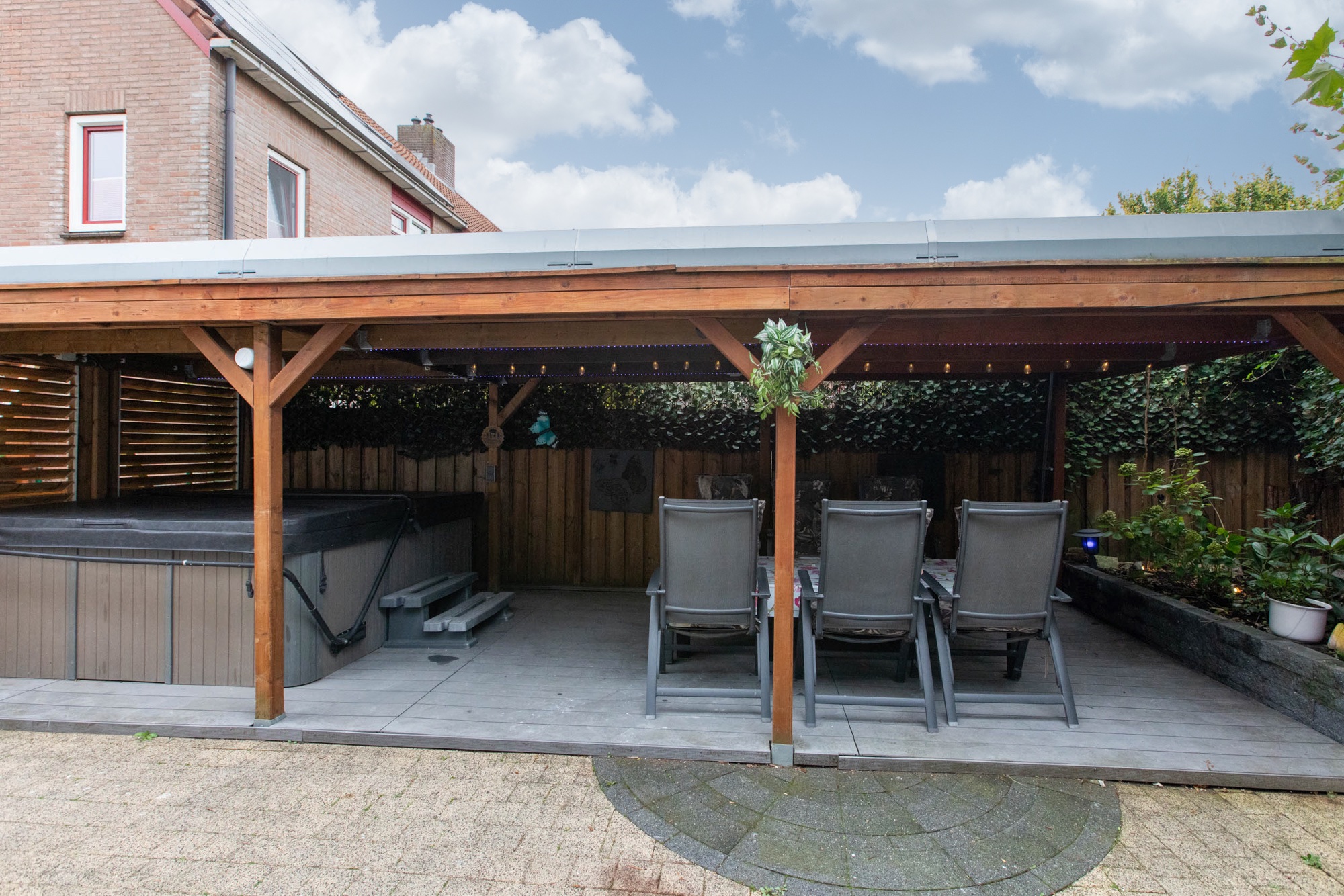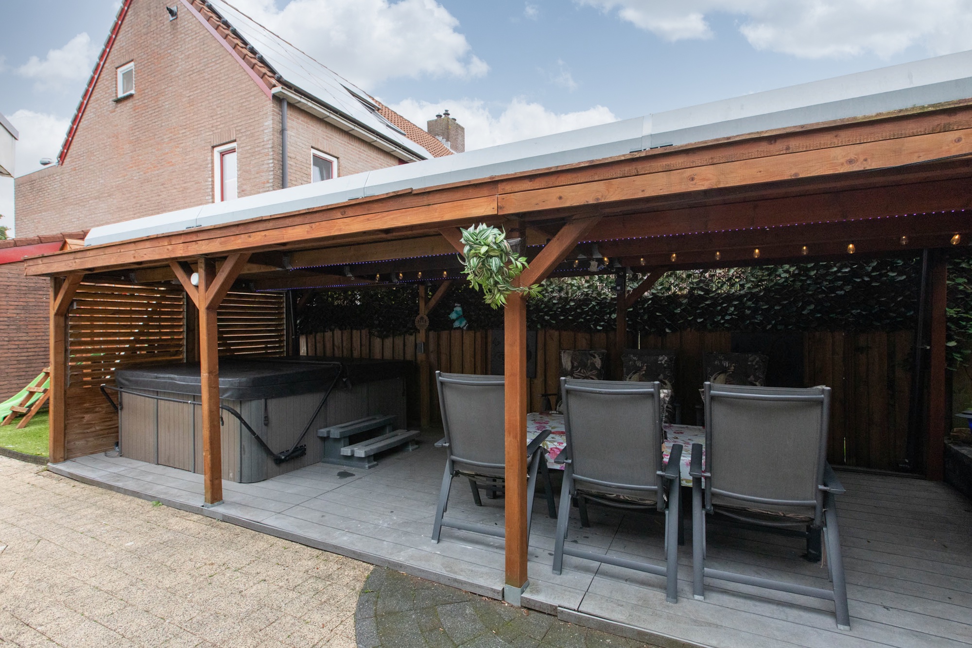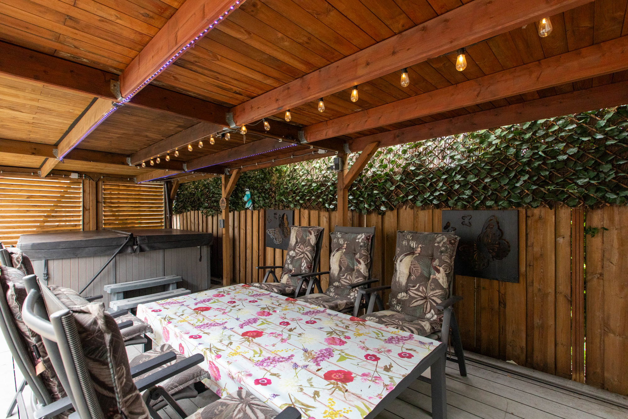 Keurig aangelegde achtertuin met ruime overkapping met jacuzzi. Heerlijk voor zowel de winter of zomermaanden.