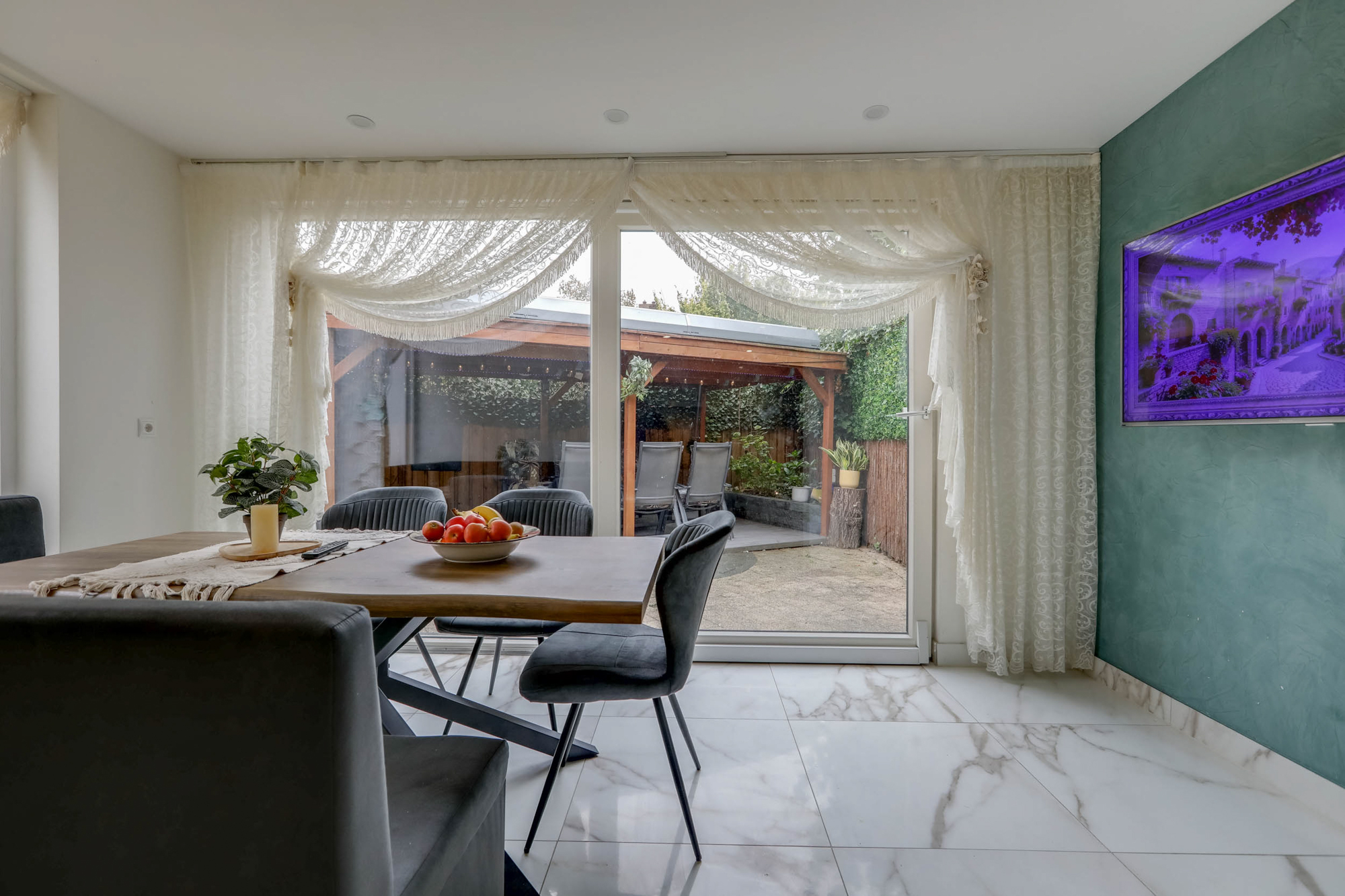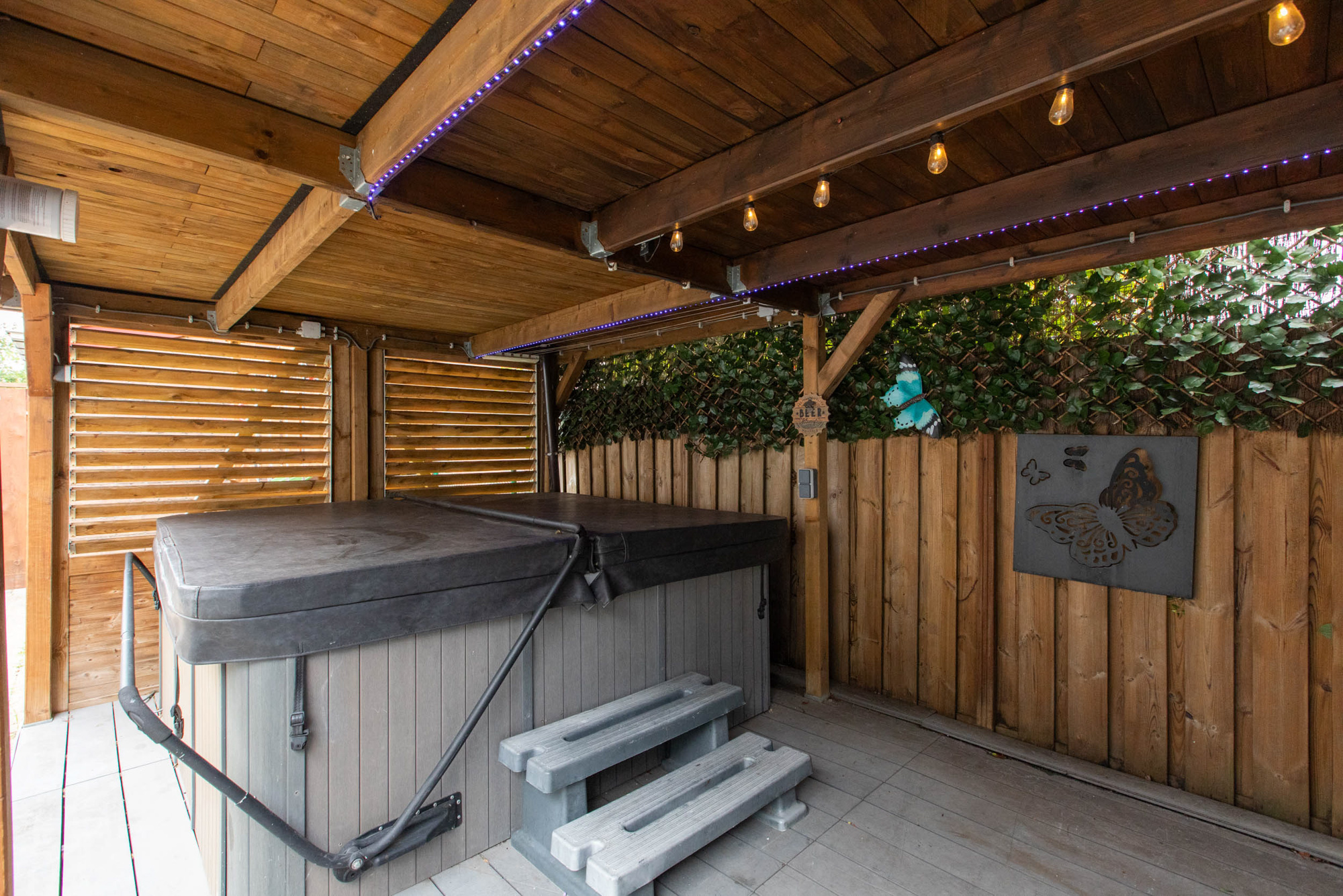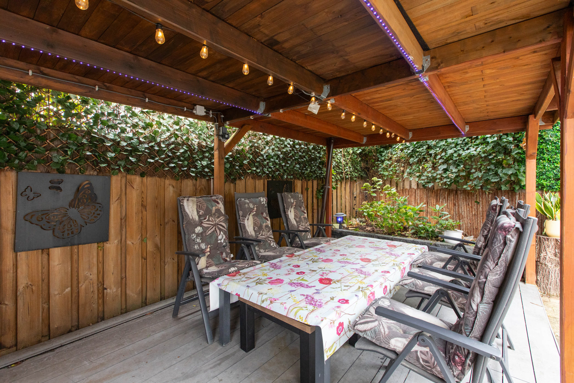 Keurig aangelegde achtertuin met ruime overkapping met jacuzzi. Heerlijk voor zowel de winter of zomermaanden.