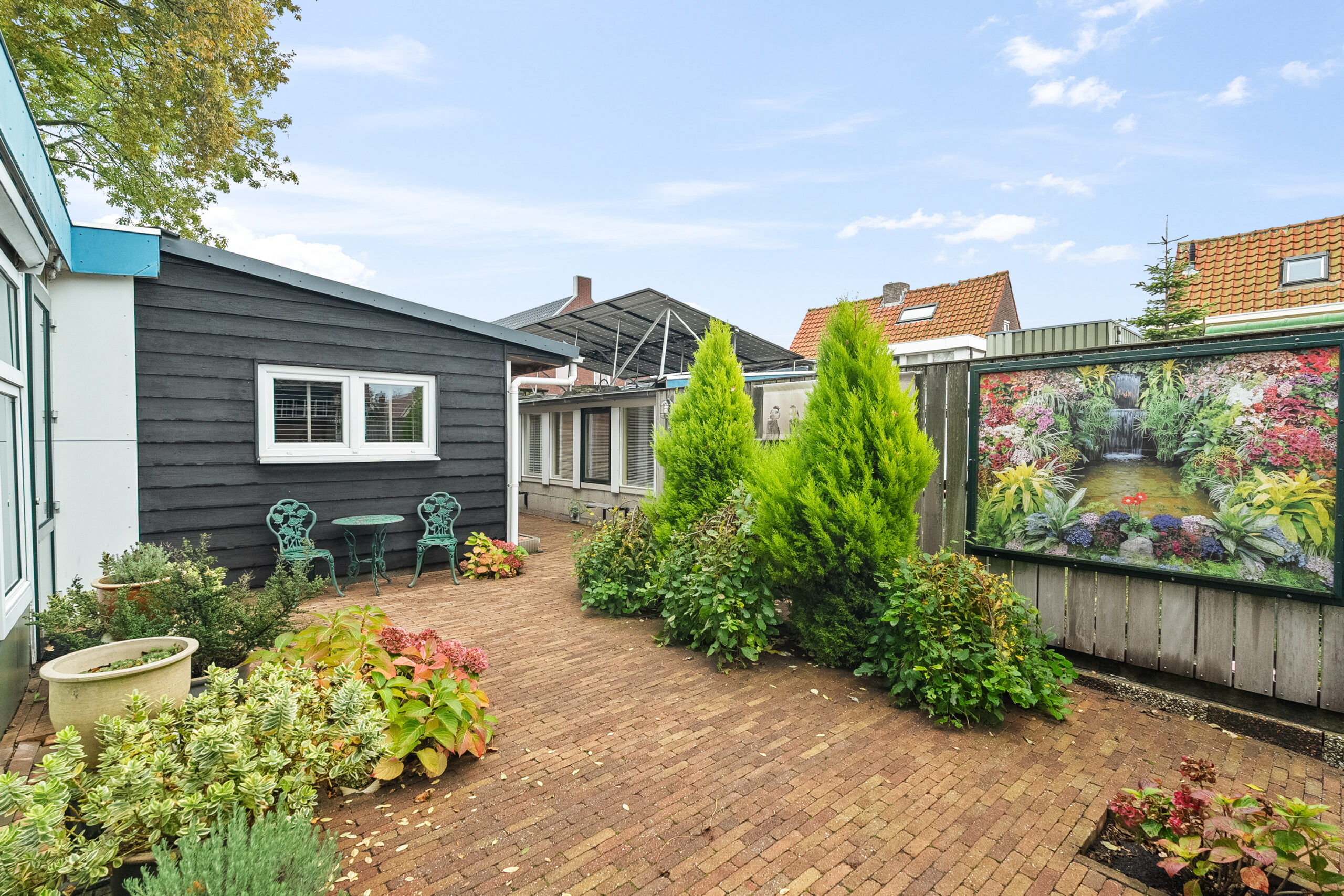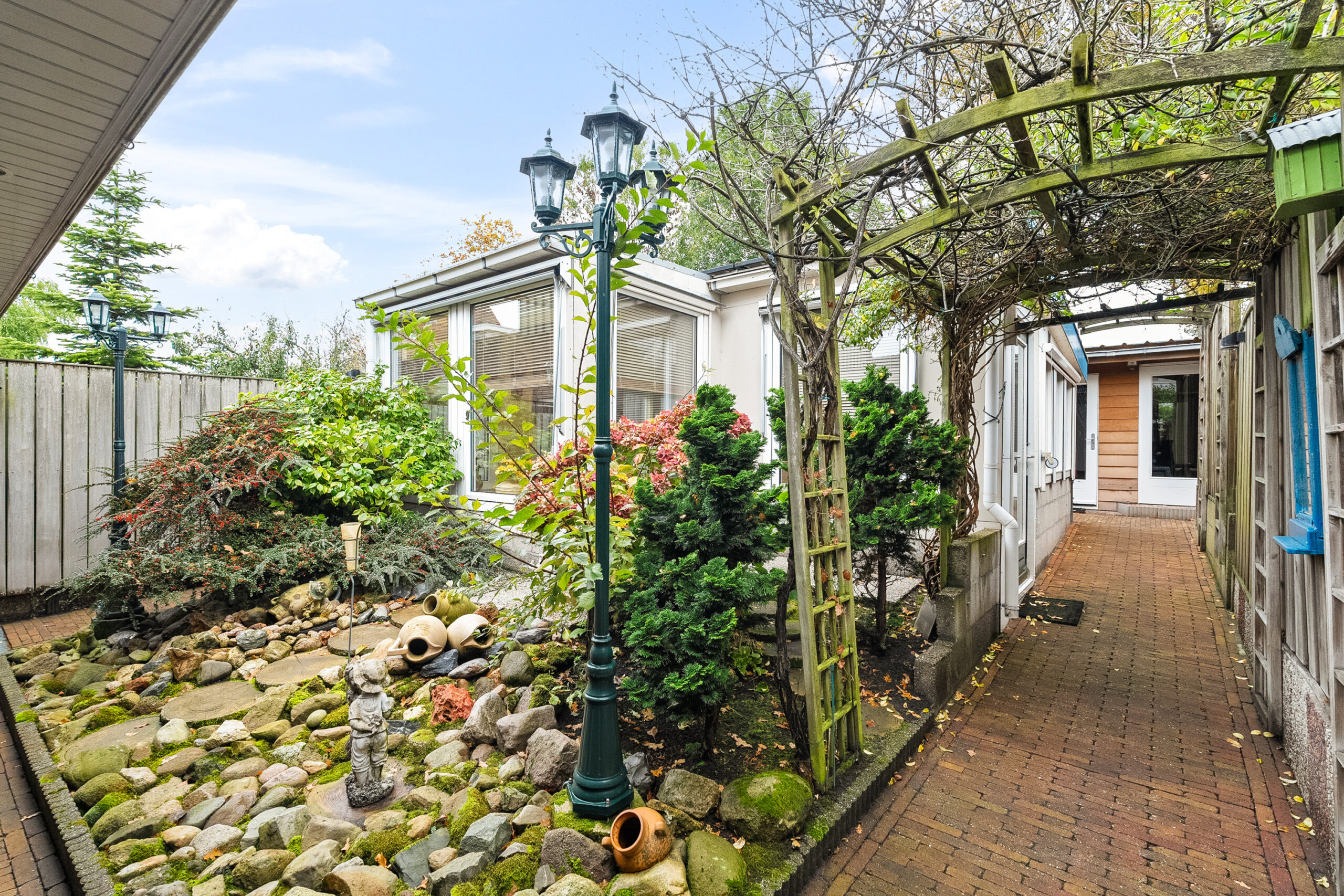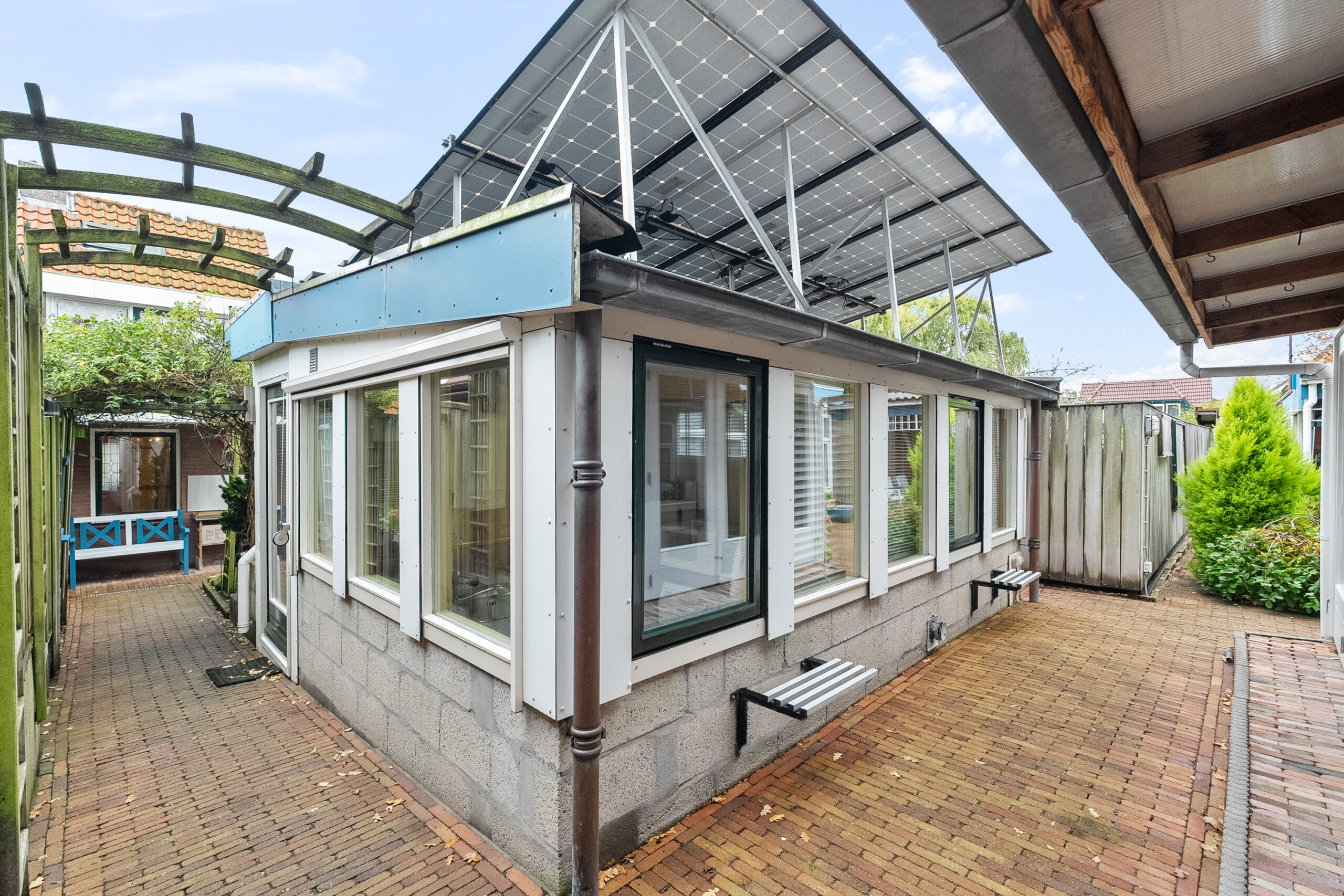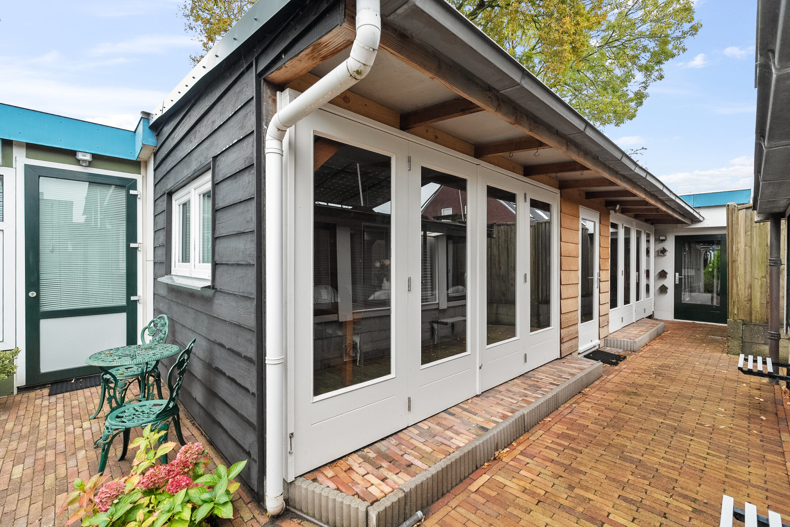 U komt buiten via de tuindeur in de keuken of vanuit de steeg aan de zijkant. Recht achter de woning staat de serre/bijkeuken met keukenblok, gaskachel en boiler. Achter op het perceel staan de voormalig volières. De ruimtes zijn nu omgebouwd tot hobby/klusruimte met tuinkamer. Het geheel is verwarmd en geïsoleerd en ook geschikt voor praktijkruimte. Verder is er nog een zonnig terras aanwezig in de tuin.