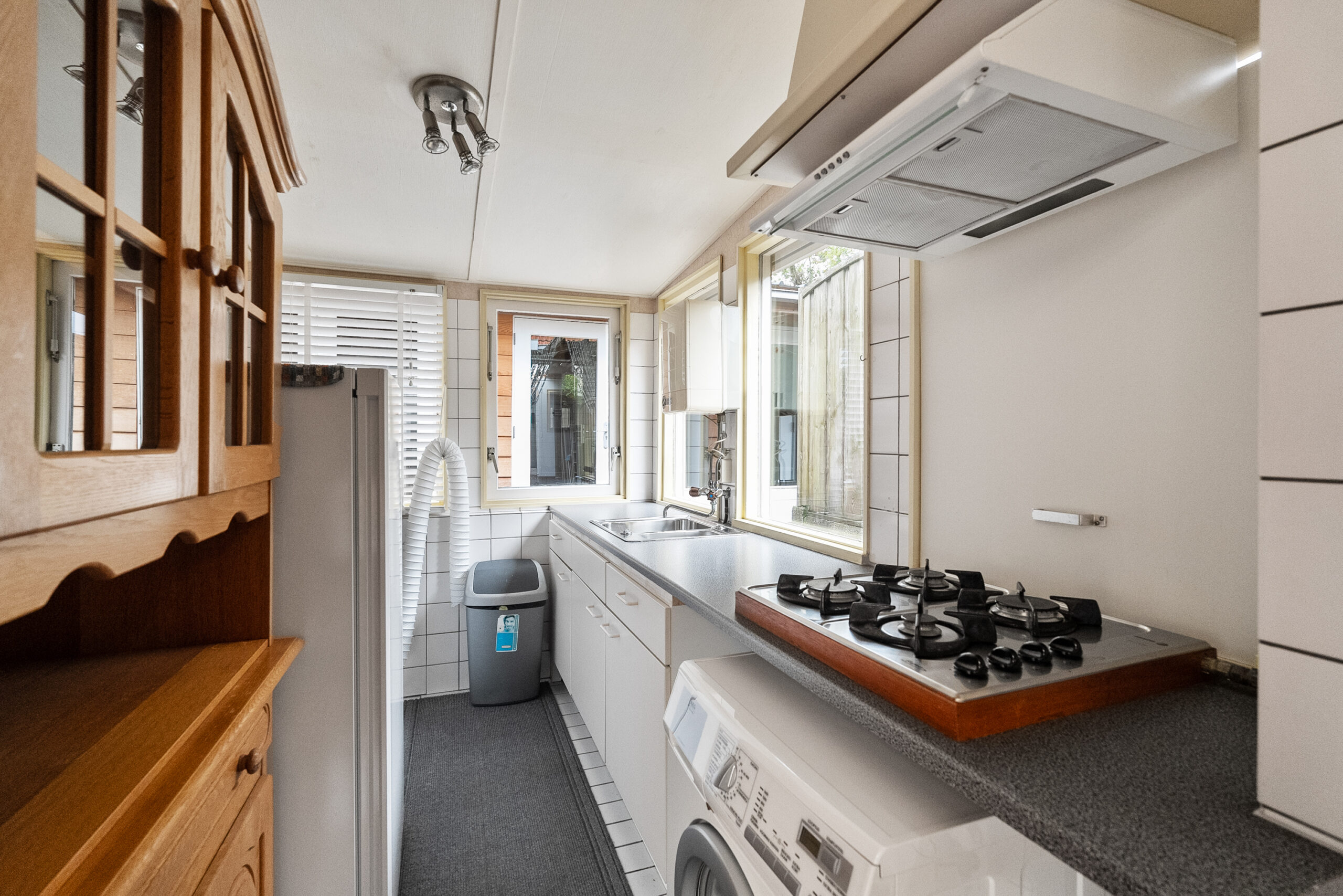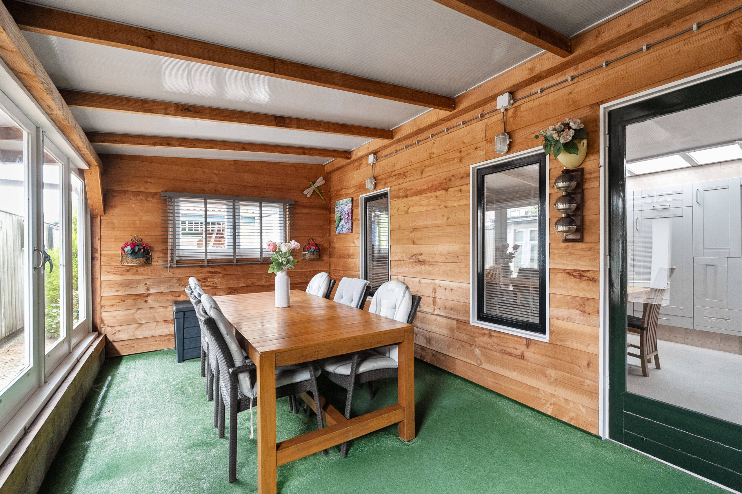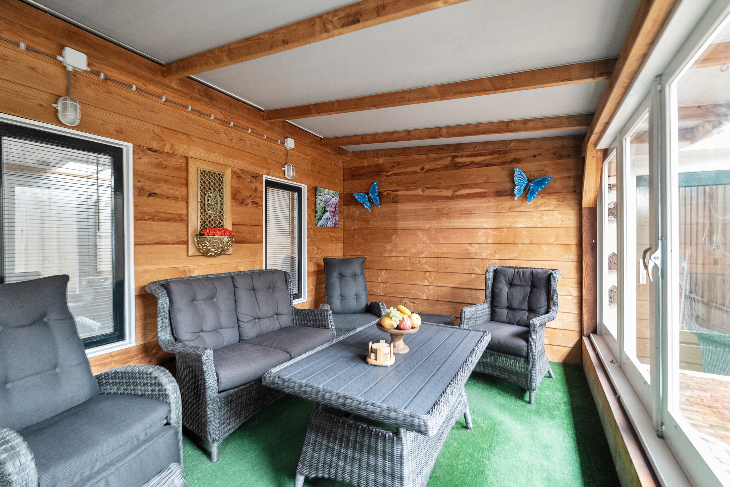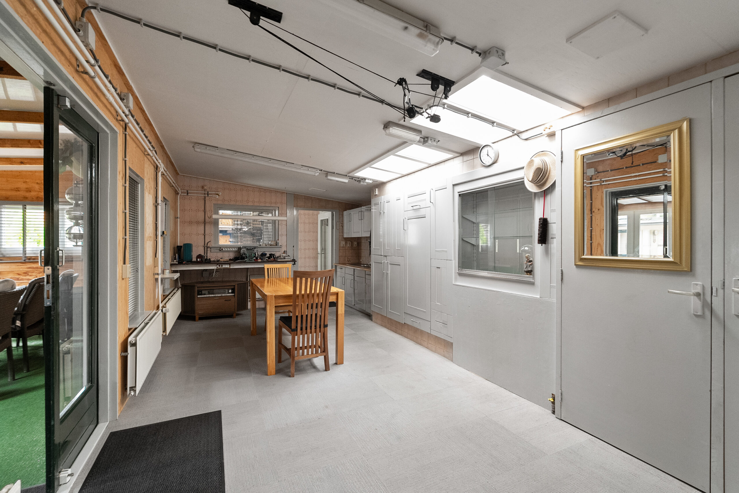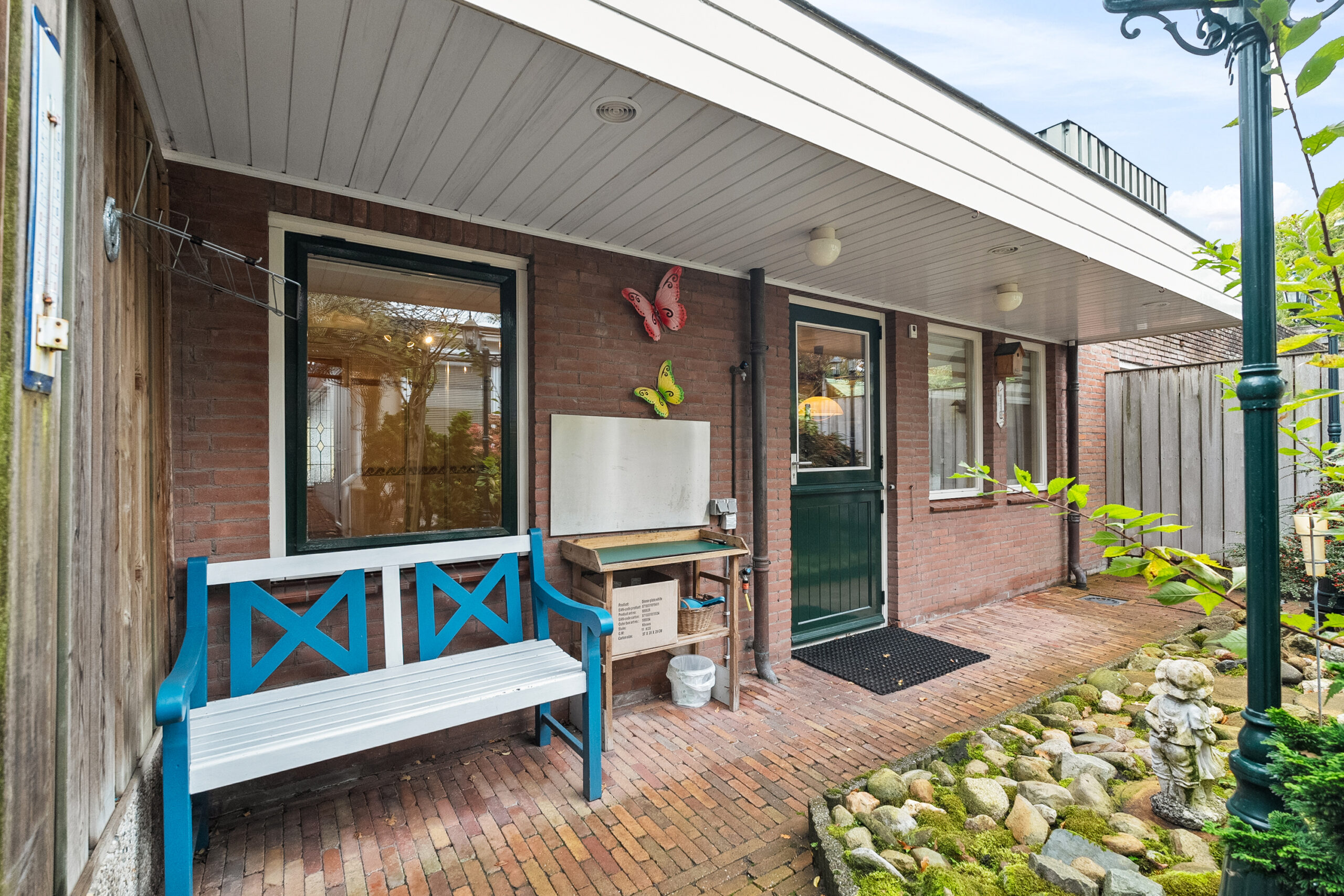 U komt buiten via de tuindeur in de keuken of vanuit de steeg aan de zijkant. Recht achter de woning staat de serre/bijkeuken met keukenblok, gaskachel en boiler. Achter op het perceel staan de voormalig volières. De ruimtes zijn nu omgebouwd tot hobby/klusruimte met tuinkamer. Het geheel is verwarmd en geïsoleerd en ook geschikt voor praktijkruimte. Verder is er nog een zonnig terras aanwezig in de tuin.