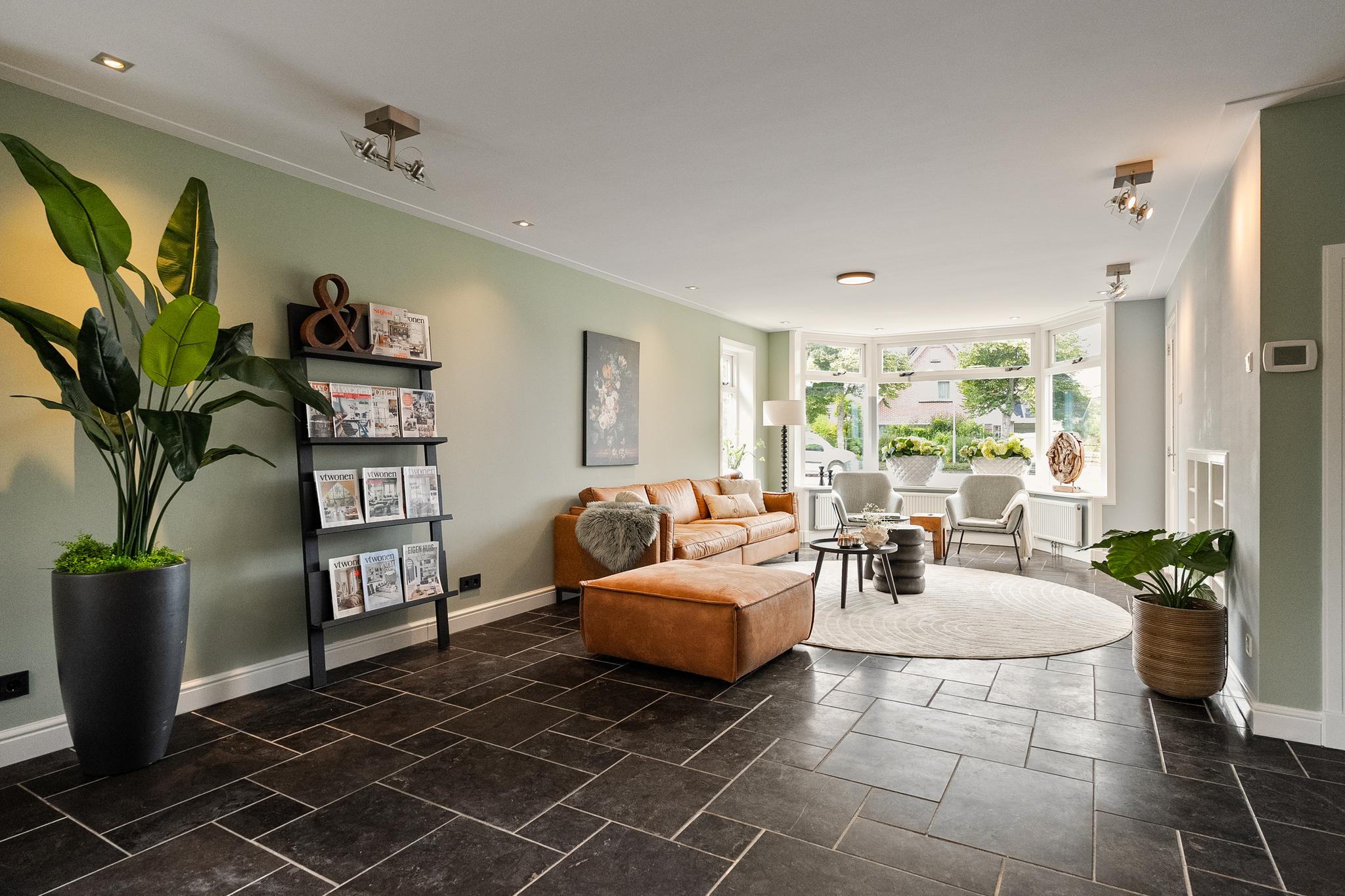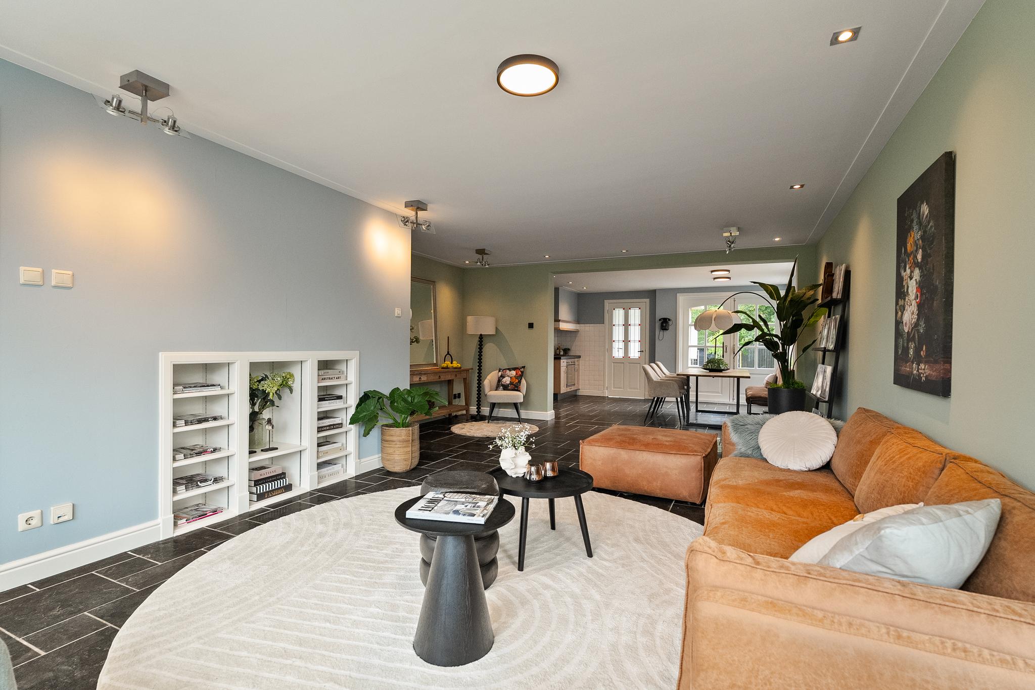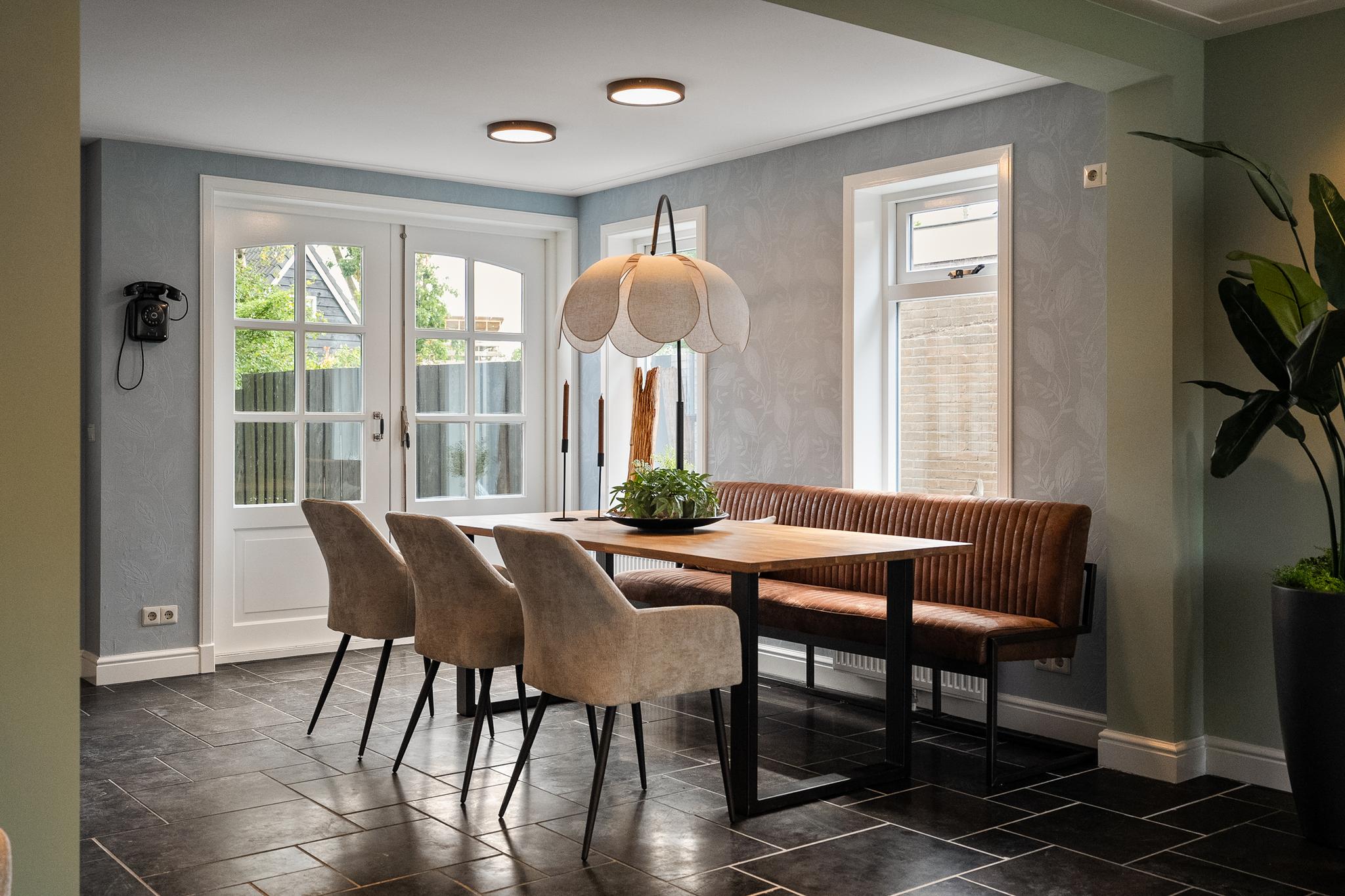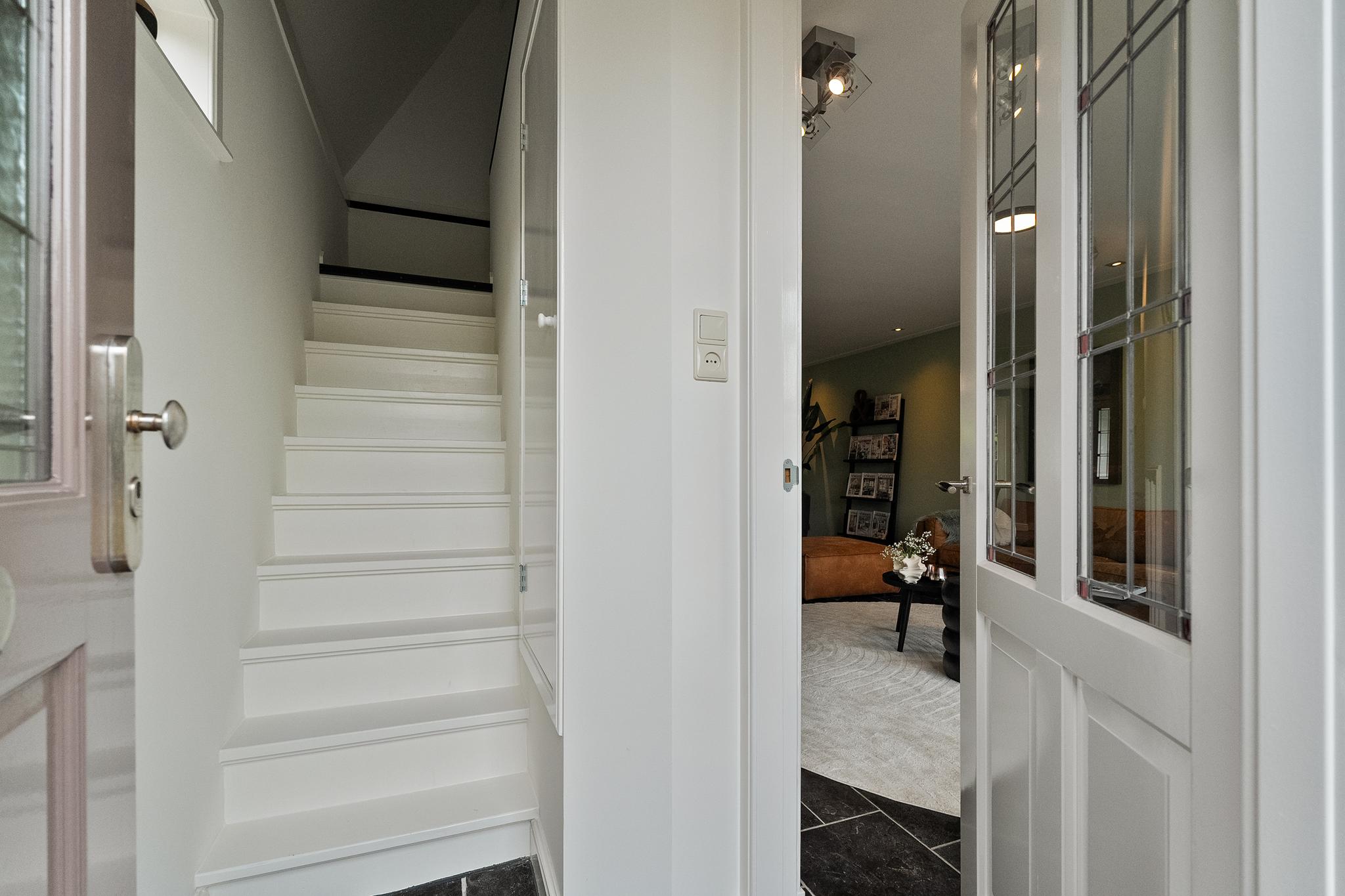 Voorentree naar de hal met meterkast en trapopgang. U loopt door naar de lichte en ruime uitgebouwde woonkamer met sfeervolle erker aan de voorzijde en grote raampartijen. De woonkamer heeft een plavuizen vloer met vloerverwarming, gestuukte wanden en plafonds en open keuken. Open keuken aan de achterzijde met openslaande tuindeuren en plek voor een grote eettafel. Achter de keuken treft u een hal met plek voor de wasmachine en -droger. Betegelde en ruime badkamer met dubbele wastafel, hangend closet en grote douche.