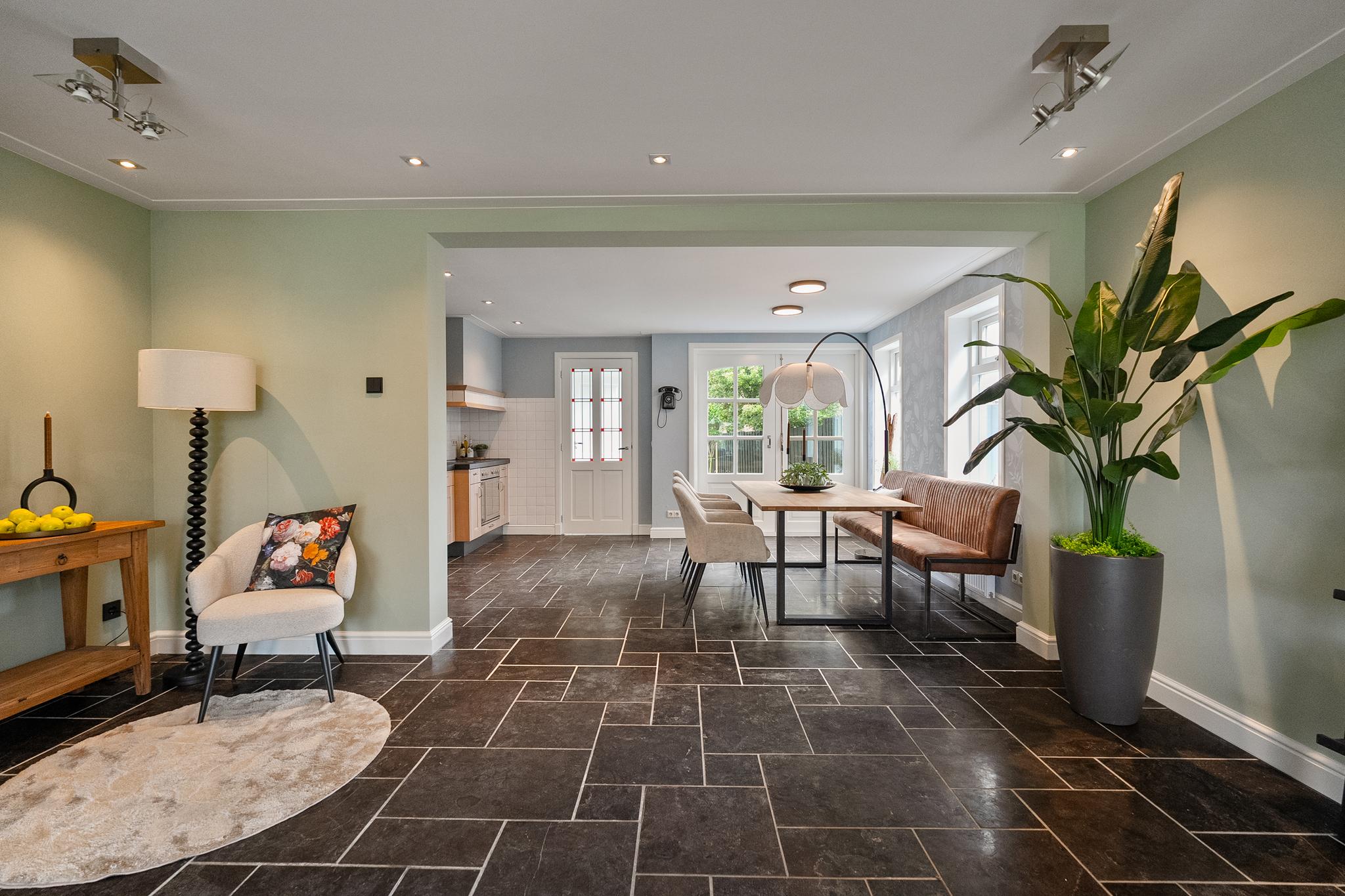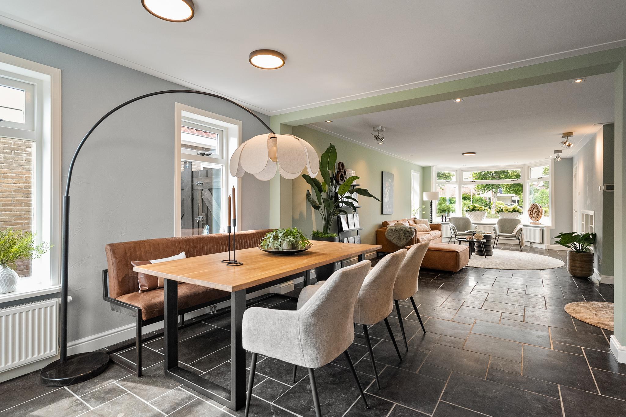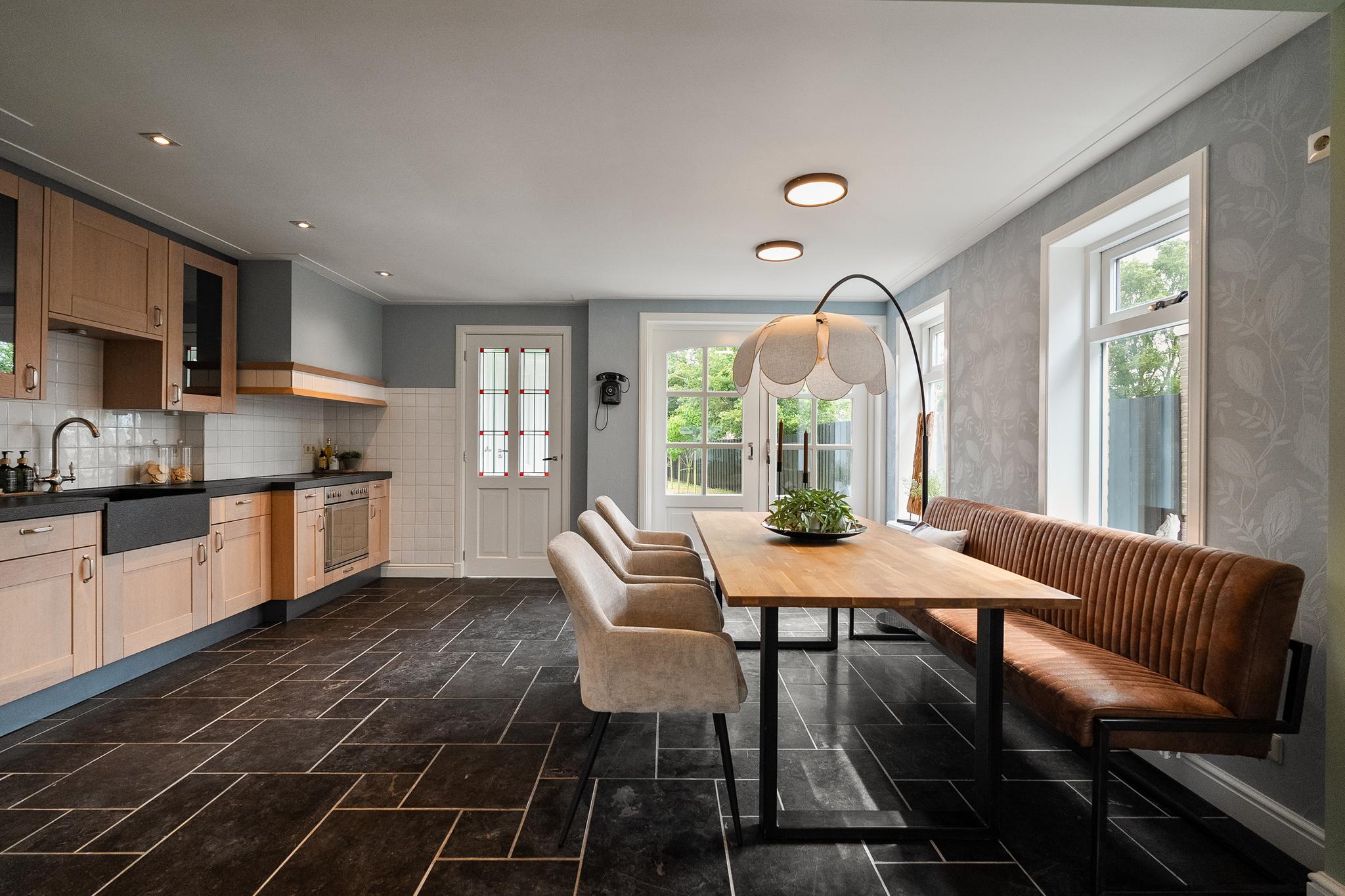 Voorentree naar de hal met meterkast en trapopgang. U loopt door naar de lichte en ruime uitgebouwde woonkamer met sfeervolle erker aan de voorzijde en grote raampartijen. De woonkamer heeft een plavuizen vloer met vloerverwarming, gestuukte wanden en plafonds en open keuken. Open keuken aan de achterzijde met openslaande tuindeuren en plek voor een grote eettafel. Achter de keuken treft u een hal met plek voor de wasmachine en -droger. Betegelde en ruime badkamer met dubbele wastafel, hangend closet en grote douche.
