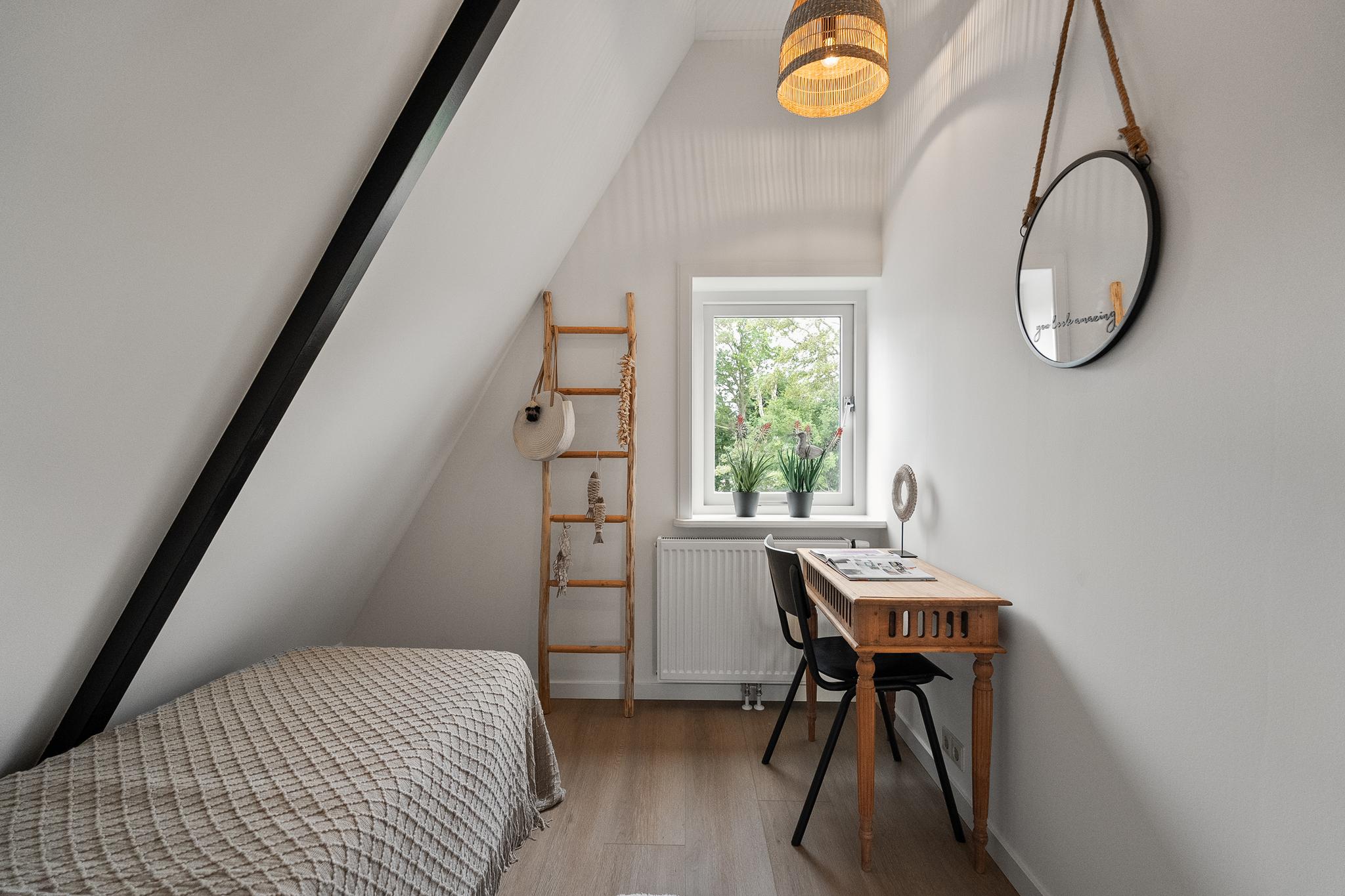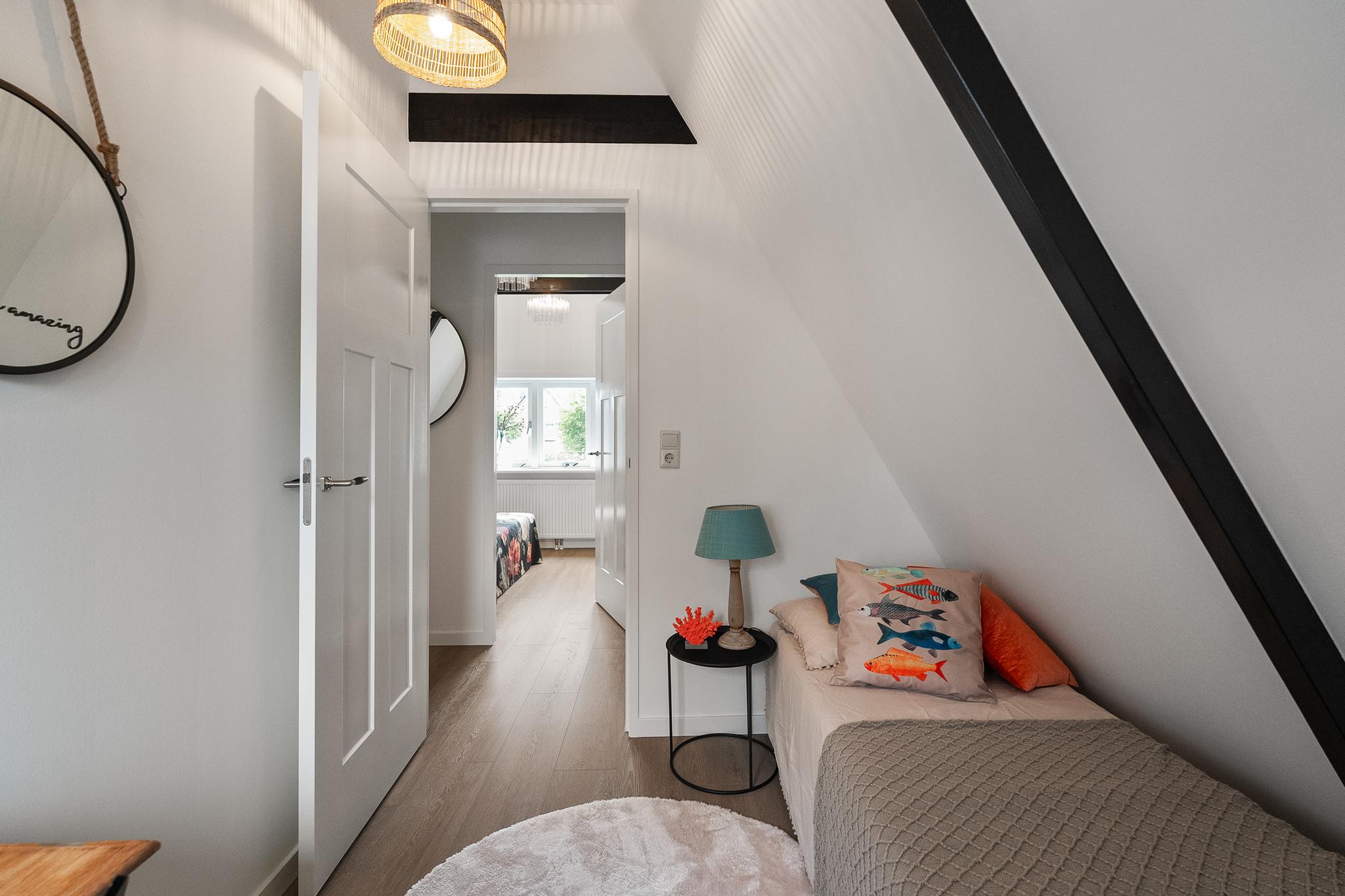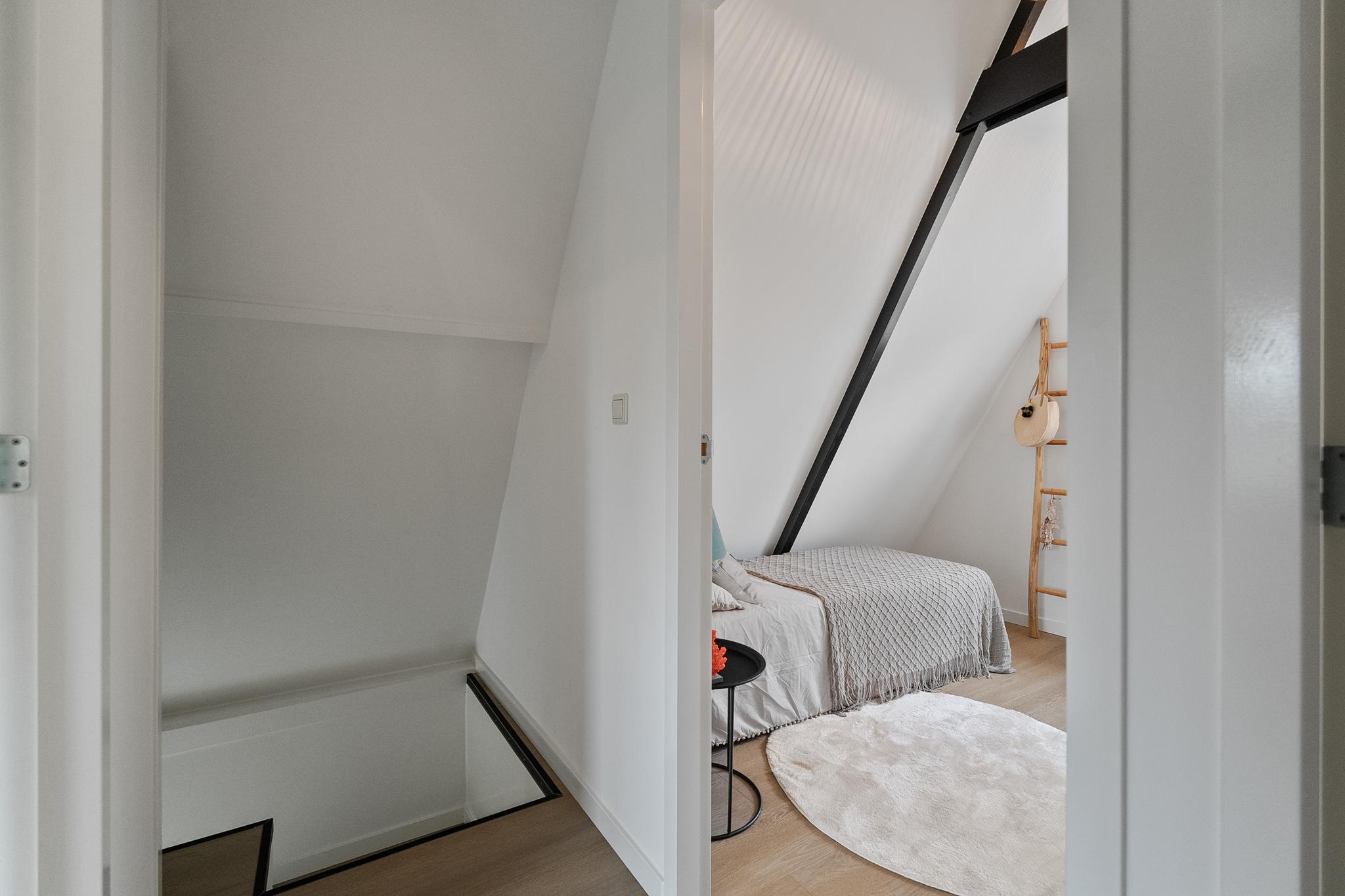 U komt boven op de overloop met bergkast in het midden. Hier is onder de vloer ook een afvoer aanwezig voor een eventueel toilet. Op deze etage zijn drie slaapkamers, allen strak afgewerkt met gestuukte wanden, laminaatvloer, uitzetramen en radiatoren. Er zijn extra hoge plafonds op de eerste etage wat een gevoel van ruimte geeft. Vanuit de overloop is via de vlizotrap de kleine bergzolder te bereiken.