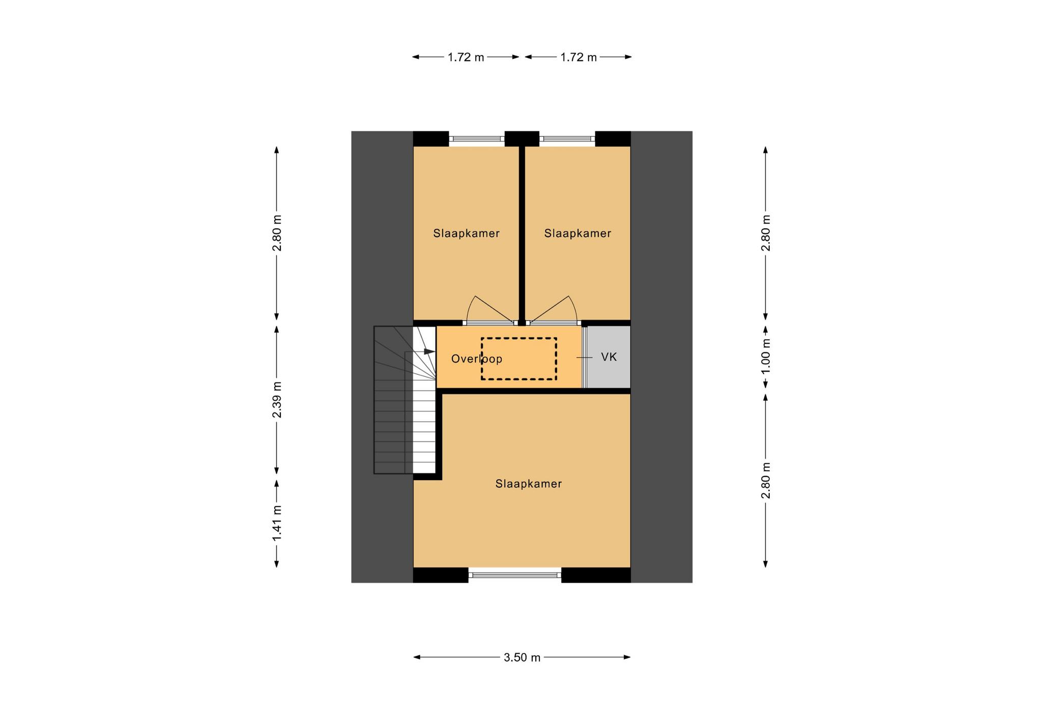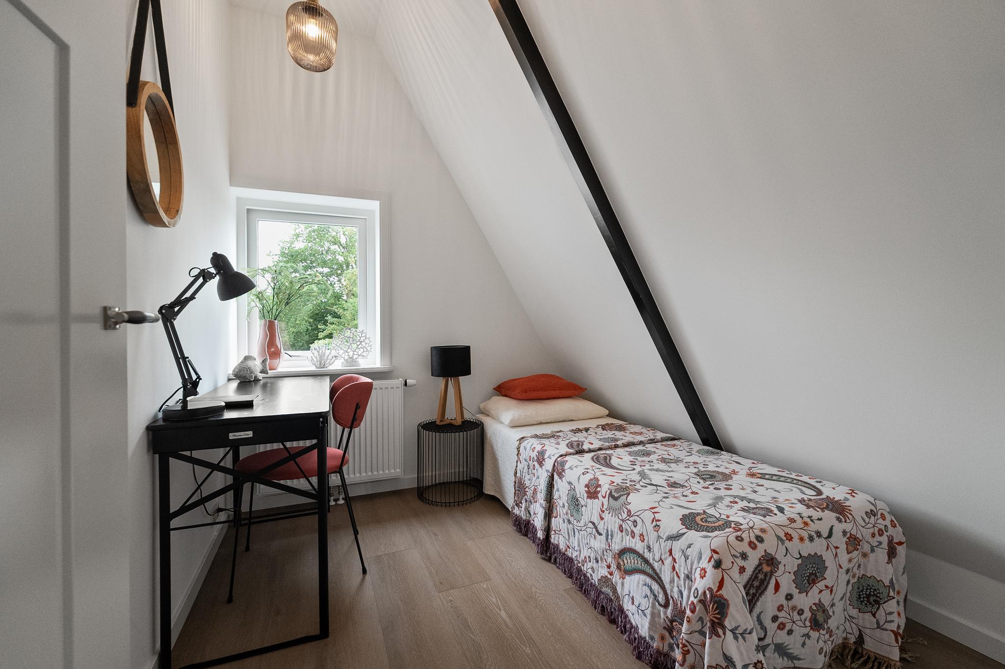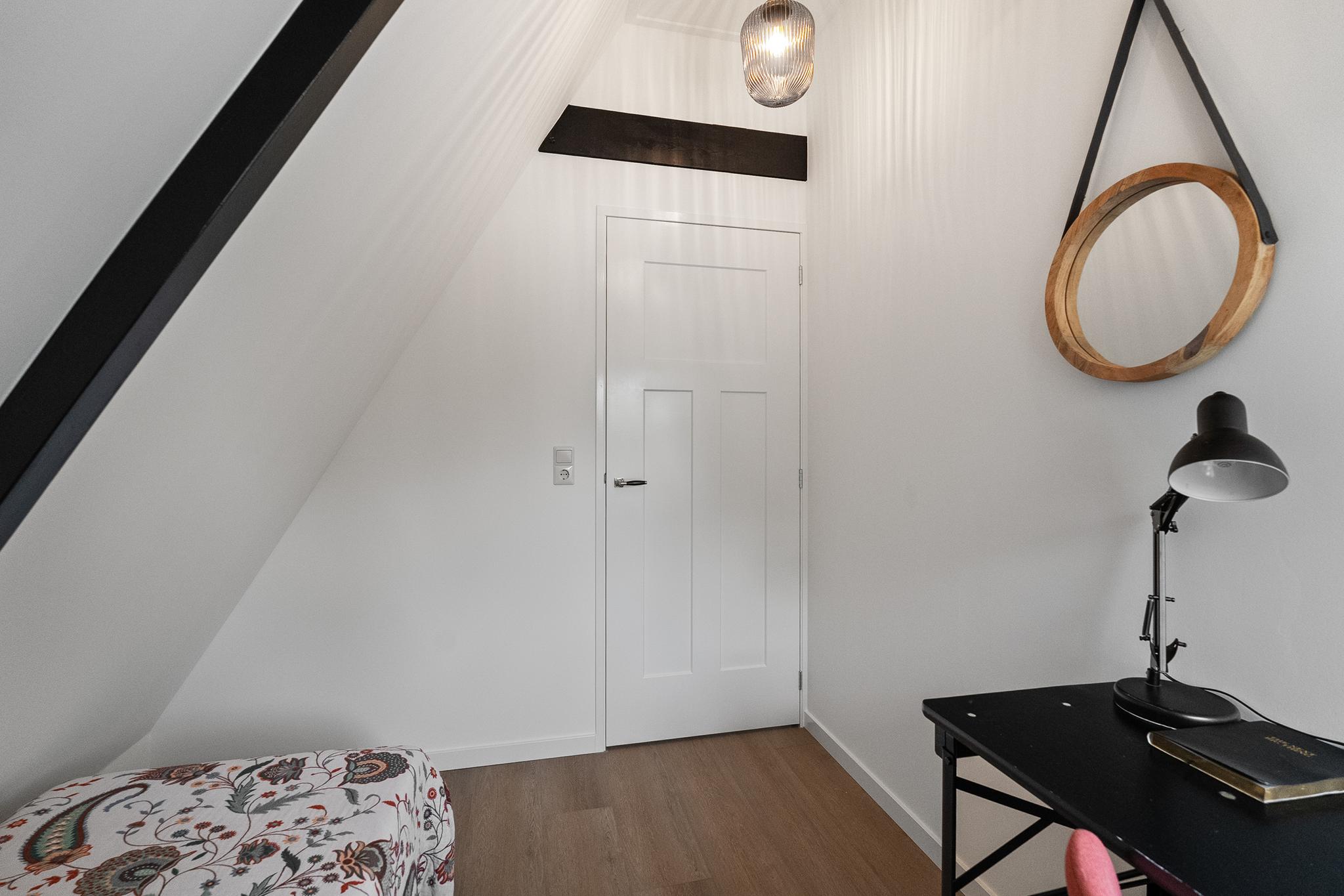 U komt boven op de overloop met bergkast in het midden. Hier is onder de vloer ook een afvoer aanwezig voor een eventueel toilet. Op deze etage zijn drie slaapkamers, allen strak afgewerkt met gestuukte wanden, laminaatvloer, uitzetramen en radiatoren. Er zijn extra hoge plafonds op de eerste etage wat een gevoel van ruimte geeft. Vanuit de overloop is via de vlizotrap de kleine bergzolder te bereiken.