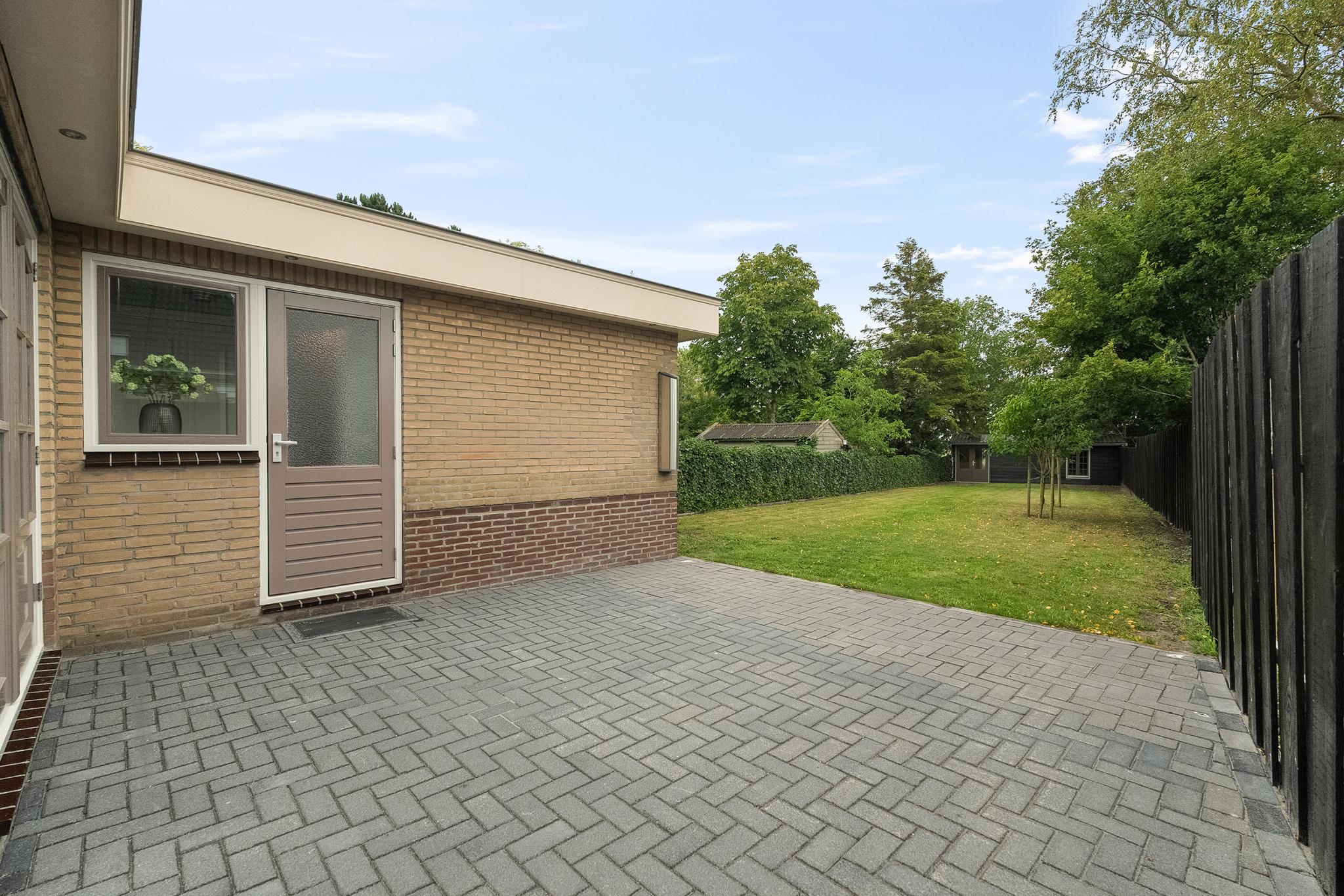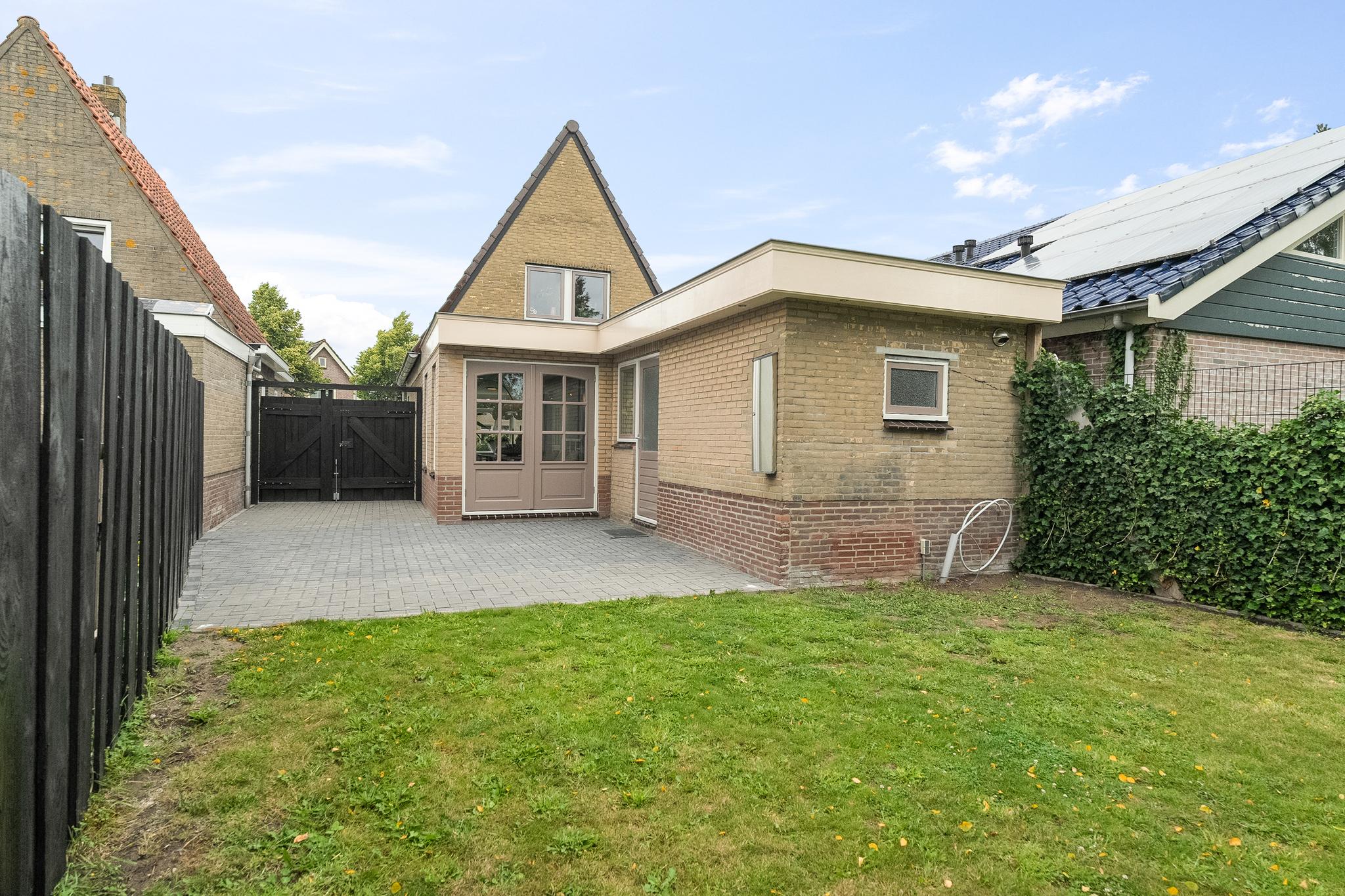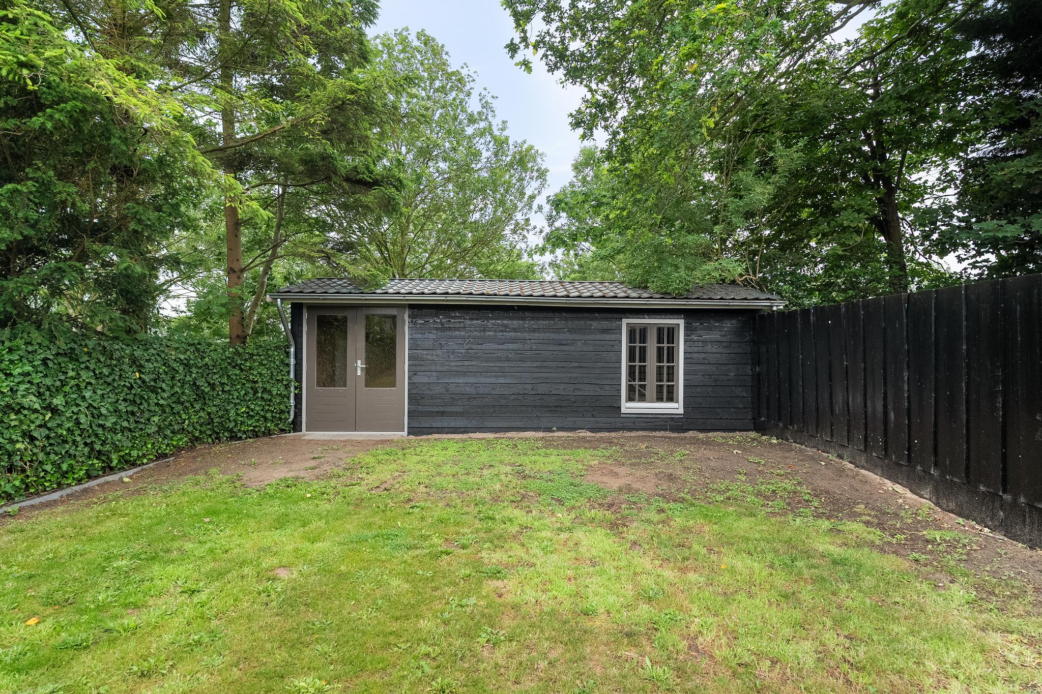 Voortuin met bestrating, oprit en poort naar de achtertuin waar u met een auto doorheen kan. Direct achter de woning is een groot en zonnig terras en verder een zeer diepe tuin van ruim 30 meter met schuttingen, gazon en houten berging aan de achterzijde.