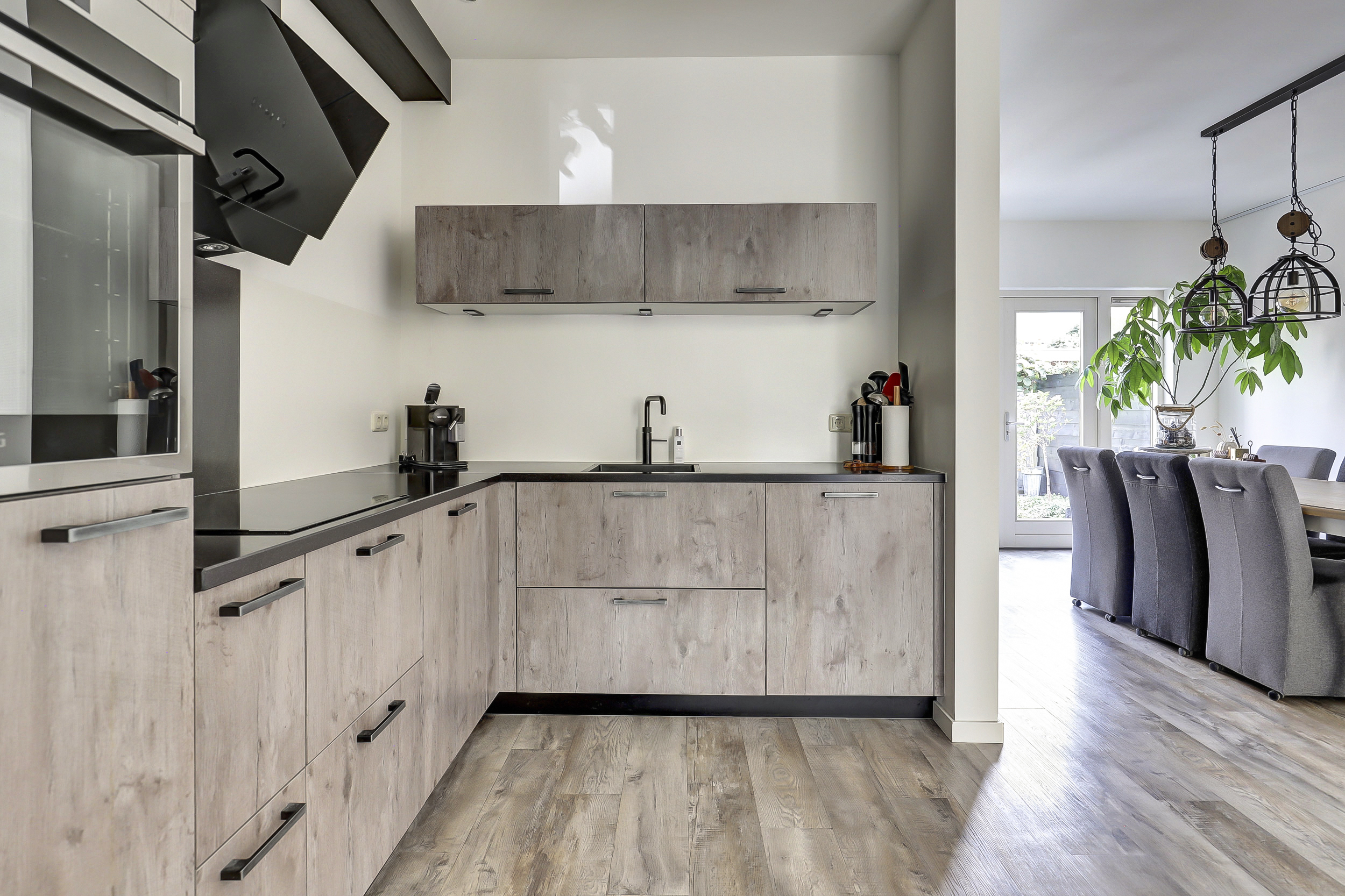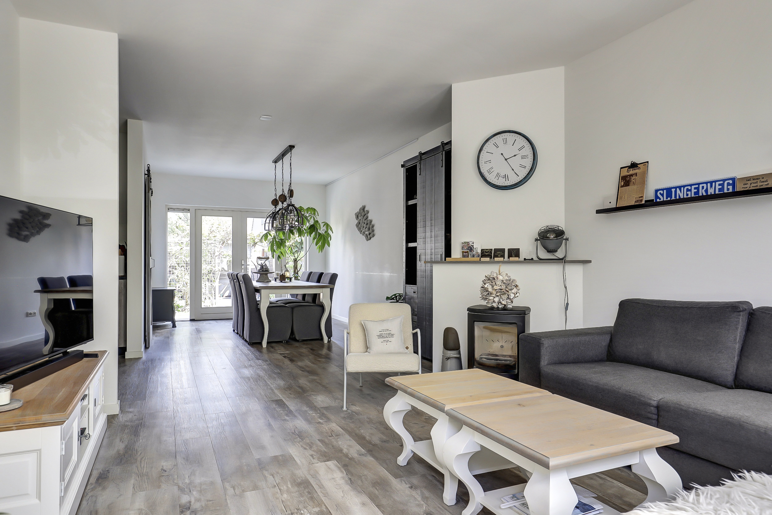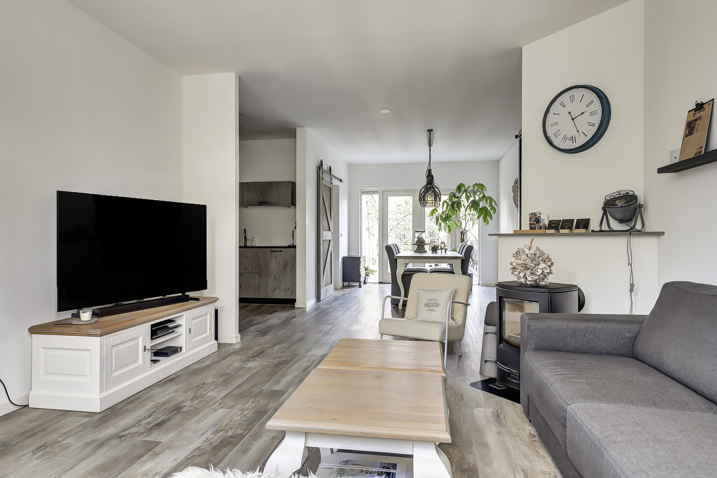 Bij binnenkomst valt direct de verzorgde afwerking op. Vanuit de hal loopt u door naar de lichte woonkamer met een strakke vloer, neutrale wanden en houtkachel. Grote ramen en openslaande deuren naar de tuin maken de ruimte extra licht en ruimtelijk. De keuken is modern uitgevoerd in een L-opstelling en voorzien van diverse inbouwapparatuur, waaronder een oven, kookplaat, afzuigkap, Quooker en vaatwasser. Aan de achterzijde is er een aangebouwde berging met wasmachineaansluiting en toegang tot het toilet.