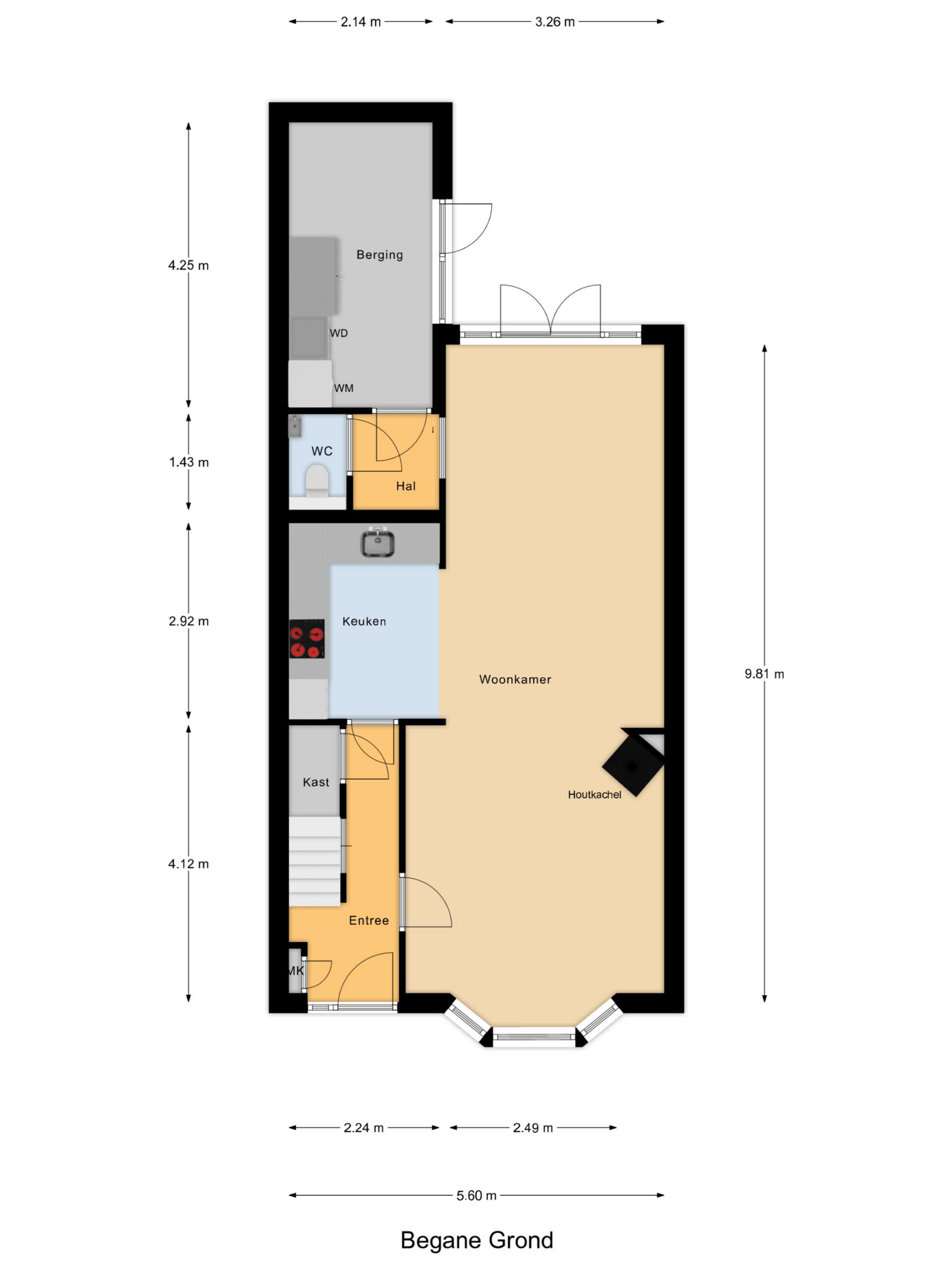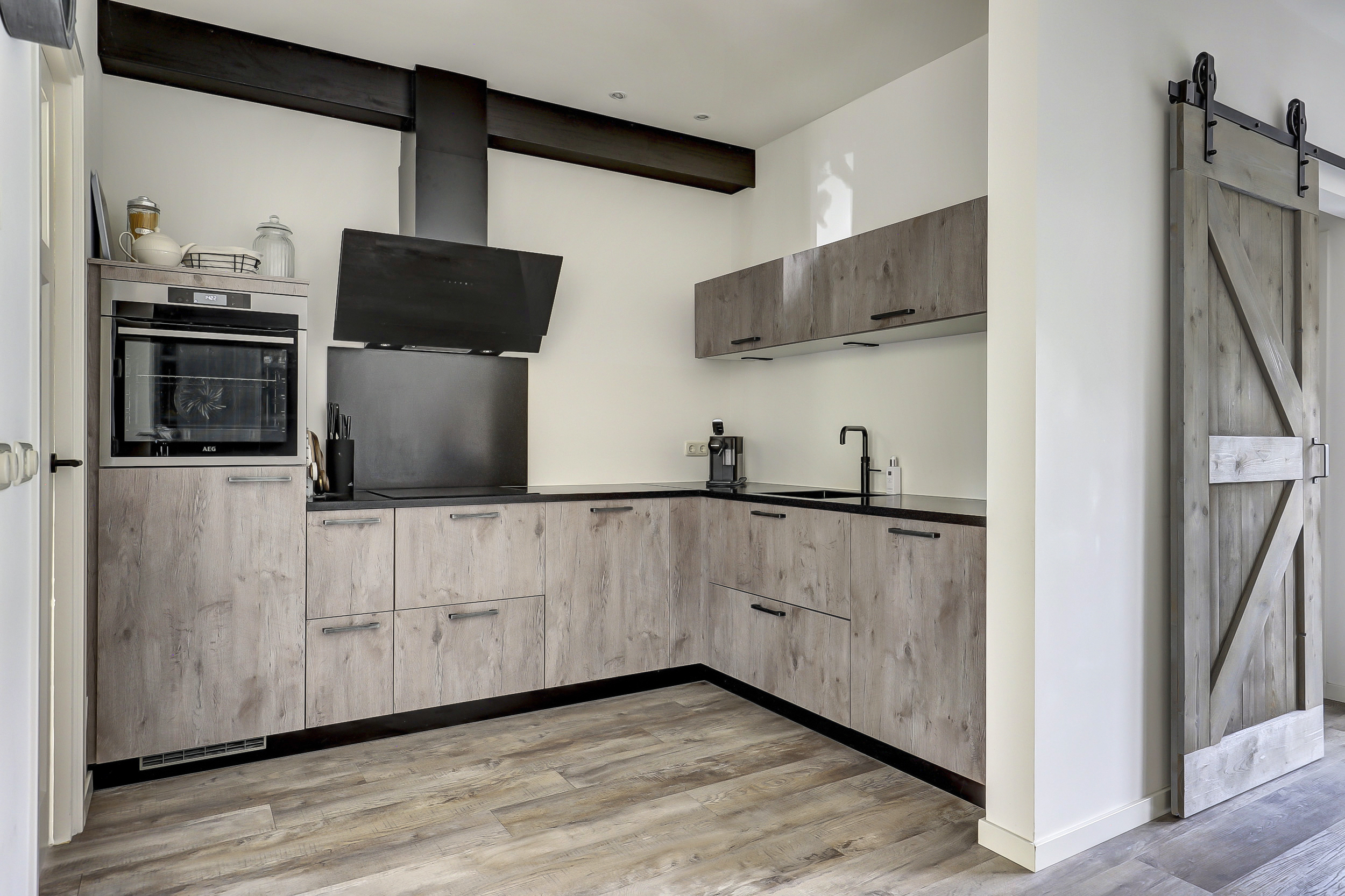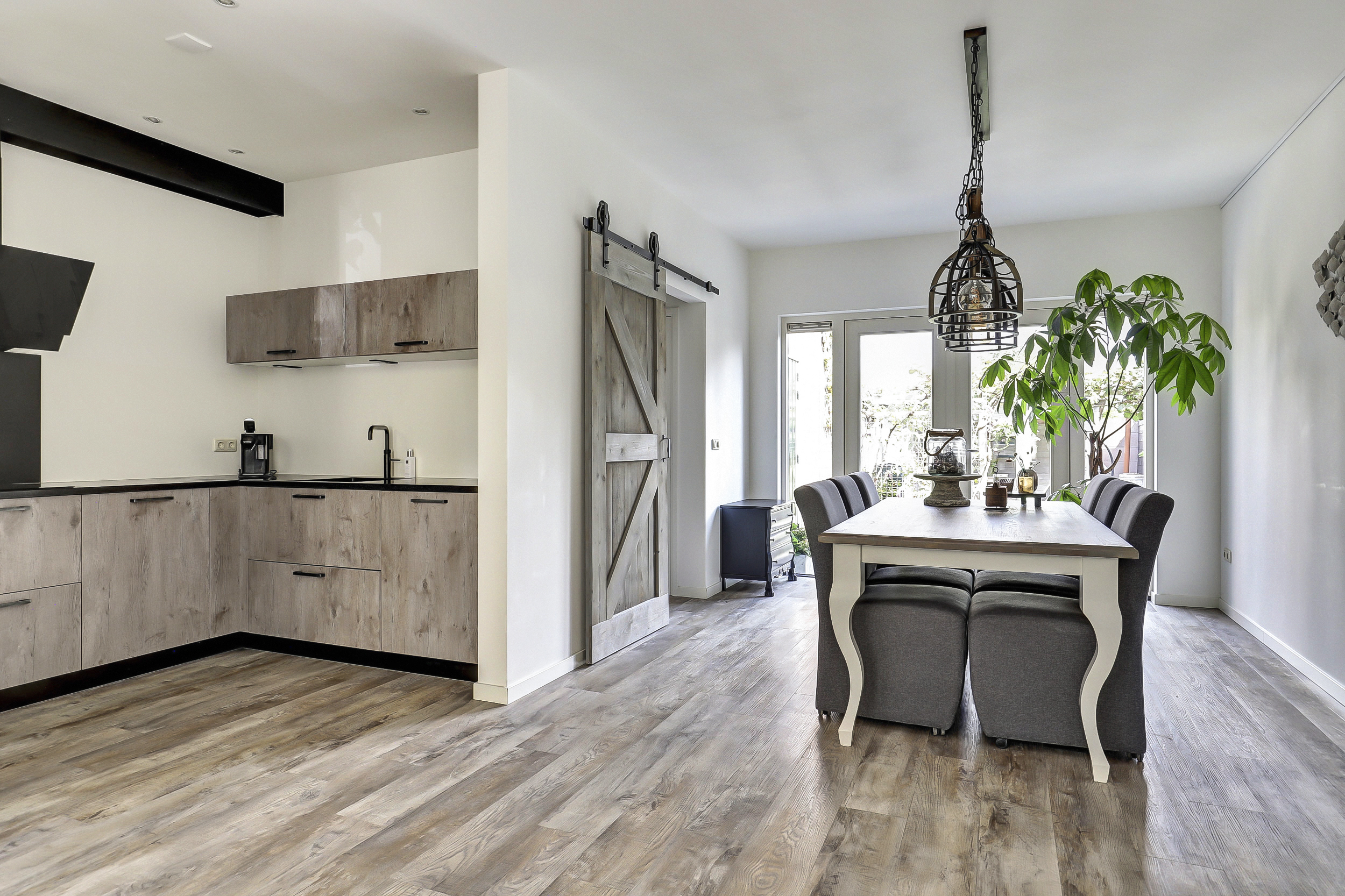 Bij binnenkomst valt direct de verzorgde afwerking op. Vanuit de hal loopt u door naar de lichte woonkamer met een strakke vloer, neutrale wanden en houtkachel. Grote ramen en openslaande deuren naar de tuin maken de ruimte extra licht en ruimtelijk. De keuken is modern uitgevoerd in een L-opstelling en voorzien van diverse inbouwapparatuur, waaronder een oven, kookplaat, afzuigkap, Quooker en vaatwasser. Aan de achterzijde is er een aangebouwde berging met wasmachineaansluiting en toegang tot het toilet.