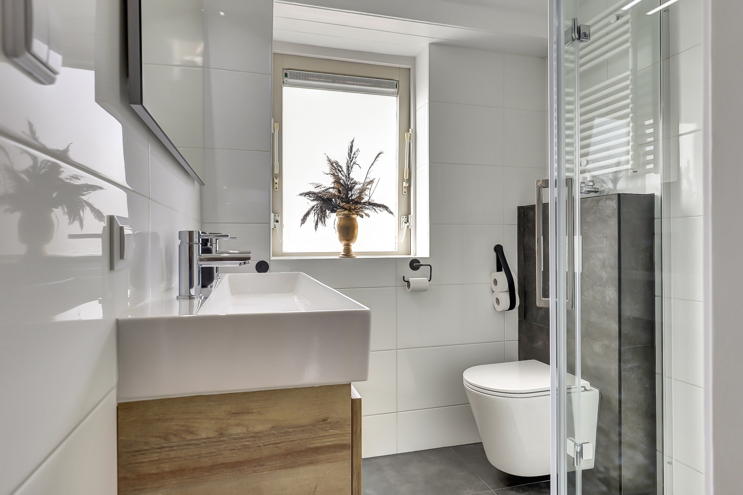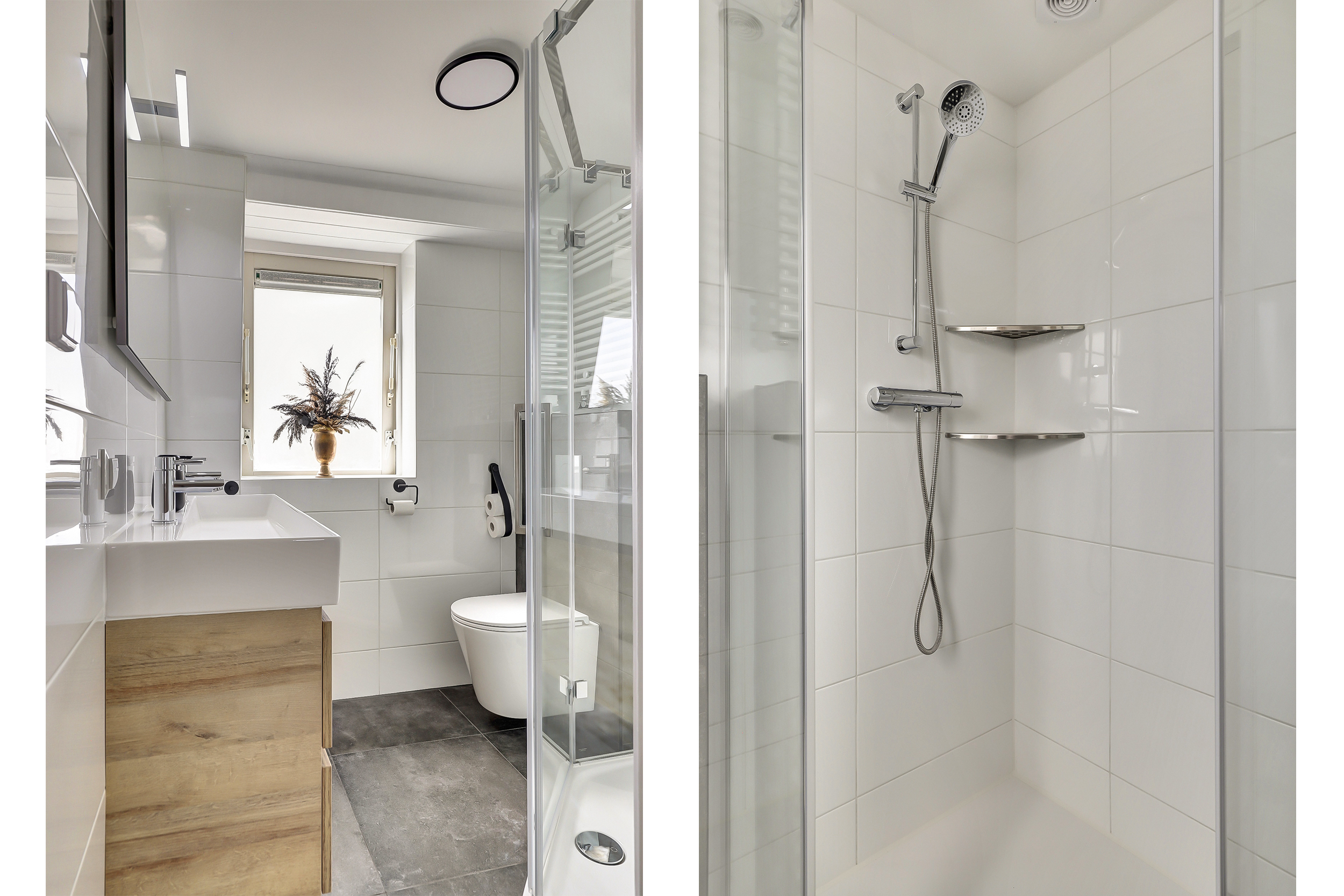 - Badkamervoorzieningen Toilet, Douche, Dubbele wastafel, Wastafelmeubel